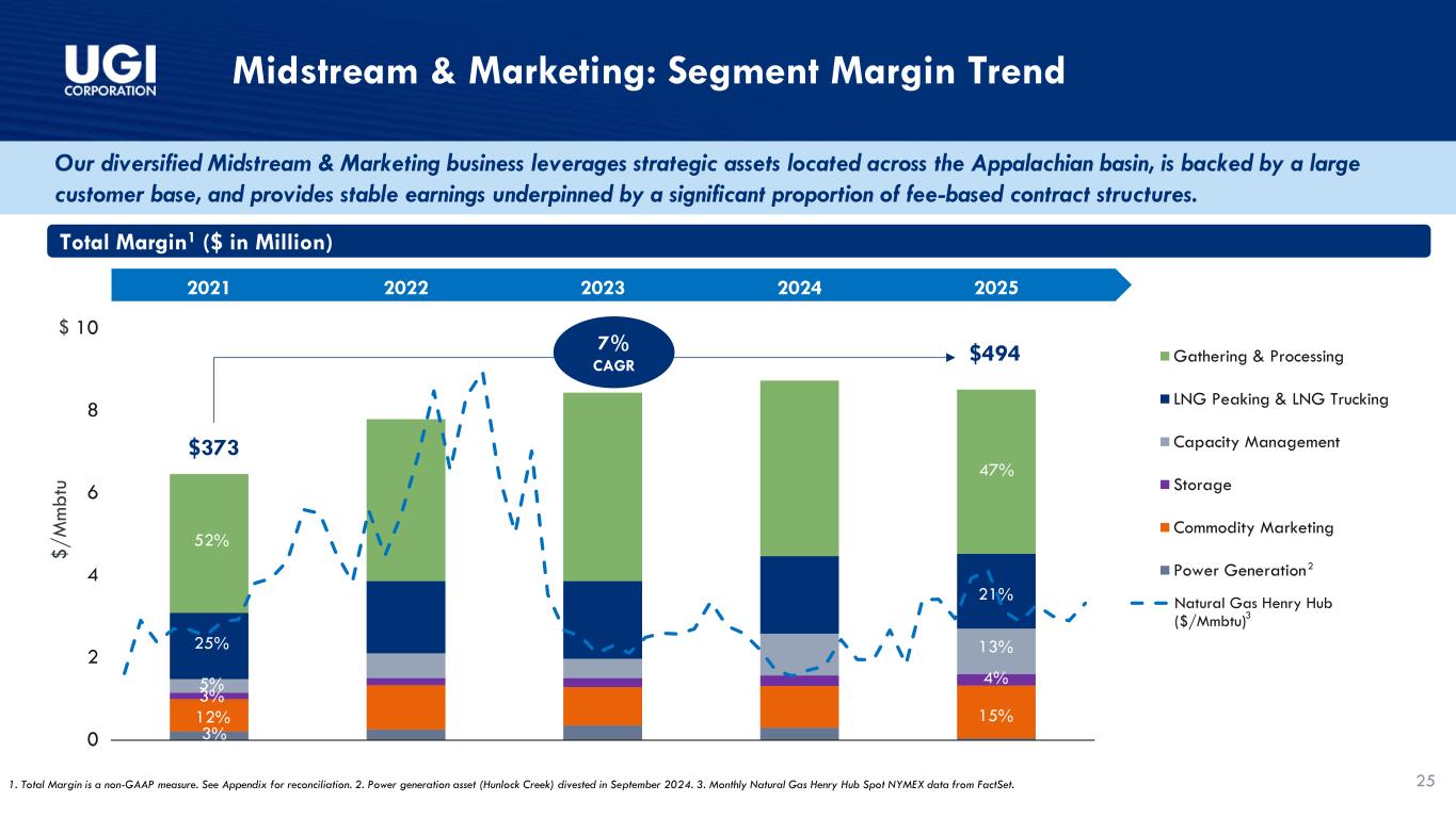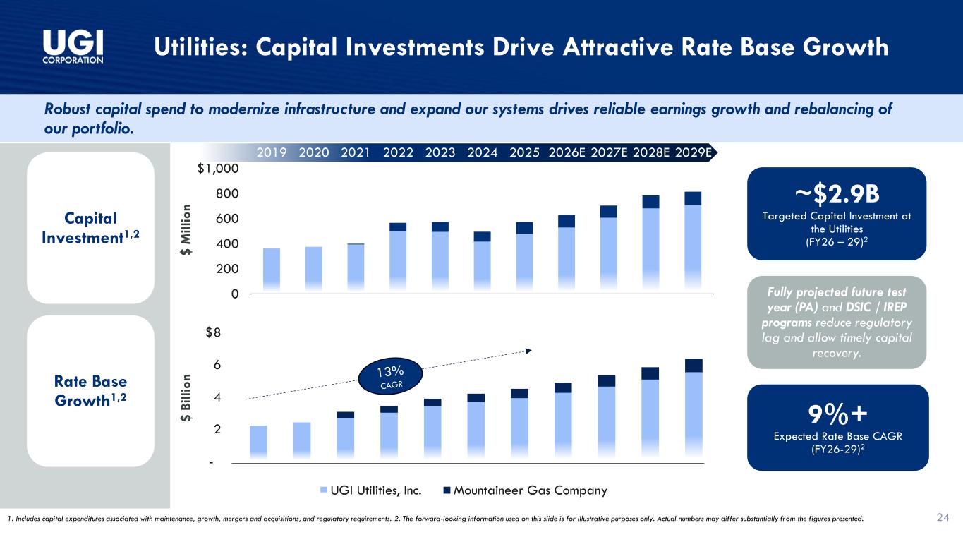 - 2 4 6 8 UGI Utilities, Inc. Mountaineer Gas Company Utilities: Capital Investments Drive Attractive Rate Base Growth 1. Includes capital expenditures associated with maintenance, growth, mergers and acquisitions, and regulatory requirements. 2. The forward-looking information used on this slide is for illustrative purposes only. Actual numbers may differ substantially from the figures presented. Capital Investment1,2 $ M il li o n Robust capital spend to modernize infrastructure and expand our systems drives reliable earnings growth and rebalancing of our portfolio. Rate Base Growth1,2 9%+ Expected Rate Base CAGR (FY26-29)2 ~$2.9B Targeted Capital Investment at the Utilities (FY26 – 29)2 $ Fully projected future test year (PA) and DSIC / IREP programs reduce regulatory lag and allow timely capital recovery. 0 200 400 600 800 1,000 2019 2020 2021 2022 2023 2024 2025 2026E 2027E 2028E 2029E $ B il li o n $ 24