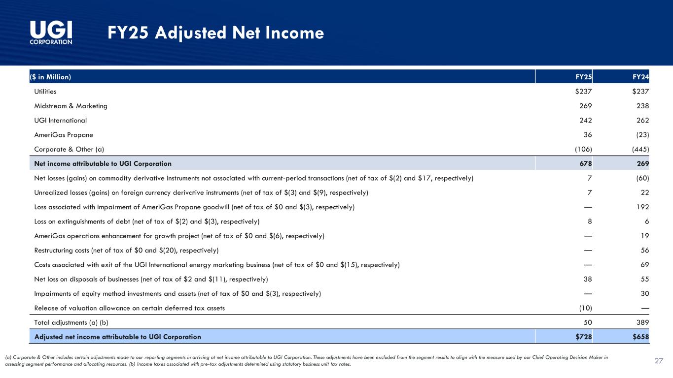 FY25 Adjusted Diluted Earnings per Share (a) Corporate & Other includes certain adjustments made to our reporting segments in arriving at net income attributable to UGI Corporation. These adjustments have been excluded from the segment results to align with the measure used by our Chief Operating Decision Maker in assessing segment performance and allocating resources. 26 FY25 FY24 Utilities $1.08 $1.10 Midstream & Marketing 1.23 1.11 UGI International 1.10 1.22 AmeriGas Propane 0.16 (0.11) Corporate & Other (a) (0.48) (2.07) Earnings per share - diluted 3.09 1.25 Net losses (gains) on commodity derivative instruments not associated with current-period transactions 0.03 (0.28) Unrealized losses (gains) on foreign currency derivative instruments 0.04 0.10 Loss associated with impairment of AmeriGas Propane goodwill — 0.89 Loss on extinguishments of debt 0.04 0.03 AmeriGas operations enhancement for growth project — 0.09 Restructuring costs — 0.26 Costs associated with exit of the UGI International energy marketing business — 0.32 Net loss on disposals of businesses 0.17 0.26 Impairments of equity method investments and assets — 0.14 Release of valuation allowance on certain deferred tax assets (0.05) — Total adjustments (a) 0.23 1.81 Adjusted diluted earnings per share $3.32 $3.06