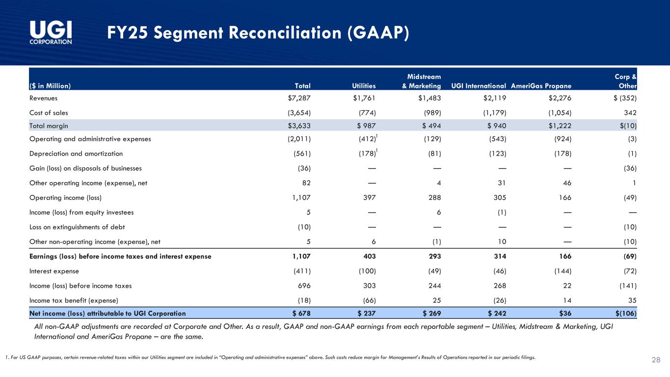 FY25 Adjusted Net Income (a) Corporate & Other includes certain adjustments made to our reporting segments in arriving at net income attributable to UGI Corporation. These adjustments have been excluded from the segment results to align with the measure used by our Chief Operating Decision Maker in assessing segment performance and allocating resources. (b) Income taxes associated with pre-tax adjustments determined using statutory business unit tax rates. 27 ($ in Million) FY25 FY24 Utilities $237 $237 Midstream & Marketing 269 238 UGI International 242 262 AmeriGas Propane 36 (23) Corporate & Other (a) (106) (445) Net income attributable to UGI Corporation 678 269 Net losses (gains) on commodity derivative instruments not associated with current-period transactions (net of tax of $(2) and $17, respectively) 7 (60) Unrealized losses (gains) on foreign currency derivative instruments (net of tax of $(3) and $(9), respectively) 7 22 Loss associated with impairment of AmeriGas Propane goodwill (net of tax of $0 and $(3), respectively) — 192 Loss on extinguishments of debt (net of tax of $(2) and $(3), respectively) 8 6 AmeriGas operations enhancement for growth project (net of tax of $0 and $(6), respectively) — 19 Restructuring costs (net of tax of $0 and $(20), respectively) — 56 Costs associated with exit of the UGI International energy marketing business (net of tax of $0 and $(15), respectively) — 69 Net loss on disposals of businesses (net of tax of $2 and $(11), respectively) 38 55 Impairments of equity method investments and assets (net of tax of $0 and $(3), respectively) — 30 Release of valuation allowance on certain deferred tax assets (10) — Total adjustments (a) (b) 50 389 Adjusted net income attributable to UGI Corporation $728 $658