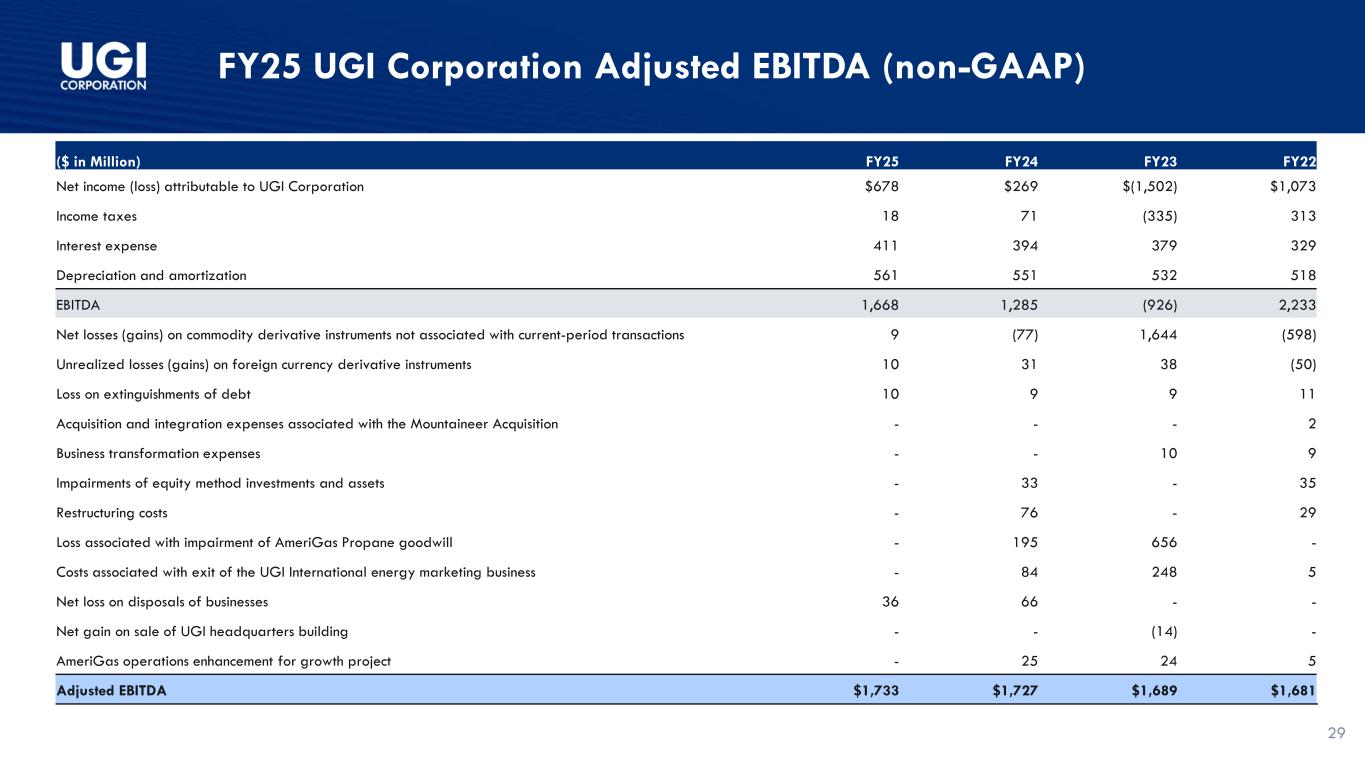 FY25 Segment Reconciliation (GAAP) 1. For US GAAP purposes, certain revenue-related taxes within our Utilities segment are included in “Operating and administrative expenses” above. Such costs reduce margin for Management’s Results of Operations reported in our periodic filings. All non-GAAP adjustments are recorded at Corporate and Other. As a result, GAAP and non-GAAP earnings from each reportable segment – Utilities, Midstream & Marketing, UGI International and AmeriGas Propane – are the same. 1 1 28 ($ in Million) Total Utilities Midstream & Marketing UGI International AmeriGas Propane Corp & Other Revenues $7,287 $1,761 $1,483 $2,119 $2,276 $ (352) Cost of sales (3,654) (774) (989) (1,179) (1,054) 342 Total margin $3,633 $ 987 $ 494 $ 940 $1,222 $(10) Operating and administrative expenses (2,011) (412) (129) (543) (924) (3) Depreciation and amortization (561) (178) (81) (123) (178) (1) Gain (loss) on disposals of businesses (36) — — — — (36) Other operating income (expense), net 82 — 4 31 46 1 Operating income (loss) 1,107 397 288 305 166 (49) Income (loss) from equity investees 5 — 6 (1) — — Loss on extinguishments of debt (10) — — — — (10) Other non-operating income (expense), net 5 6 (1) 10 — (10) Earnings (loss) before income taxes and interest expense 1,107 403 293 314 166 (69) Interest expense (411) (100) (49) (46) (144) (72) Income (loss) before income taxes 696 303 244 268 22 (141) Income tax benefit (expense) (18) (66) 25 (26) 14 35 Net income (loss) attributable to UGI Corporation $ 678 $ 237 $ 269 $ 242 $36 $(106)