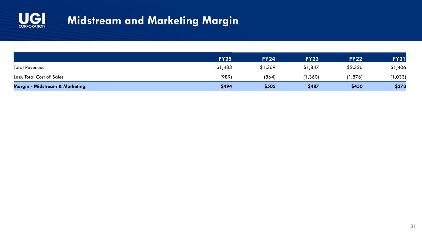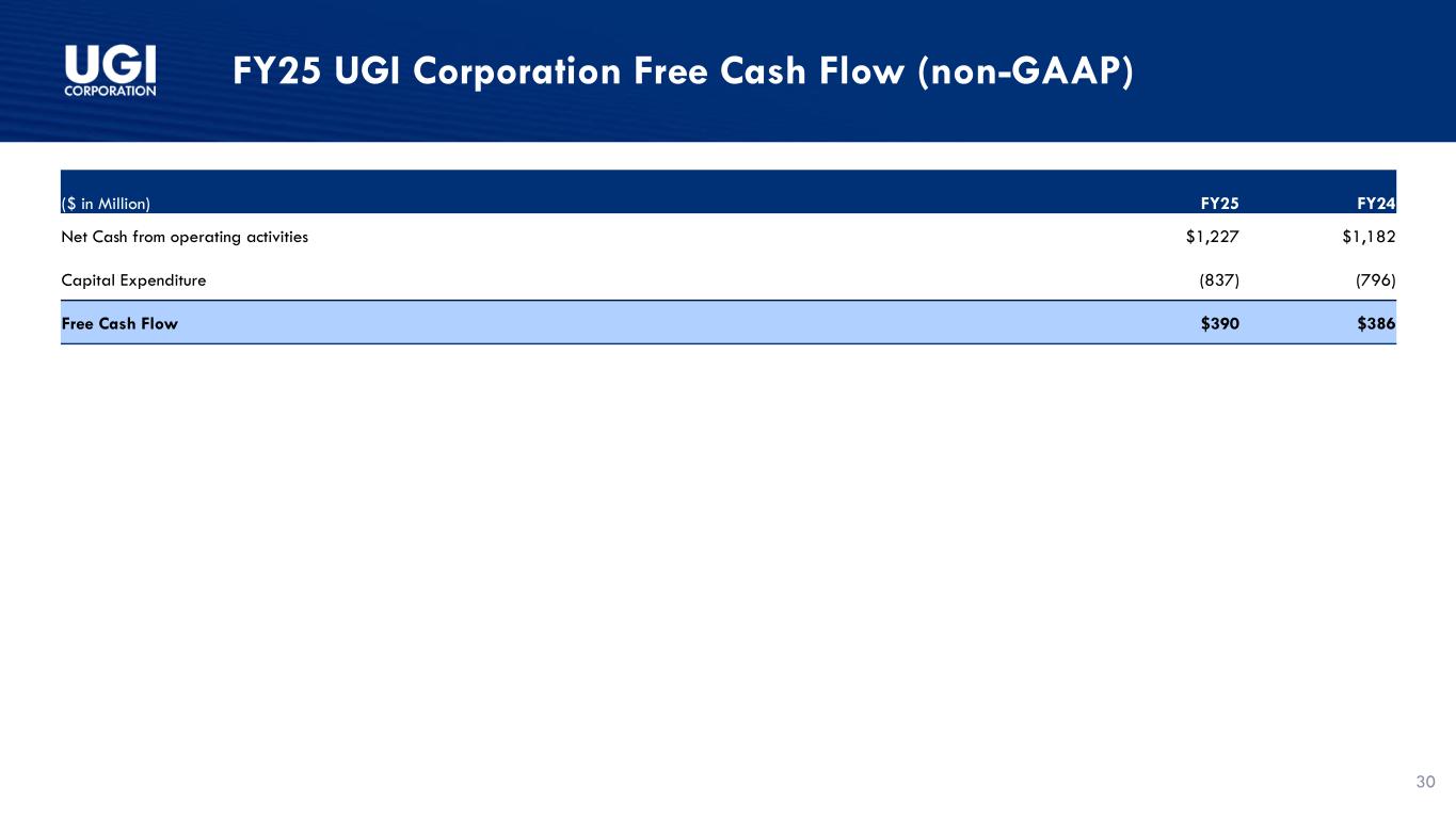 FY25 UGI Corporation Free Cash Flow (non-GAAP) ($ in Million) FY25 FY24 Net Cash from operating activities $1,227 $1,182 Capital Expenditure (837) (796) Free Cash Flow $390 $386 30