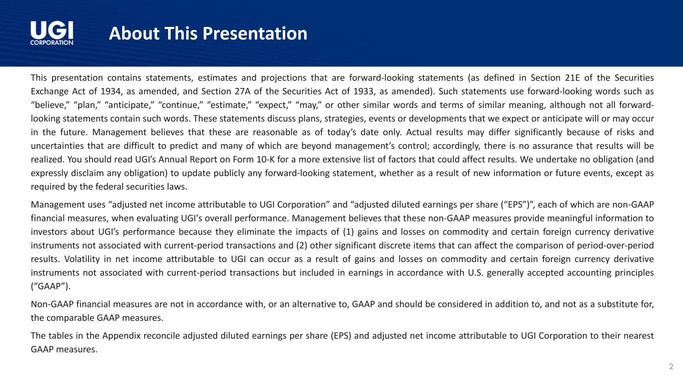 About This Presentation This presentation contains statements, estimates and projections that are forward-looking statements (as defined in Section 21E of the Securities Exchange Act of 1934, as amended, and Section 27A of the Securities Act of 1933, as amended). Such statements use forward-looking words such as “believe,” “plan,” “anticipate,” “continue,” “estimate,” “expect,” “may,” or other similar words and terms of similar meaning, although not all forward- looking statements contain such words. These statements discuss plans, strategies, events or developments that we expect or anticipate will or may occur in the future. Management believes that these are reasonable as of today’s date only. Actual results may differ significantly because of risks and uncertainties that are difficult to predict and many of which are beyond management’s control; accordingly, there is no assurance that results will be realized. You should read UGI’s Annual Report on Form 10-K for a more extensive list of factors that could affect results. We undertake no obligation (and expressly disclaim any obligation) to update publicly any forward-looking statement, whether as a result of new information or future events, except as required by the federal securities laws. Management uses “adjusted net income attributable to UGI Corporation” and “adjusted diluted earnings per share (“EPS”)”, each of which are non-GAAP financial measures, when evaluating UGI's overall performance. Management believes that these non-GAAP measures provide meaningful information to investors about UGI’s performance because they eliminate the impacts of (1) gains and losses on commodity and certain foreign currency derivative instruments not associated with current-period transactions and (2) other significant discrete items that can affect the comparison of period-over-period results. Volatility in net income attributable to UGI can occur as a result of gains and losses on commodity and certain foreign currency derivative instruments not associated with current-period transactions but included in earnings in accordance with U.S. generally accepted accounting principles (“GAAP”). Non-GAAP financial measures are not in accordance with, or an alternative to, GAAP and should be considered in addition to, and not as a substitute for, the comparable GAAP measures. The tables in the Appendix reconcile adjusted diluted earnings per share (EPS) and adjusted net income attributable to UGI Corporation to their nearest GAAP measures. 2
