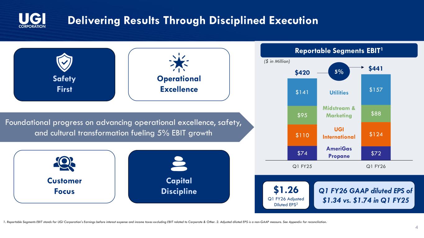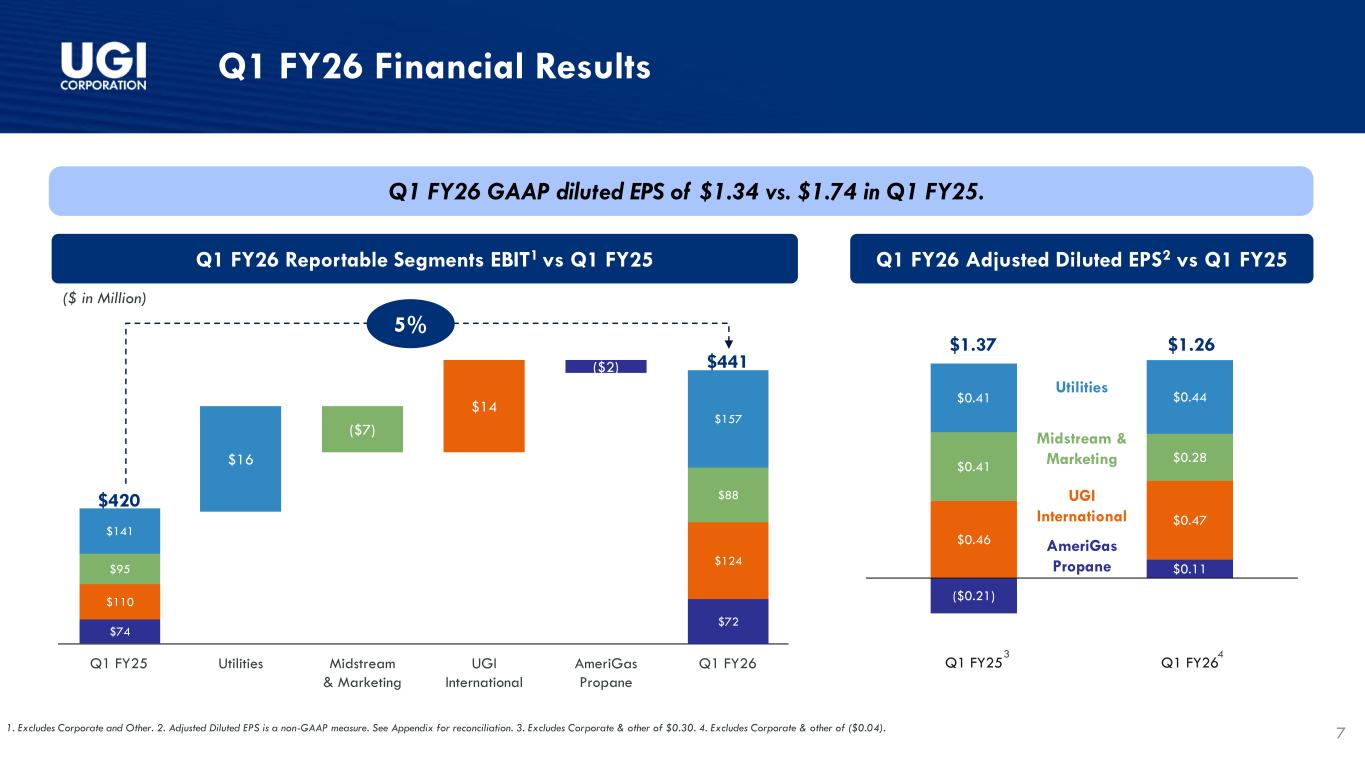 Q1 FY26 Financial Results Q1 FY26 GAAP diluted EPS of $1.34 vs. $1.74 in Q1 FY25. 1. Excludes Corporate and Other. 2. Adjusted Diluted EPS is a non-GAAP measure. See Appendix for reconciliation. 3. Excludes Corporate & other of $0.30. 4. Excludes Corporate & other of ($0.04). Q1 FY26 Reportable Segments EBIT1 vs Q1 FY25 $420 $16 ($7) $14 ($2) $441 Q1 FY25 Utilities Midstream & Marketing UGI International AmeriGas Propane Q1 FY26 $74 $110 $95 $141 $72 $124 $88 $157 Q1 FY26 Adjusted Diluted EPS2 vs Q1 FY25 ($ in Million) ($0.21) $0.11 $0.46 $0.47 $0.41 $0.28 $0.41 $0.44 Q1 FY25 Q1 FY26 Utilities Midstream & Marketing UGI International AmeriGas Propane $1.37 $1.26 7 5% 3 4