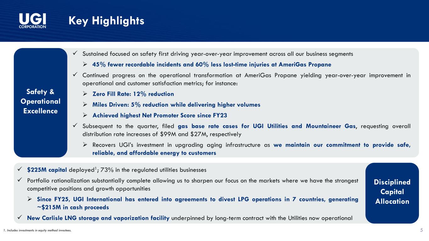 $74 $72 $110 $124 $95 $88 $141 $157 $420 $441 Q1 FY25 Q1 FY26 Delivering Results Through Disciplined Execution 1. Reportable Segments EBIT stands for UGI Corporation’s Earnings before interest expense and income taxes excluding EBIT related to Corporate & Other. 2. Adjusted diluted EPS is a non-GAAP measure. See Appendix for reconciliation. 4 Reportable Segments EBIT1 Utilities Midstream & Marketing UGI International AmeriGas Propane 5% Operational Excellence Capital Discipline Safety First Customer Focus Foundational progress on advancing operational excellence, safety, and cultural transformation fueling 5% EBIT growth Q1 FY26 GAAP diluted EPS of $1.34 vs. $1.74 in Q1 FY25 $1.26 Q1 FY26 Adjusted Diluted EPS2 ($ in Million)