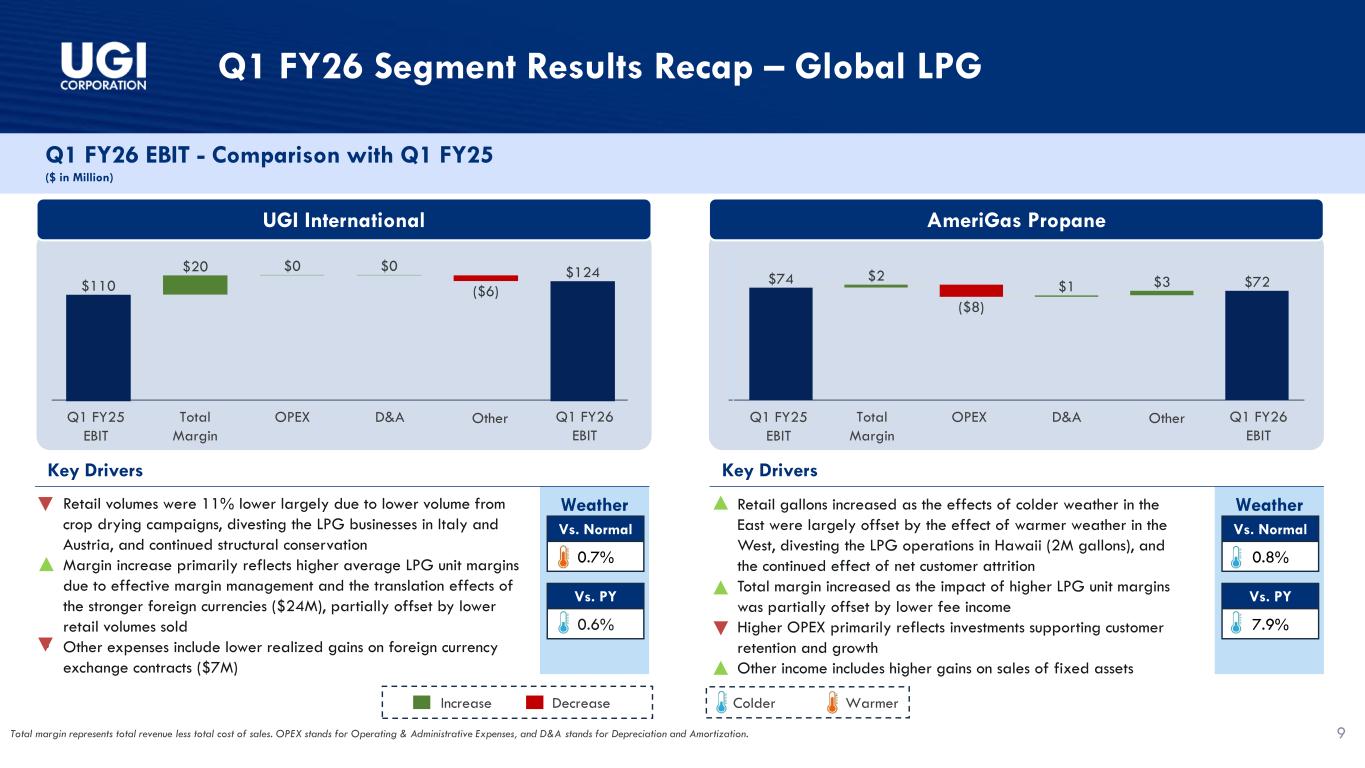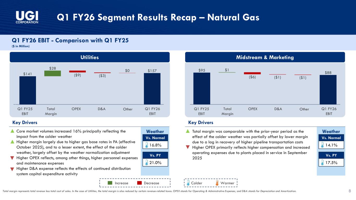 Q1 FY26 Segment Results Recap – Global LPG Q1 FY26 EBIT - Comparison with Q1 FY25 ($ in Million) UGI International AmeriGas Propane Weather Key Drivers • Retail volumes were 11% lower largely due to lower volume from crop drying campaigns, divesting the LPG businesses in Italy and Austria, and continued structural conservation • Margin increase primarily reflects higher average LPG unit margins due to effective margin management and the translation effects of the stronger foreign currencies ($24M), partially offset by lower retail volumes sold • Other expenses include lower realized gains on foreign currency exchange contracts ($7M) Increase Decrease WarmerColder Weather Key Drivers • Retail gallons increased as the effects of colder weather in the East were largely offset by the effect of warmer weather in the West, divesting the LPG operations in Hawaii (2M gallons), and the continued effect of net customer attrition • Total margin increased as the impact of higher LPG unit margins was partially offset by lower fee income • Higher OPEX primarily reflects investments supporting customer retention and growth • Other income includes higher gains on sales of fixed assets 0.7% 0.6% Vs. Normal Vs. PY 0.8% 7.9% Vs. Normal Vs. PY Q1 FY25 EBIT Q1 FY26 EBIT Total Margin OPEX D&A Other Q1 FY25 EBIT Q1 FY26 EBIT Total Margin OPEX D&A Other Total margin represents total revenue less total cost of sales. OPEX stands for Operating & Administrative Expenses, and D&A stands for Depreciation and Amortization. $110 $20 $0 $0 ($6) $124 $74 $2 ($8) $1 $3 $72 9