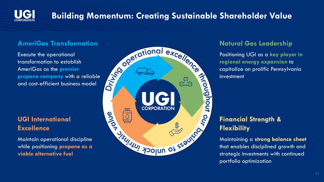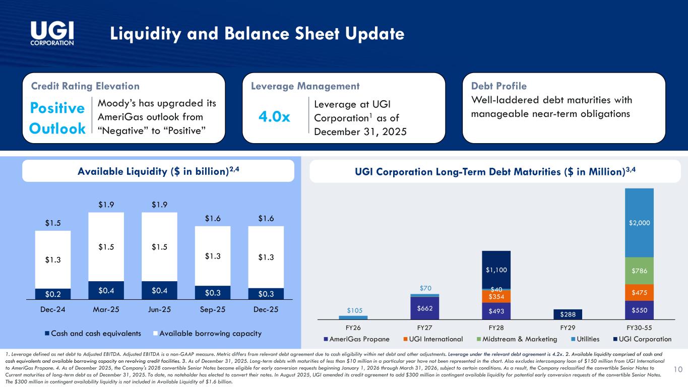 Liquidity and Balance Sheet Update 1. Leverage defined as net debt to Adjusted EBITDA. Adjusted EBITDA is a non-GAAP measure. Metric differs from relevant debt agreement due to cash eligibility within net debt and other adjustments. Leverage under the relevant debt agreement is 4.2x. 2. Available liquidity comprised of cash and cash equivalents and available borrowing capacity on revolving credit facilities. 3. As of December 31, 2025. Long-term debts with maturities of less than $10 million in a particular year have not been represented in the chart. Also excludes intercompany loan of $150 million from UGI International to AmeriGas Propane. 4. As of December 2025, the Company's 2028 convertible Senior Notes became eligible for early conversion requests beginning January 1, 2026 through March 31, 2026, subject to certain conditions. As a result, the Company reclassified the convertible Senior Notes to Current maturities of long-term debt as of December 31, 2025. To date, no noteholder has elected to convert their notes. In August 2025, UGI amended its credit agreement to add $300 million in contingent available liquidity for potential early conversion requests of the convertible Senior Notes. The $300 million in contingent availability liquidity is not included in Available Liquidity of $1.6 billion. UGI Corporation Long-Term Debt Maturities ($ in Million)3,4Available Liquidity ($ in billion)2,4 Credit Rating Elevation Leverage Management Debt Profile Well-laddered debt maturities with manageable near-term obligations Moody’s has upgraded its AmeriGas outlook from “Negative” to “Positive” Leverage at UGI Corporation1 as of December 31, 2025 Positive Outlook 4.0x 10 $0.2 $0.4 $0.4 $0.3 $0.3 $1.3 $1.5 $1.5 $1.3 $1.3 $1.5 $1.9 $1.9 $1.6 $1.6 Dec-24 Mar-25 Jun-25 Sep-25 Dec-25 Cash and cash equivalents Available borrowing capacity $662 $493 $550 $354 $475 $786 $105 $70 $40 $2,000 $1,100 $288 FY26 FY27 FY28 FY29 FY30-55 AmeriGas Propane UGI International Midstream & Marketing Utilities UGI Corporation