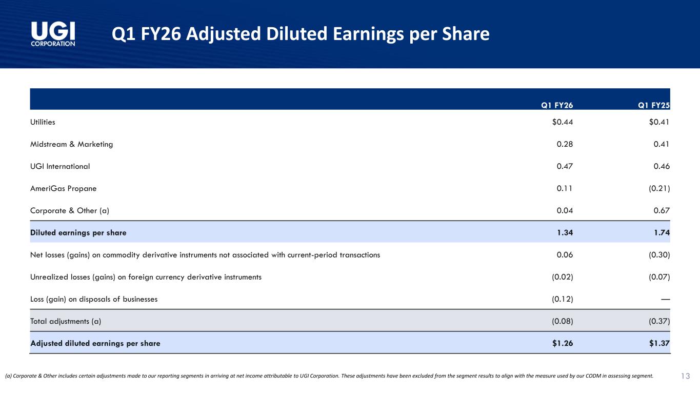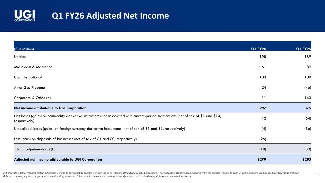 Q1 FY26 Adjusted Diluted Earnings per Share (a) Corporate & Other includes certain adjustments made to our reporting segments in arriving at net income attributable to UGI Corporation. These adjustments have been excluded from the segment results to align with the measure used by our CODM in assessing segment. Q1 FY26 Q1 FY25 Utilities $0.44 $0.41 Midstream & Marketing 0.28 0.41 UGI International 0.47 0.46 AmeriGas Propane 0.11 (0.21) Corporate & Other (a) 0.04 0.67 Diluted earnings per share 1.34 1.74 Net losses (gains) on commodity derivative instruments not associated with current-period transactions 0.06 (0.30) Unrealized losses (gains) on foreign currency derivative instruments (0.02) (0.07) Loss (gain) on disposals of businesses (0.12) — Total adjustments (a) (0.08) (0.37) Adjusted diluted earnings per share $1.26 $1.37 13