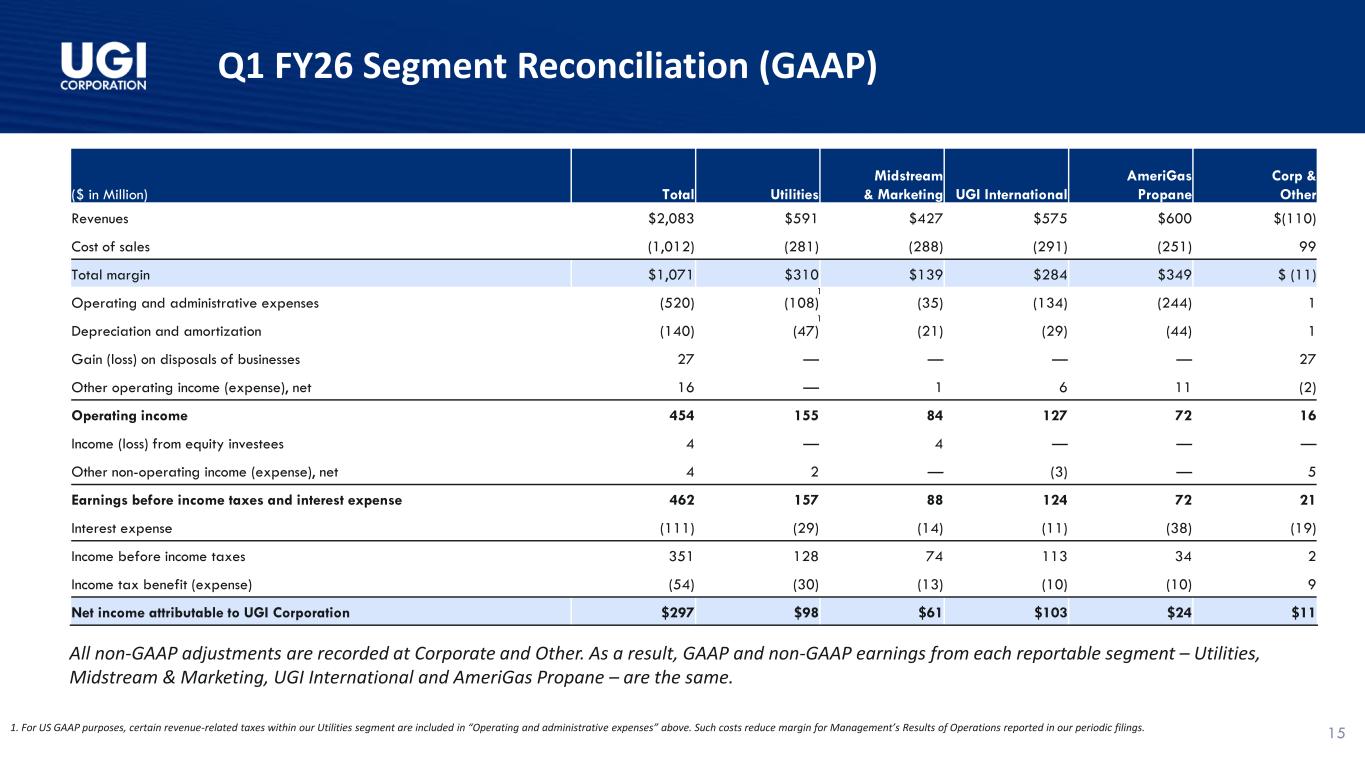 Q1 FY26 Adjusted Net Income (a) Corporate & Other includes certain adjustments made to our reporting segments in arriving at net income attributable to UGI Corporation. These adjustments have been excluded from the segment results to align with the measure used by our Chief Operating Decision Maker in assessing segment performance and allocating resources. (b) Income taxes associated with pre-tax adjustments determined using statutory business unit tax rates. ($ in Million) Q1 FY26 Q1 FY25 Utilities $98 $89 Midstream & Marketing 61 89 UGI International 103 100 AmeriGas Propane 24 (46) Corporate & Other (a) 11 143 Net income attributable to UGI Corporation 297 375 Net losses (gains) on commodity derivative instruments not associated with current-period transactions (net of tax of $1 and $14, respectively) 12 (64) Unrealized losses (gains) on foreign currency derivative instruments (net of tax of $1 and $6, respectively) (4) (16) Loss (gain) on disposals of businesses (net of tax of $1 and $0, respectively) (26) — Total adjustments (a) (b) (18) (80) Adjusted net income attributable to UGI Corporation $279 $295 14