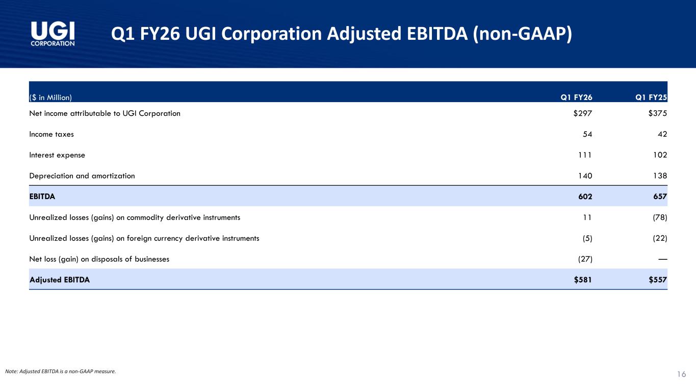 ($ in Million) Total Utilities Midstream & Marketing UGI International AmeriGas Propane Corp & Other Revenues $2,083 $591 $427 $575 $600 $(110) Cost of sales (1,012) (281) (288) (291) (251) 99 Total margin $1,071 $310 $139 $284 $349 $ (11) Operating and administrative expenses (520) (108) (35) (134) (244) 1 Depreciation and amortization (140) (47) (21) (29) (44) 1 Gain (loss) on disposals of businesses 27 — — — — 27 Other operating income (expense), net 16 — 1 6 11 (2) Operating income 454 155 84 127 72 16 Income (loss) from equity investees 4 — 4 — — — Other non-operating income (expense), net 4 2 — (3) — 5 Earnings before income taxes and interest expense 462 157 88 124 72 21 Interest expense (111) (29) (14) (11) (38) (19) Income before income taxes 351 128 74 113 34 2 Income tax benefit (expense) (54) (30) (13) (10) (10) 9 Net income attributable to UGI Corporation $297 $98 $61 $103 $24 $11 Q1 FY26 Segment Reconciliation (GAAP) 1. For US GAAP purposes, certain revenue-related taxes within our Utilities segment are included in “Operating and administrative expenses” above. Such costs reduce margin for Management’s Results of Operations reported in our periodic filings. 1 1 All non-GAAP adjustments are recorded at Corporate and Other. As a result, GAAP and non-GAAP earnings from each reportable segment – Utilities, Midstream & Marketing, UGI International and AmeriGas Propane – are the same. 15