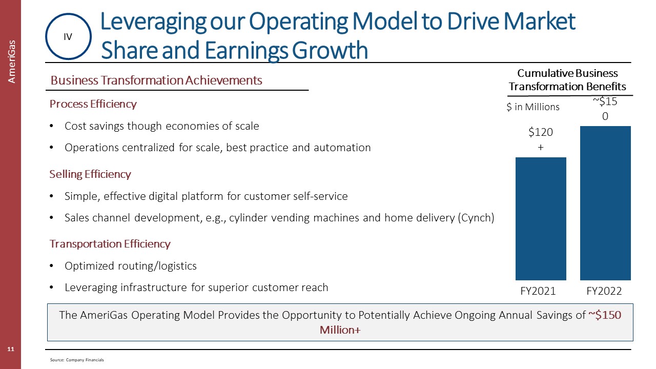 Leveraging our Operating Model to Drive Market Share and Earnings Growth  IV   FY2021 FY2022  Cumulative Business Transformation Benefits  $ in Millions  Process Efficiency   Cost savings though economies of scale  Operations centralized for scale, best practice and automation  Selling Efficiency   Simple, effective digital platform for customer self-service  Sales channel development, e.g., cylinder vending machines and home delivery (Cynch)  Transportation Efficiency  Optimized routing/logistics  Leveraging infrastructure for superior customer reach  The AmeriGas Operating Model Provides the Opportunity to Potentially Achieve Ongoing Annual Savings of ~$150 Million+  Business Transformation Achievements  Source: Company Financials