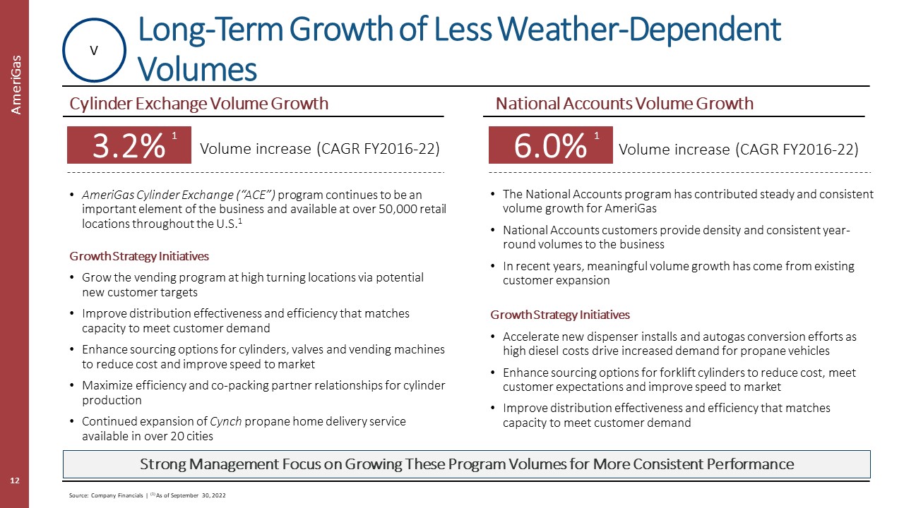 Long-Term Growth of Less Weather-Dependent Volumes  V  AmeriGas Cylinder Exchange (“ACE”) program continues to be an important element of the business and available at over 50,000 retail locations throughout the U.S.1  Growth Strategy Initiatives  Grow the vending program at high turning locations via potential new customer targets  Improve distribution effectiveness and efficiency that matches capacity to meet customer demand  Enhance sourcing options for cylinders, valves and vending machines to reduce cost and improve speed to market  Maximize efficiency and co-packing partner relationships for cylinder production  Continued expansion of Cynch propane home delivery service available in over 20 cities  The National Accounts program has contributed steady and consistent volume growth for AmeriGas  National Accounts customers provide density and consistent year-round volumes to the business  In recent years, meaningful volume growth has come from existing customer expansion  Growth Strategy Initiatives  Accelerate new dispenser installs and autogas conversion efforts as high diesel costs drive increased demand for propane vehicles  Enhance sourcing options for forklift cylinders to reduce cost, meet customer expectations and improve speed to market  Improve distribution effectiveness and efficiency that matches capacity to meet customer demand  Strong Management Focus on Growing These Program Volumes for More Consistent Performance  Cylinder Exchange Volume Growth  National Accounts Volume Growth  3.2%  Source: Company Financials | (1) As of September 30, 2022  6.0%  Volume increase (CAGR FY2016-22)  Volume increase (CAGR FY2016-22)  1  1