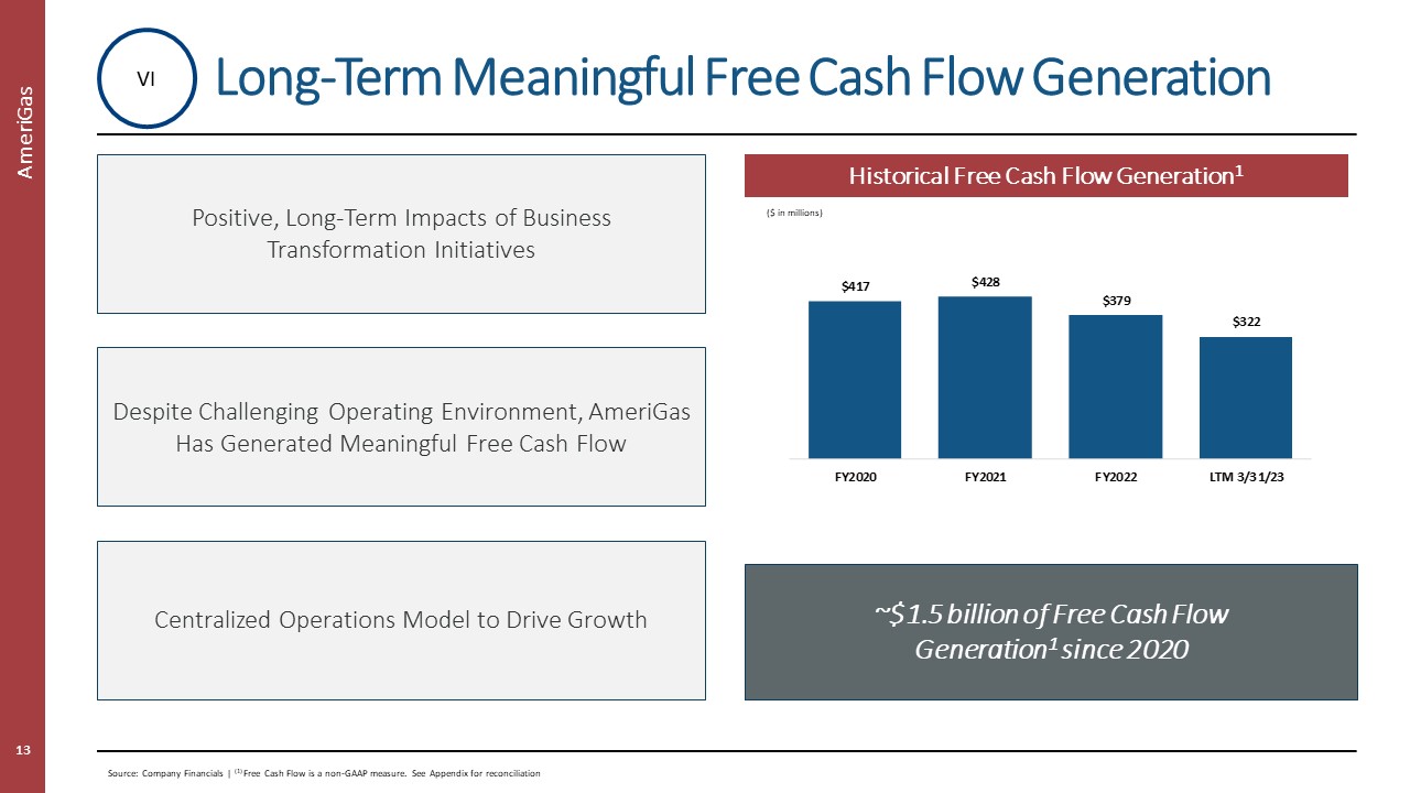 Long-Term Meaningful Free Cash Flow Generation  VI  Source: Company Financials | (1) Free Cash Flow is a non-GAAP measure. See Appendix for reconciliation  Historical Free Cash Flow Generation1  Positive, Long-Term Impacts of Business Transformation Initiatives   Despite Challenging Operating Environment, AmeriGas Has Generated Meaningful Free Cash Flow  Centralized Operations Model to Drive Growth  ~$1.5 billion of Free Cash Flow Generation1 since 2020  ($ in millions)