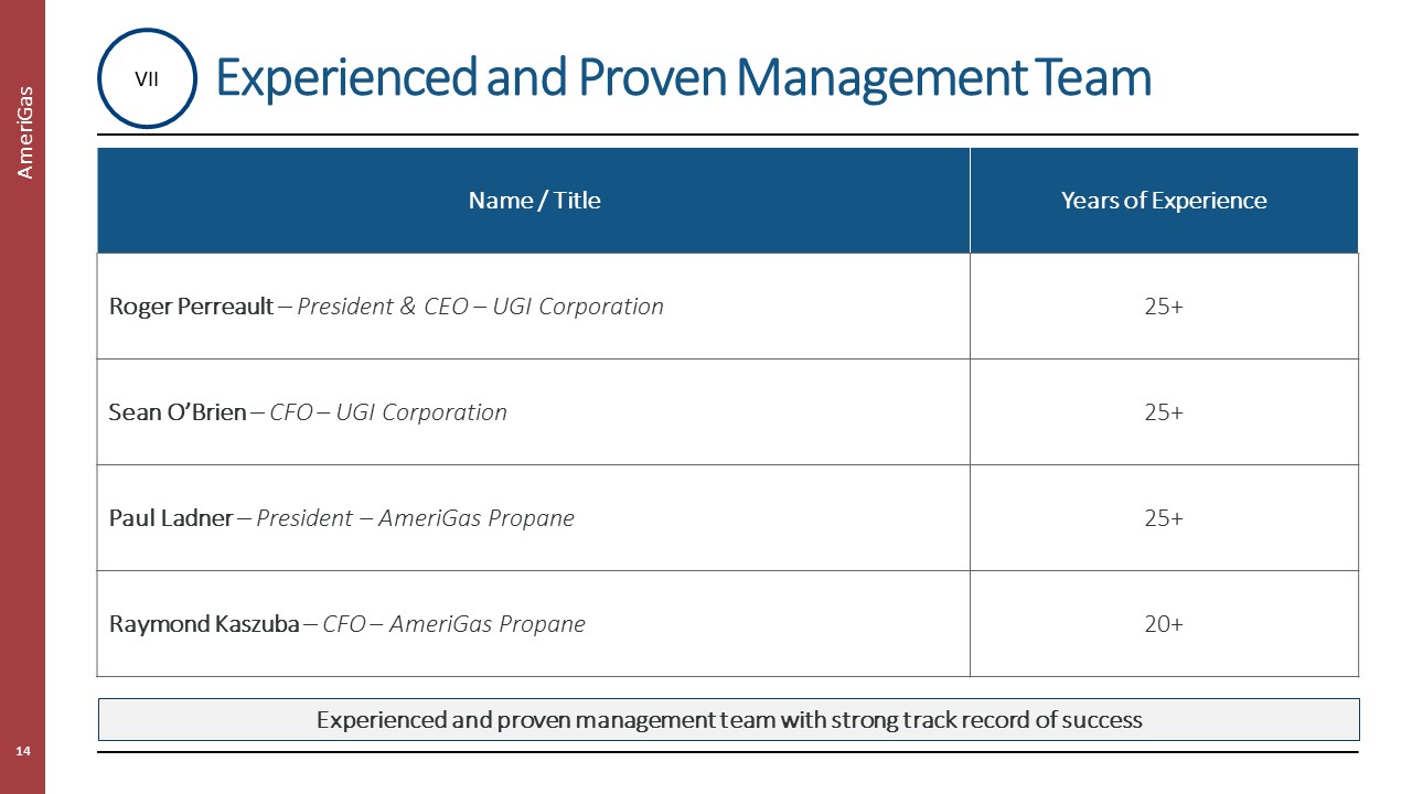 Experienced and Proven Management Team  VII  Name / Title  Years of Experience  Roger Perreault – President & CEO – UGI Corporation  25+  Sean O’Brien – CFO – UGI Corporation  25+  Paul Ladner – President – AmeriGas Propane  25+  Raymond Kaszuba – CFO – AmeriGas Propane  20+  Experienced and proven management team with strong track record of success