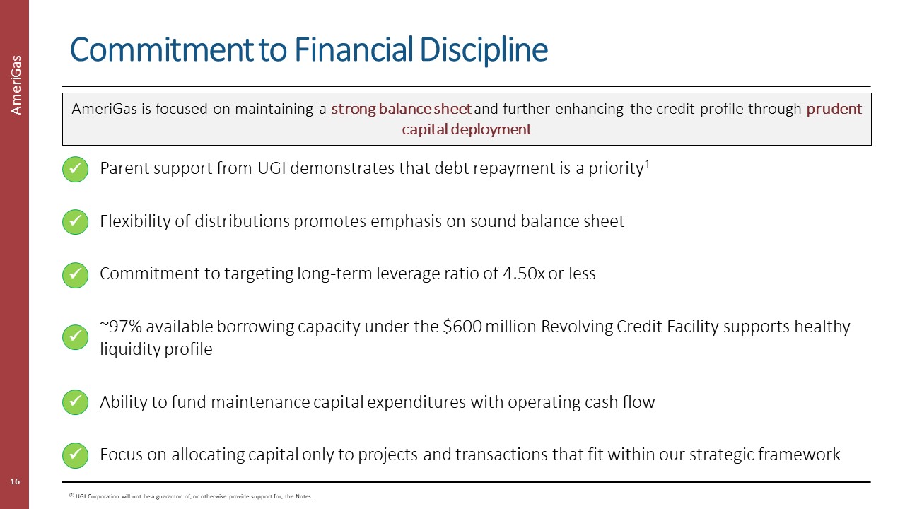 Commitment to Financial Discipline  Parent support from UGI demonstrates that debt repayment is a priority1  Flexibility of distributions promotes emphasis on sound balance sheet  Commitment to targeting long-term leverage ratio of 4.50x or less  ~97% available borrowing capacity under the $600 million Revolving Credit Facility supports healthy liquidity profile  Ability to fund maintenance capital expenditures with operating cash flow  Focus on allocating capital only to projects and transactions that fit within our strategic framework  AmeriGas is focused on maintaining a strong balance sheet and further enhancing the credit profile through prudent capital deployment              (1) UGI Corporation will not be a guarantor of, or otherwise provide support for, the Notes.