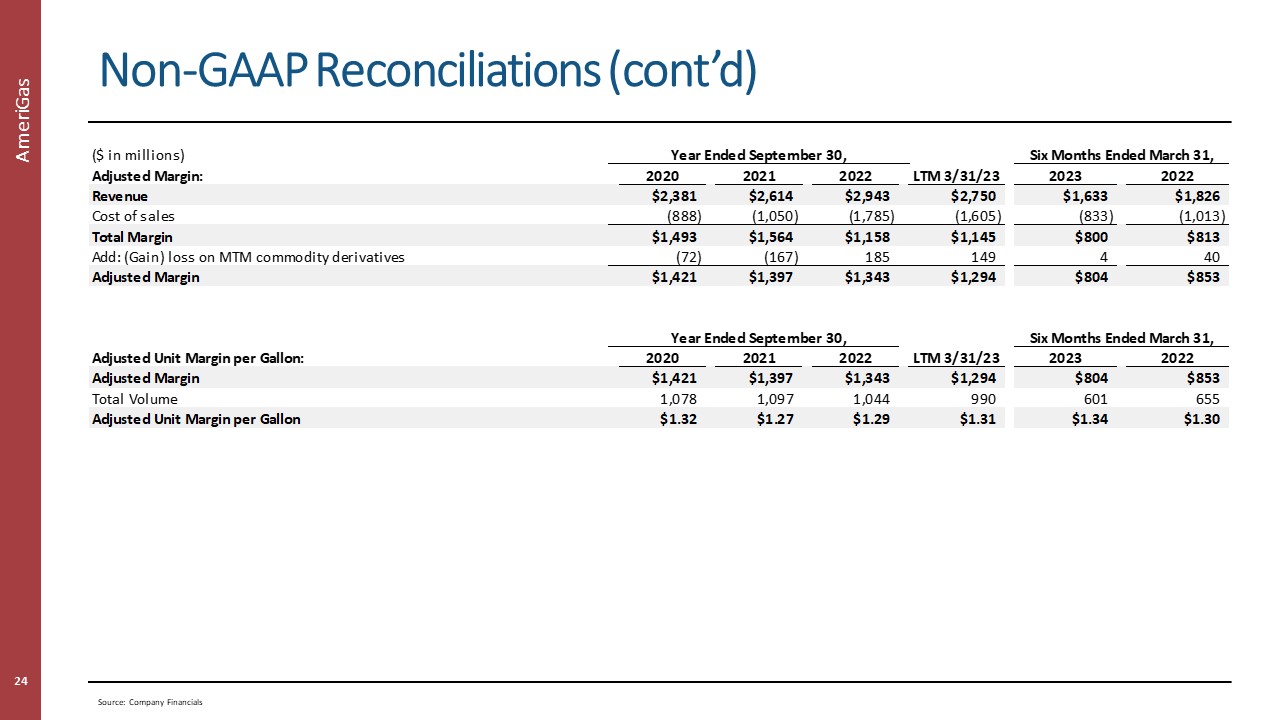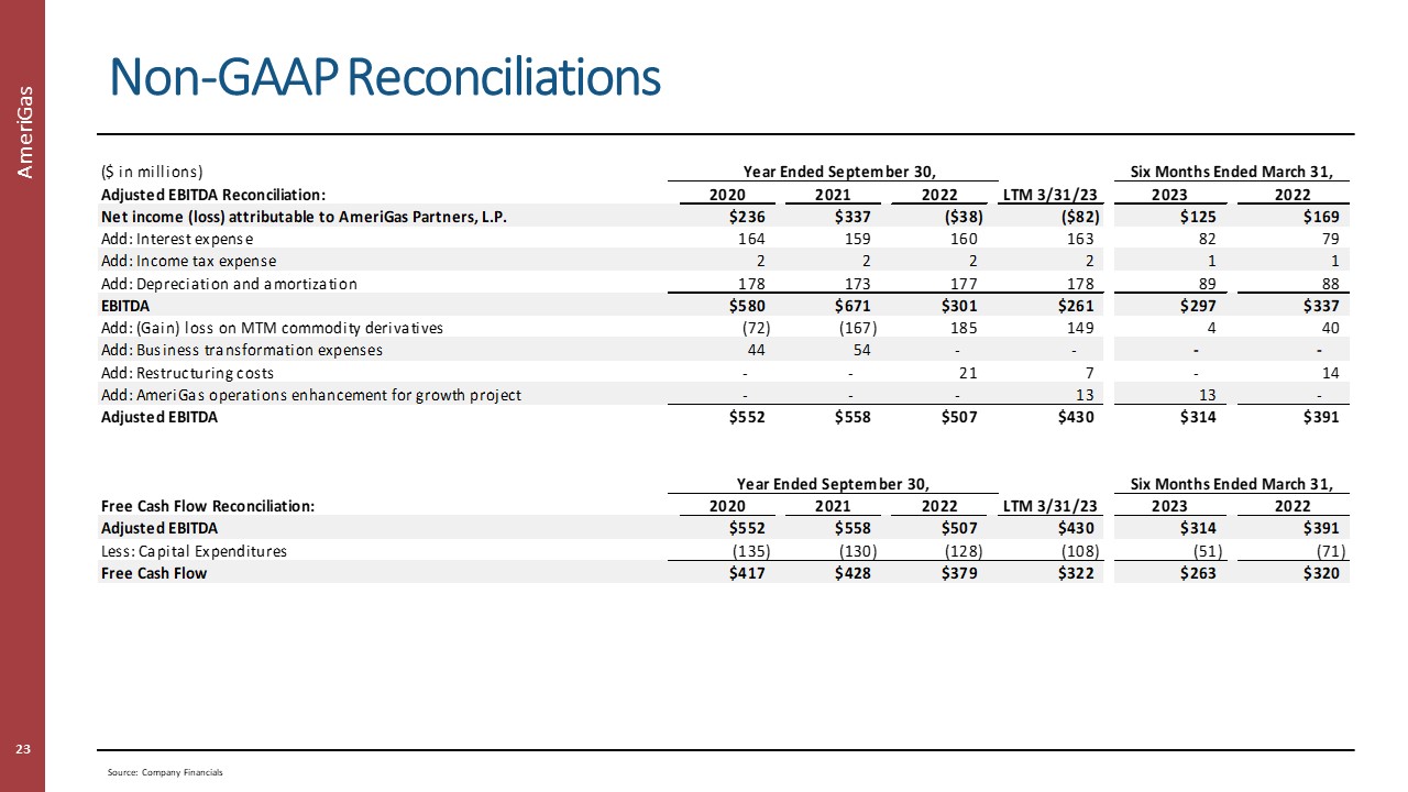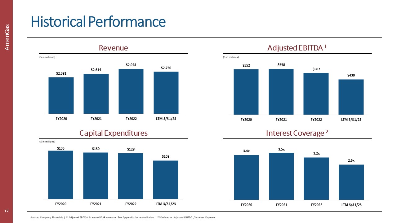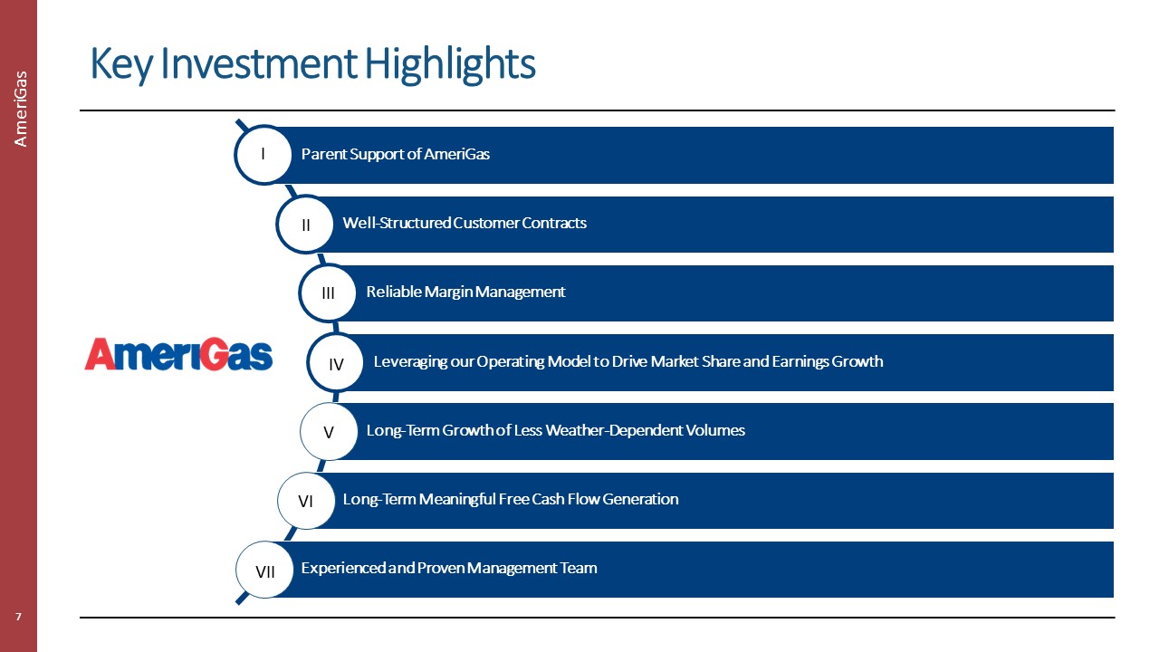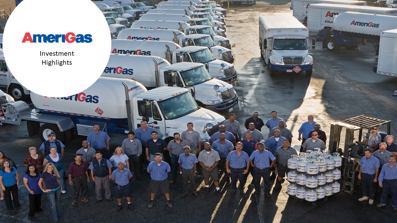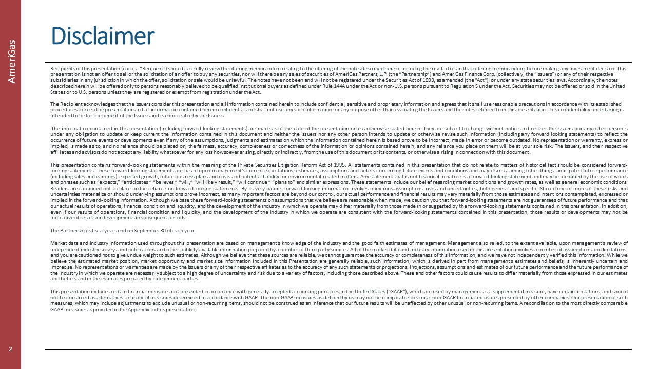 Recipients of this presentation (each, a “Recipient”) should carefully review the offering memorandum relating to the offering of the notes described herein, including the risk factors in that offering memorandum, before making any investment decision. This presentation is not an offer to sell or the solicitation of an offer to buy any securities, nor will there be any sales of securities of AmeriGas Partners, L.P. (the “Partnership”) and AmeriGas Finance Corp. (collectively, the “Issuers”) or any of their respective subsidiaries in any jurisdiction in which the offer, solicitation or sale would be unlawful. The notes have not been and will not be registered under the Securities Act of 1933, as amended (the "Act"), or under any state securities laws. Accordingly, the notes described herein will be offered only to persons reasonably believed to be qualified institutional buyers as defined under Rule 144A under the Act or non-U.S. persons pursuant to Regulation S under the Act. Securities may not be offered or sold in the United States or to U.S. persons unless they are registered or exempt from registration under the Act.     The Recipient acknowledges that the Issuers consider this presentation and all information contained herein to include confidential, sensitive and proprietary information and agrees that it shall use reasonable precautions in accordance with its established procedures to keep the presentation and all information contained herein confidential and shall not use any such information for any purpose other than evaluating the Issuers and the notes referred to in this presentation. This confidentiality undertaking is intended to be for the benefit of the Issuers and is enforceable by the Issuers.   The information contained in this presentation (including forward-looking statements) are made as of the date of the presentation unless otherwise stated herein. They are subject to change without notice and neither the Issuers nor any other person is under any obligation to update or keep current the information contained in this document and neither the Issuers nor any other person intends to update or otherwise revise such information (including any forward looking statements) to reflect the occurrence of future events or developments even if any of the assumptions, judgments and estimates on which the information contained herein is based prove to be incorrect, made in error or become outdated. No representation or warranty, express or implied, is made as to, and no reliance should be placed on, the fairness, accuracy, completeness or correctness of the information or opinions contained herein, and any reliance you place on them will be at your sole risk. The Issuers, and their respective affiliates and advisors do not accept any liability whatsoever for any loss howsoever arising, directly or indirectly, from the use of this document or its contents, or otherwise a rising in connection with this document.   This presentation contains forward-looking statements within the meaning of the Private Securities Litigation Reform Act of 1995. All statements contained in this presentation that do not relate to matters of historical fact should be considered forward-looking statements. These forward-looking statements are based upon management's current expectations, estimates, assumptions and beliefs concerning future events and conditions and may discuss, among other things, anticipated future performance (including sales and earnings), expected growth, future business plans and costs and potential liability for environmental-related matters. Any statement that is not historical in nature is a forward-looking statement and may be identified by the use of words and phrases such as “expects,” “anticipates,” “believes,” “will,” “will likely result,” “will continue,” “plans to” and similar expressions. These statements include our belief regarding market conditions and growth rates, as well as general economic conditions. Readers are cautioned not to place undue reliance on forward-looking statements. By its very nature, forward-looking information involves numerous assumptions, risks and uncertainties, both general and specific. Should one or more of these risks and uncertainties materialize or should underlying assumptions prove incorrect, as many important factors are beyond our control, our actual performance and financial results may vary materially from those estimates and intentions contemplated, expressed or implied in the forward-looking information. Although we base these forward-looking statements on assumptions that we believe are reasonable when made, we caution you that forward-looking statements are not guarantees of future performance and that our actual results of operations, financial condition and liquidity, and the development of the industry in which we operate may differ materially from those made in or suggested by the forward-looking statements contained in this presentation. In addition, even if our results of operations, financial condition and liquidity, and the development of the industry in which we operate are consistent with the forward-looking statements contained in this presentation, those results or developments may not be indicative of results or developments in subsequent periods.  The Partnership’s fiscal years end on September 30 of each year.  Market data and industry information used throughout this presentation are based on management's knowledge of the industry and the good faith estimates of management. Management also relied, to the extent available, upon management's review of independent industry surveys and publications and other publicly available information prepared by a number of third party sources. All of the market data and industry information used in this presentation involves a number of assumptions and limitations, and you are cautioned not to give undue weight to such esti