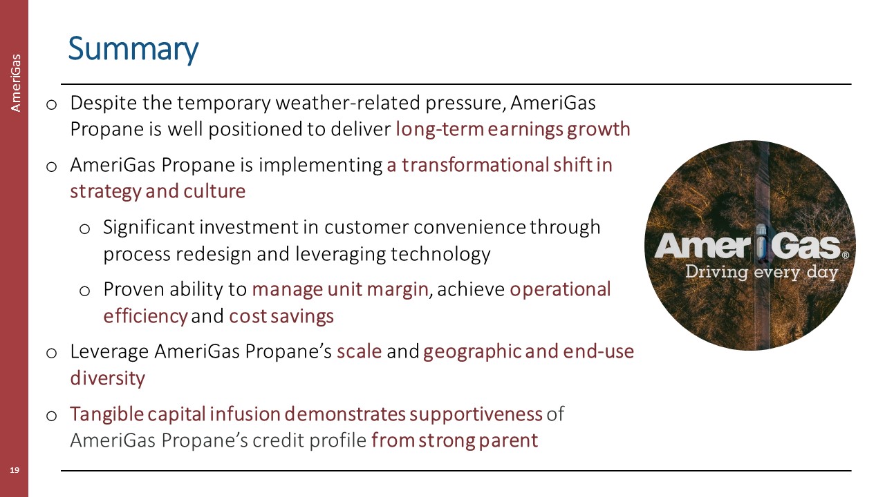Summary  Despite the temporary weather-related pressure, AmeriGas Propane is well positioned to deliver long-term earnings growth  AmeriGas Propane is implementing a transformational shift in strategy and culture  Significant investment in customer convenience through process redesign and leveraging technology  Proven ability to manage unit margin, achieve operational efficiency and cost savings  Leverage AmeriGas Propane’s scale and geographic and end-use diversity   Tangible capital infusion demonstrates supportiveness of AmeriGas Propane’s credit profile from strong parent