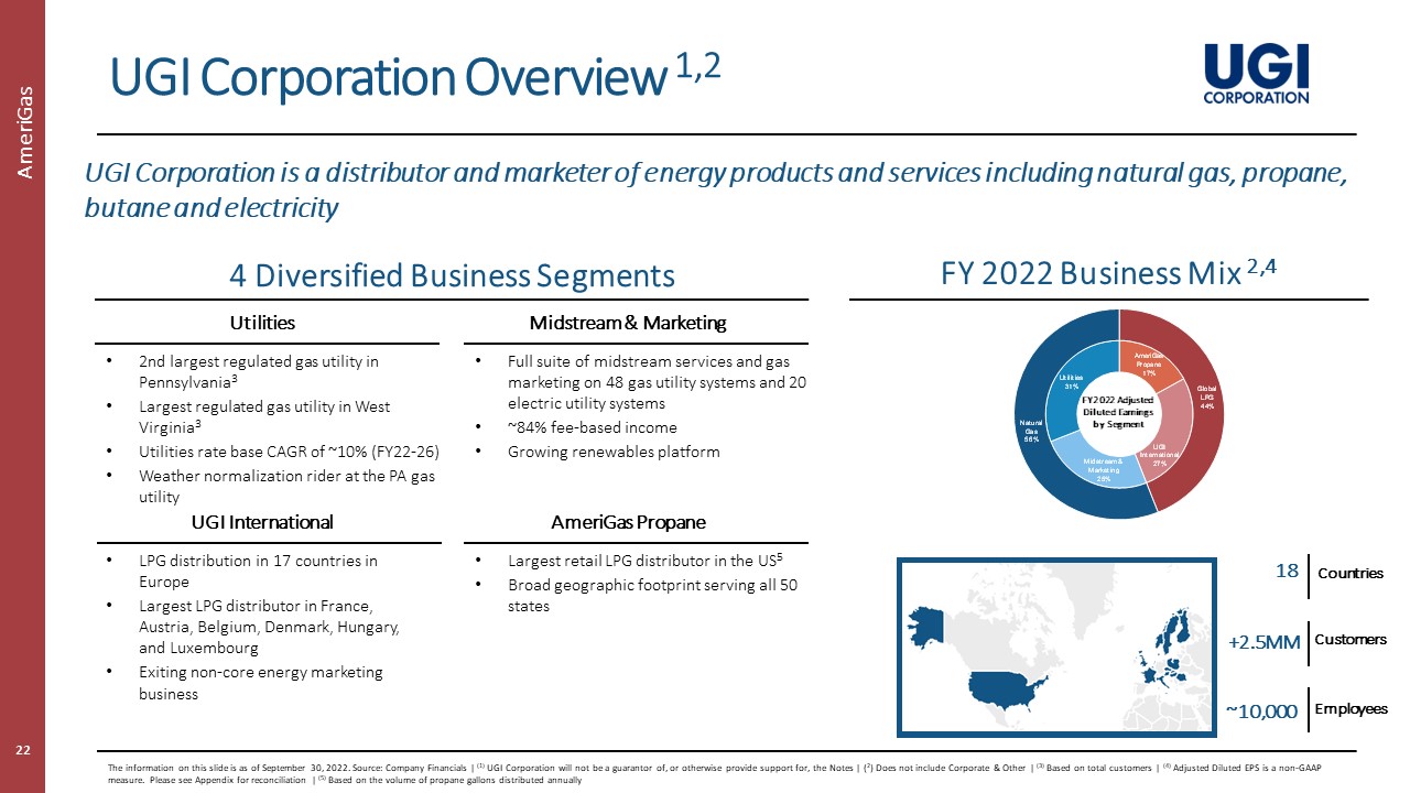 UGI Corporation Overview 1,2  UGI Corporation is a distributor and marketer of energy products and services including natural gas, propane, butane and electricity  18  Countries  4 Diversified Business Segments  Utilities  Midstream & Marketing  UGI International  AmeriGas Propane  2nd largest regulated gas utility in Pennsylvania3  Largest regulated gas utility in West Virginia3  Utilities rate base CAGR of ~10% (FY22-26)  Weather normalization rider at the PA gas utility  Full suite of midstream services and gas marketing on 48 gas utility systems and 20 electric utility systems   ~84% fee-based income  Growing renewables platform   LPG distribution in 17 countries in Europe  Largest LPG distributor in France, Austria, Belgium, Denmark, Hungary, and Luxembourg  Exiting non-core energy marketing business   Largest retail LPG distributor in the US5  Broad geographic footprint serving all 50 states  The information on this slide is as of September 30, 2022. Source: Company Financials | (1) UGI Corporation will not be a guarantor of, or otherwise provide support for, the Notes | (2) Does not include Corporate & Other | (3) Based on total customers | (4) Adjusted Diluted EPS is a non-GAAP measure. Please see Appendix for reconciliation | (5) Based on the volume of propane gallons distributed annually  FY2022 Adjusted Diluted Earnings by Segment  FY 2022 Business Mix 2,4  +2.5MM  Customers  ~10,000  Employees