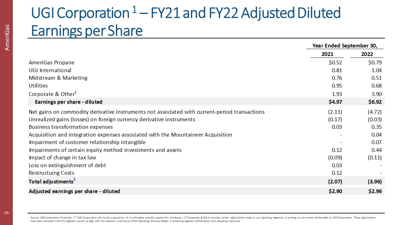 UGI Corporation 1 – FY21 and FY22 Adjusted Diluted Earnings per Share  Source: UGI Corporation Financials | (1) UGI Corporation will not be a guarantor of, or otherwise provide support for, the Notes | (2) Corporate & Other includes certain adjustments made to our reporting segments in arriving at net income attributable to UGI Corporation. These adjustments have been excluded from the segment results to align with the measure used by our Chief Operating Decision Maker in assessing segment performance and allocating resources