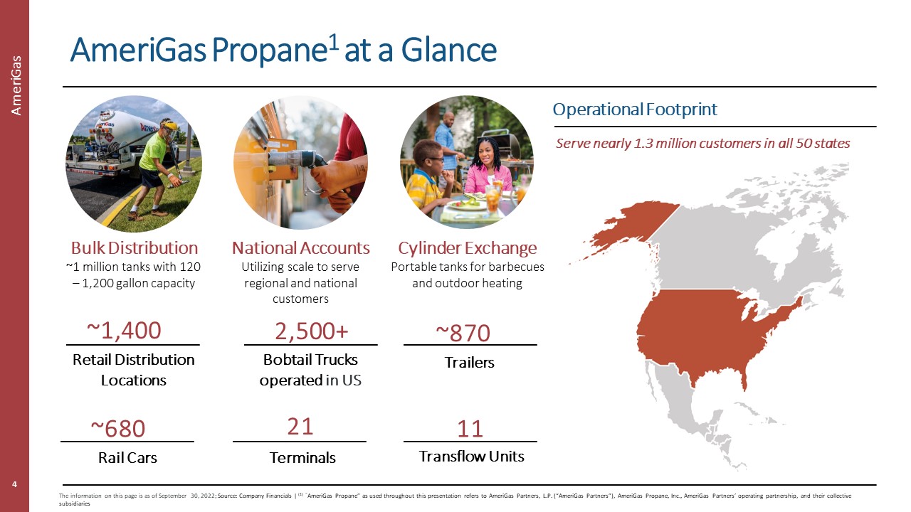 AmeriGas Propane1 at a Glance  Operational Footprint  Bulk Distribution  ~1 million tanks with 120 – 1,200 gallon capacity  National Accounts  Utilizing scale to serve regional and national customers  Cylinder Exchange  Portable tanks for barbecues and outdoor heating  Trailers  Rail Cars  ~870  Terminals  Bobtail Trucks operated in US  2,500+  ~1,400  11  Retail Distribution Locations  Transflow Units  21  ~680  Serve nearly 1.3 million customers in all 50 states   The information on this page is as of September 30, 2022; Source: Company Financials | (1) “AmeriGas Propane” as used throughout this presentation refers to AmeriGas Partners, L.P. (“AmeriGas Partners”), AmeriGas Propane, Inc., AmeriGas Partners’ operating partnership, and their collective subsidiaries