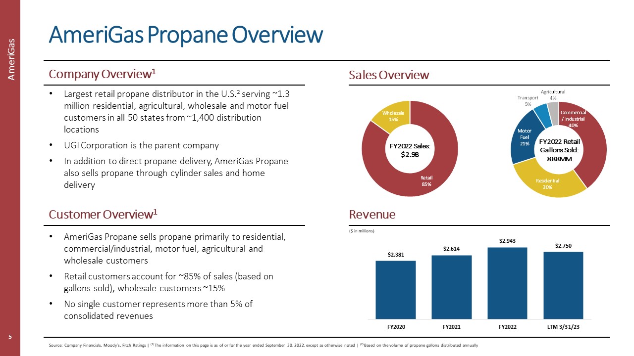 AmeriGas Propane Overview  Company Overview1  Sales Overview  Customer Overview1  Largest retail propane distributor in the U.S.2 serving ~1.3 million residential, agricultural, wholesale and motor fuel customers in all 50 states from ~1,400 distribution locations  UGI Corporation is the parent company   In addition to direct propane delivery, AmeriGas Propane also sells propane through cylinder sales and home delivery   AmeriGas Propane sells propane primarily to residential, commercial/industrial, motor fuel, agricultural and wholesale customers  Retail customers account for ~85% of sales (based on gallons sold), wholesale customers ~15%  No single customer represents more than 5% of consolidated revenues   FY2022 Sales:  $2.9B  FY2022 Retail Gallons Sold: 888MM  Revenue  ($ in millions)  Source: Company Financials, Moody’s, Fitch Ratings | (1) The information on this page is as of or for the year ended September 30, 2022, except as otherwise noted | (2) Based on the volume of propane gallons distributed annually