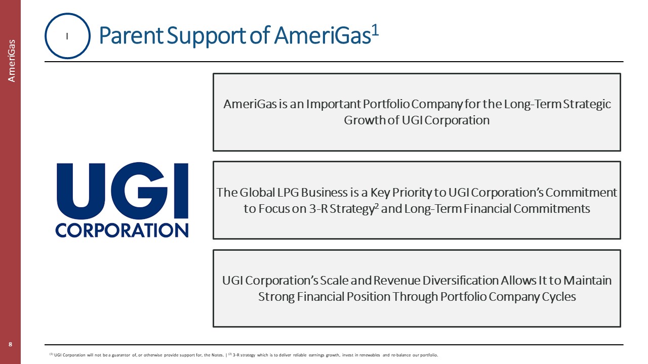 Parent Support of AmeriGas1  I  AmeriGas is an Important Portfolio Company for the Long-Term Strategic Growth of UGI Corporation  The Global LPG Business is a Key Priority to UGI Corporation’s Commitment to Focus on 3-R Strategy2 and Long-Term Financial Commitments   UGI Corporation’s Scale and Revenue Diversification Allows It to Maintain Strong Financial Position Through Portfolio Company Cycles  (1) UGI Corporation will not be a guarantor of, or otherwise provide support for, the Notes. | (2) 3-R strategy which is to deliver reliable earnings growth, invest in renewables and re-balance our portfolio.