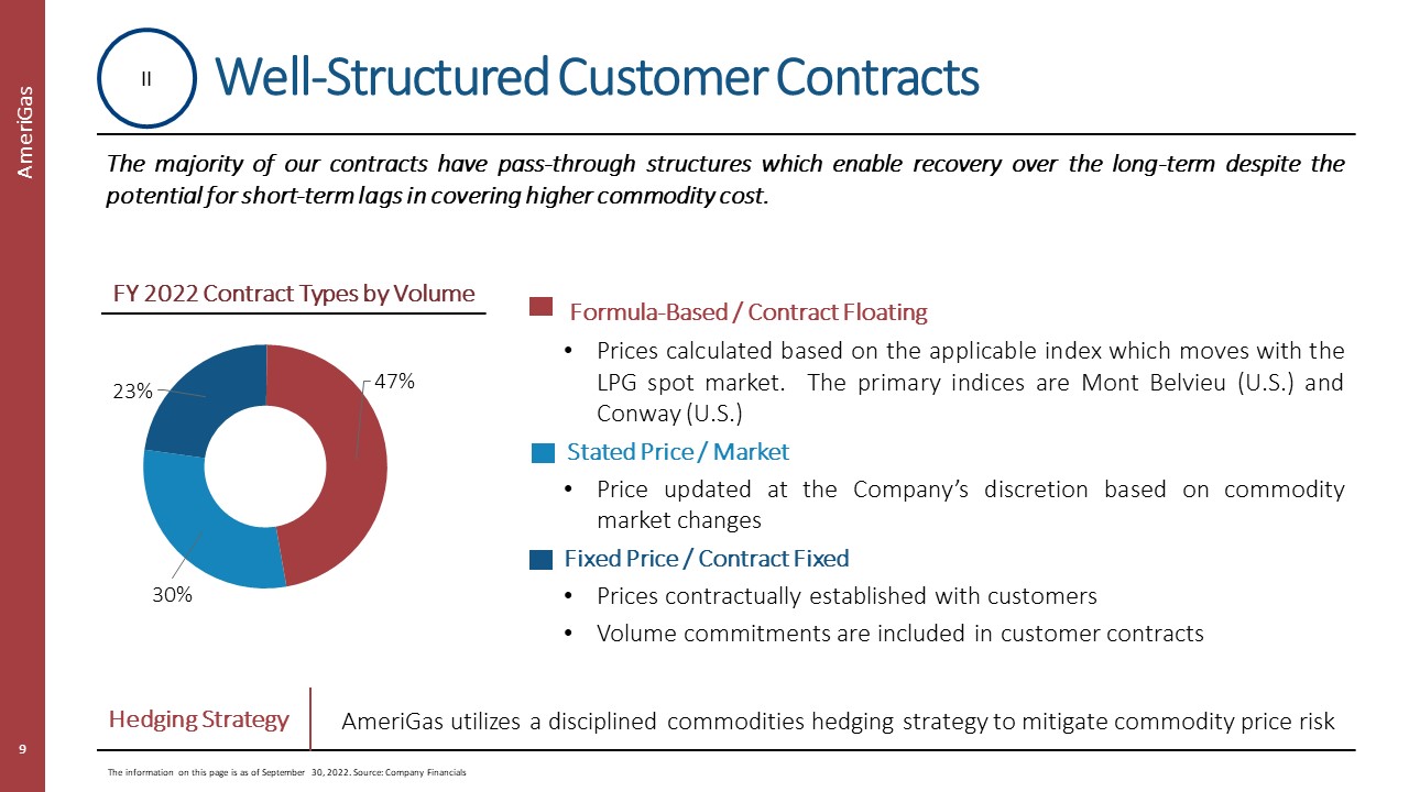 The majority of our contracts have pass-through structures which enable recovery over the long-term despite the potential for short-term lags in covering higher commodity cost.    Formula-Based / Contract Floating  Prices calculated based on the applicable index which moves with the LPG spot market. The primary indices are Mont Belvieu (U.S.) and Conway (U.S.)   Stated Price / Market  Price updated at the Company’s discretion based on commodity market changes  Fixed Price / Contract Fixed  Prices contractually established with customers  Volume commitments are included in customer contracts  AmeriGas utilizes a disciplined commodities hedging strategy to mitigate commodity price risk  Hedging Strategy    Well-Structured Customer Contracts  II  FY 2022 Contract Types by Volume  The information on this page is as of September 30, 2022. Source: Company Financials