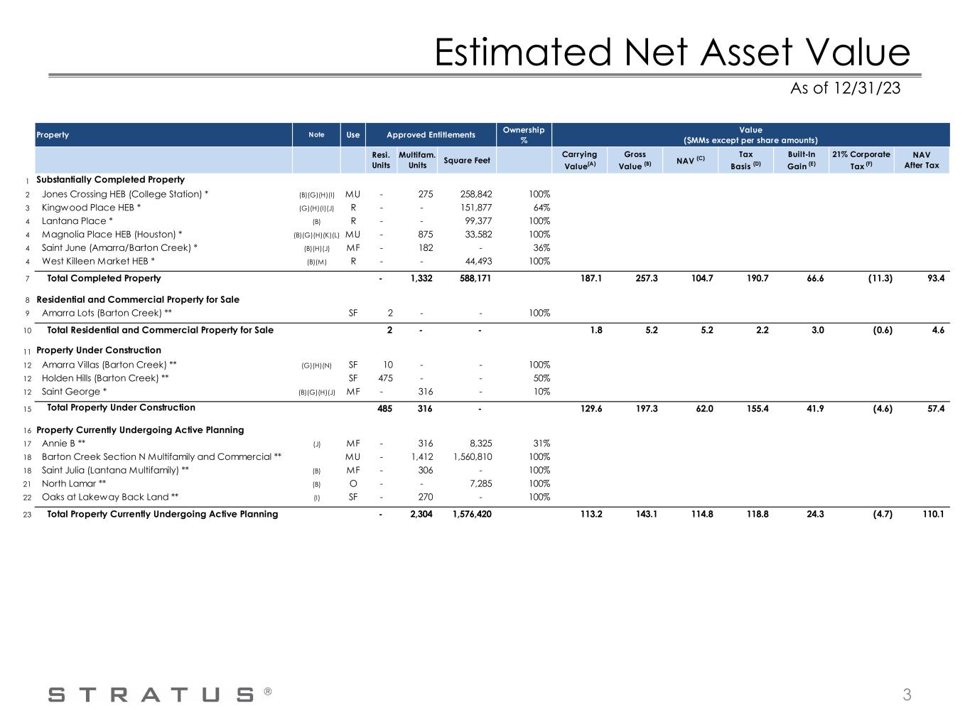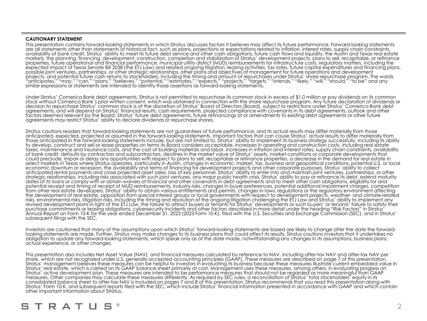 CAUTIONARY STATEMENT This presentation contains forward-looking statements in which Stratus discusses factors it believes may affect its future performance. Forward-looking statements are all statements other than statements of historical fact, such as plans, projections or expectations related to inflation, interest rates, supply chain constraints, availability of bank credit, Stratus’ ability to meet its future debt service and other cash obligations, future cash flows and liquidity, the Austin and Texas real estate markets, the planning, financing, development, construction, completion and stabilization of Stratus’ development projects, plans to sell, recapitalize, or refinance properties, future operational and financial performance, municipal utility district (MUD) reimbursements for infrastructure costs, regulatory matters, including the expected impact of Texas Senate Bill 2038 (the ETJ Law) and related ongoing litigation, leasing activities, tax rates, future capital expenditures and financing plans, possible joint ventures, partnerships, or other strategic relationships, other plans and objectives of management for future operations and development projects, and potential future cash returns to stockholders, including the timing and amount of repurchases under Stratus’ share repurchase program. The words “anticipates,” “may,” “can,” “plans,” “believes,” “potential,” “estimates,” “expects,” “projects,” “targets,” “intends,” “likely,” “will,” “should,” “to be” and any similar expressions or statements are intended to identify those assertions as forward-looking statements. Under Stratus’ Comerica Bank debt agreements, Stratus is not permitted to repurchase its common stock in excess of $1.0 million or pay dividends on its common stock without Comerica Bank’s prior written consent, which was obtained in connection with the share repurchase program. Any future declaration of dividends or decision to repurchase Stratus’ common stock is at the discretion of Stratus’ Board of Directors (Board), subject to restrictions under Stratus’ Comerica Bank debt agreements, and will depend on Stratus’ financial results, cash requirements, projected compliance with covenants in its debt agreements, outlook and other factors deemed relevant by the Board. Stratus’ future debt agreements, future refinancings of or amendments to existing debt agreements or other future agreements may restrict Stratus’ ability to declare dividends or repurchase shares. Stratus cautions readers that forward-looking statements are not guarantees of future performance, and its actual results may differ materially from those anticipated, expected, projected or assumed in the forward-looking statements. Important factors that can cause Stratus’ actual results to differ materially from those anticipated in the forward-looking statements include, but are not limited to, Stratus’ ability to implement its business strategy successfully, including its ability to develop, construct and sell or lease properties on terms its Board considers acceptable, increases in operating and construction costs, including real estate taxes, maintenance and insurance costs, and the cost of building materials and labor, increases in inflation and interest rates, supply chain constraints, availability of bank credit, defaults by contractors and subcontractors, declines in the market value of Stratus’ assets, market conditions or corporate developments that could preclude, impair or delay any opportunities with respect to plans to sell, recapitalize or refinance properties, a decrease in the demand for real estate in select markets in Texas where Stratus operates, particularly in Austin, changes in economic, market, tax, business and geopolitical conditions, potential U.S. or local economic downturn or recession, the availability and terms of financing for development projects and other corporate purposes, Stratus’ ability to collect anticipated rental payments and close projected asset sales, loss of key personnel, Stratus’ ability to enter into and maintain joint ventures, partnerships, or other strategic relationships, including risks associated with such joint ventures, any major public health crisis, Stratus’ ability to pay or refinance its debt, extend maturity dates of its loans or comply with or obtain waivers of financial and other covenants in debt agreements and to meet other cash obligations, eligibility for and potential receipt and timing of receipt of MUD reimbursements, industry risks, changes in buyer preferences, potential additional impairment charges, competition from other real estate developers, Stratus’ ability to obtain various entitlements and permits, changes in laws, regulations or the regulatory environment affecting the development of real estate, opposition from special interest groups or local governments with respect to development projects, weather- and climate-related risks, environmental risks, litigation risks, including the timing and resolution of the ongoing litigation challenging the ETJ Law and Stratus’ ability to implement any revised development plans in light of the ETJ Law, the failure to attract buyers or tenants for Stratus’ developments or such buyers’ or tenants’ failure to satisfy their purchase commitments or leasing obligations, cybersecurity incidents and other factors described in more detail under the heading “Risk Factors” in Stratus’ Annual Report on Form 10-K for the year ended December 31, 2023 (2023 Form 10-K), filed with the U.S. Securities and Exchange Commission (SEC), and in Stratus’ subsequent filings with the SEC. Investors are cautioned that many of the assumptions upon which Stratus’ forward-looking statements are based are likely to change after the date the forward- looking statements are made. Further, Stratus may make changes to its business plans that could affect i