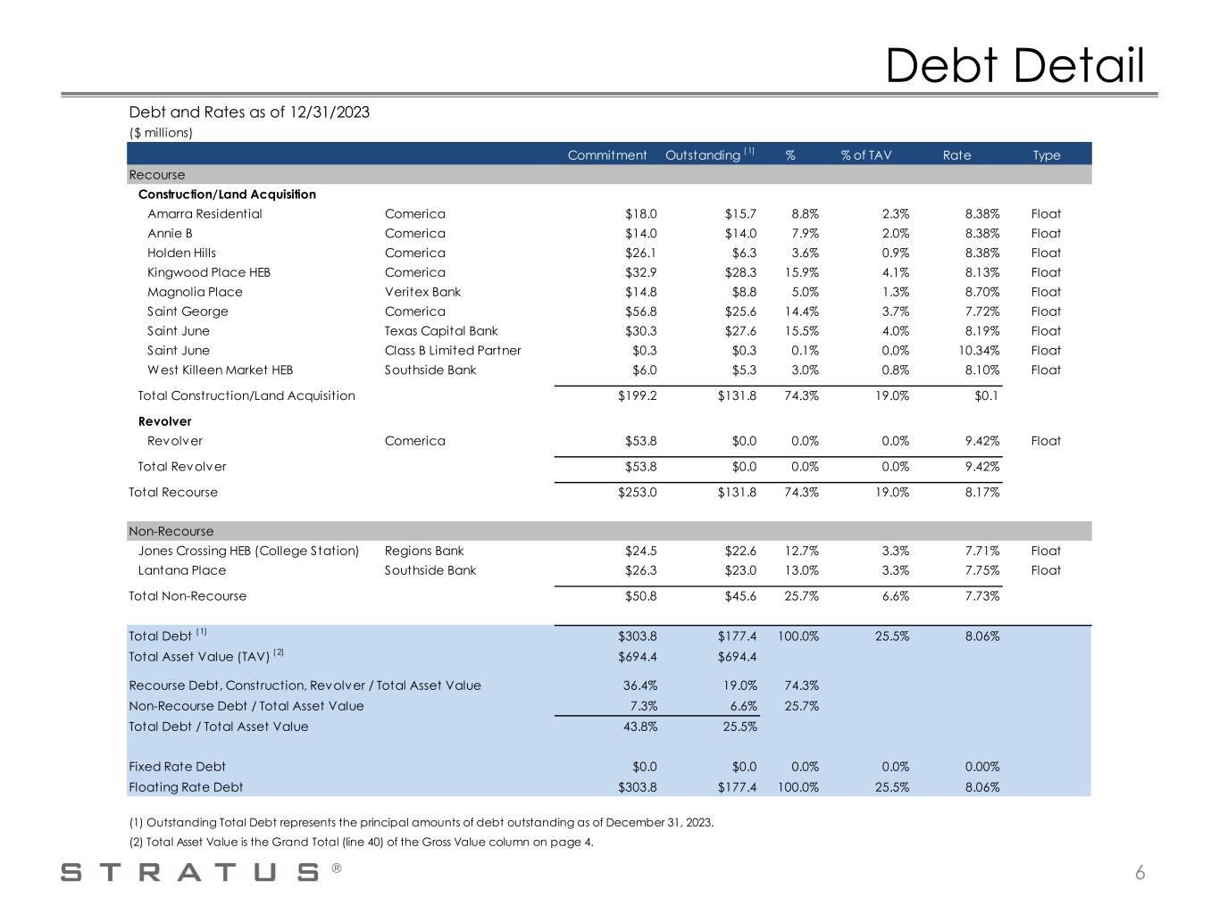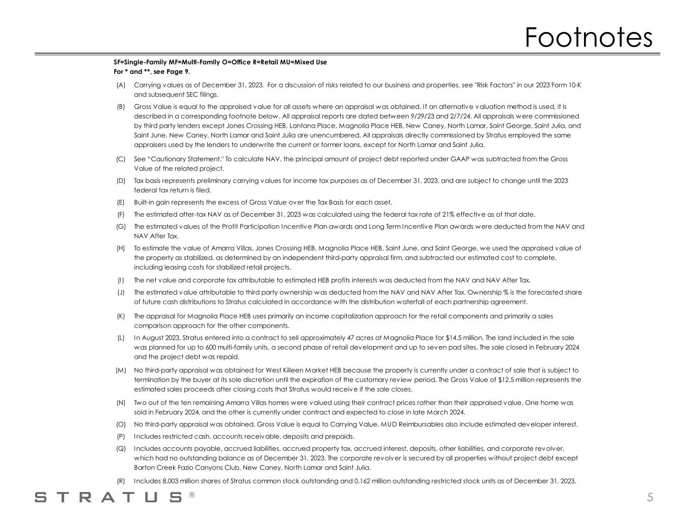 Footnotes 5 SF=Single-Family MF=Multi-Family O=Office R=Retail MU=Mixed Use For * and **, see Page 9. (A) Carrying values as of December 31, 2023. For a discussion of risks related to our business and properties, see "Risk Factors" in our 2023 Form 10-K and subsequent SEC filings. (B) Gross Value is equal to the appraised value for all assets where an appraisal was obtained. I f an alternative valuation method is used, it is described in a corresponding footnote below. All appraisal reports are dated between 9/29/23 and 2/7/24. All appraisals were commissioned by third party lenders except Jones Crossing HEB, Lantana Place, Magnolia Place HEB, New Caney, North Lamar, Saint George, Saint Julia, and Saint June. New Caney, North Lamar and Saint Julia are unencumbered. All appraisals directly commissioned by Stratus employed the same appraisers used by the lenders to underwrite the current or former loans, except for North Lamar and Saint Julia. (C) See “Cautionary Statement." To calculate NAV, the principal amount of project debt reported under GAAP was subtracted from the Gross Value of the related project. (D) Tax basis represents preliminary carrying values for income tax purposes as of December 31, 2023, and are subject to change until the 2023 federal tax return is filed. (E) Built-in gain represents the excess of Gross Value over the Tax Basis for each asset. (F) The estimated after-tax NAV as of December 31, 2023 was calculated using the federal tax rate of 21% effective as of that date. (G) The estimated values of the Profit Participation Incentive Plan awards and Long Term Incentive Plan awards were deducted from the NAV and NAV After Tax. (H) To estimate the value of Amarra Villas, Jones Crossing HEB, Magnolia Place HEB, Saint June, and Saint George, we used the appraised value of the property as stabilized, as determined by an independent third-party appraisal firm, and subtracted our estimated cost to complete, including leasing costs for stabilized retail projects. (I ) The net value and corporate tax attributable to estimated HEB profits interests was deducted from the NAV and NAV After Tax. (J) The estimated value attributable to third party ownership was deducted from the NAV and NAV After Tax. Ownership % is the forecasted share of future cash distributions to Stratus calculated in accordance with the distribution waterfall of each partnership agreement. (K) The appraisal for Magnolia Place HEB uses primarily an income capitalization approach for the retail components and primarily a sales comparison approach for the other components. (L) In August 2023, Stratus entered into a contract to sell approximately 47 acres at Magnolia Place for $14.5 million. The land included in the sale was planned for up to 600 multi-family units, a second phase of retail development and up to seven pad sites. The sale closed in February 2024 and the project debt was repaid. (M) No third-party appraisal was obtained for West Killeen Market HEB because the property is currently under a contract of sale that is subject to termination by the buyer at its sole discretion until the expiration of the customary rev iew period. The Gross Value of $12.5 million represents the estimated sales proceeds after closing costs that Stratus would receive if the sale closes. (N) Two out of the ten remaining Amarra Villas homes were valued using their contract prices rather than their appraised value. One home was sold in February 2024, and the other is currently under contract and expected to close in late March 2024. (O) No third-party appraisal was obtained. Gross Value is equal to Carrying Value. MUD Reimbursables also include estimated developer interest. (P) Includes restricted cash, accounts receivable, deposits and prepaids. (Q) Includes accounts payable, accrued liabilities, accrued property tax, accrued interest, deposits, other liabilities, and corporate revolver, which had no outstanding balance as of December 31, 2023. The corporate revolver is secured by all properties without project debt except Barton Creek Fazio Canyons Club, New Caney, North Lamar and Saint Julia. (R) Includes 8.003 million shares of Stratus common stock outstanding and 0.162 million outstanding restricted stock units as of December 31, 2023.