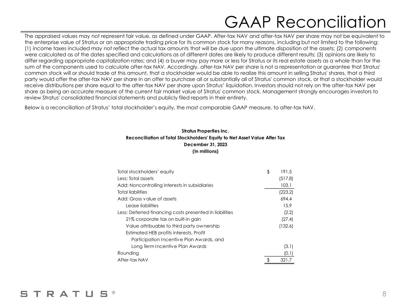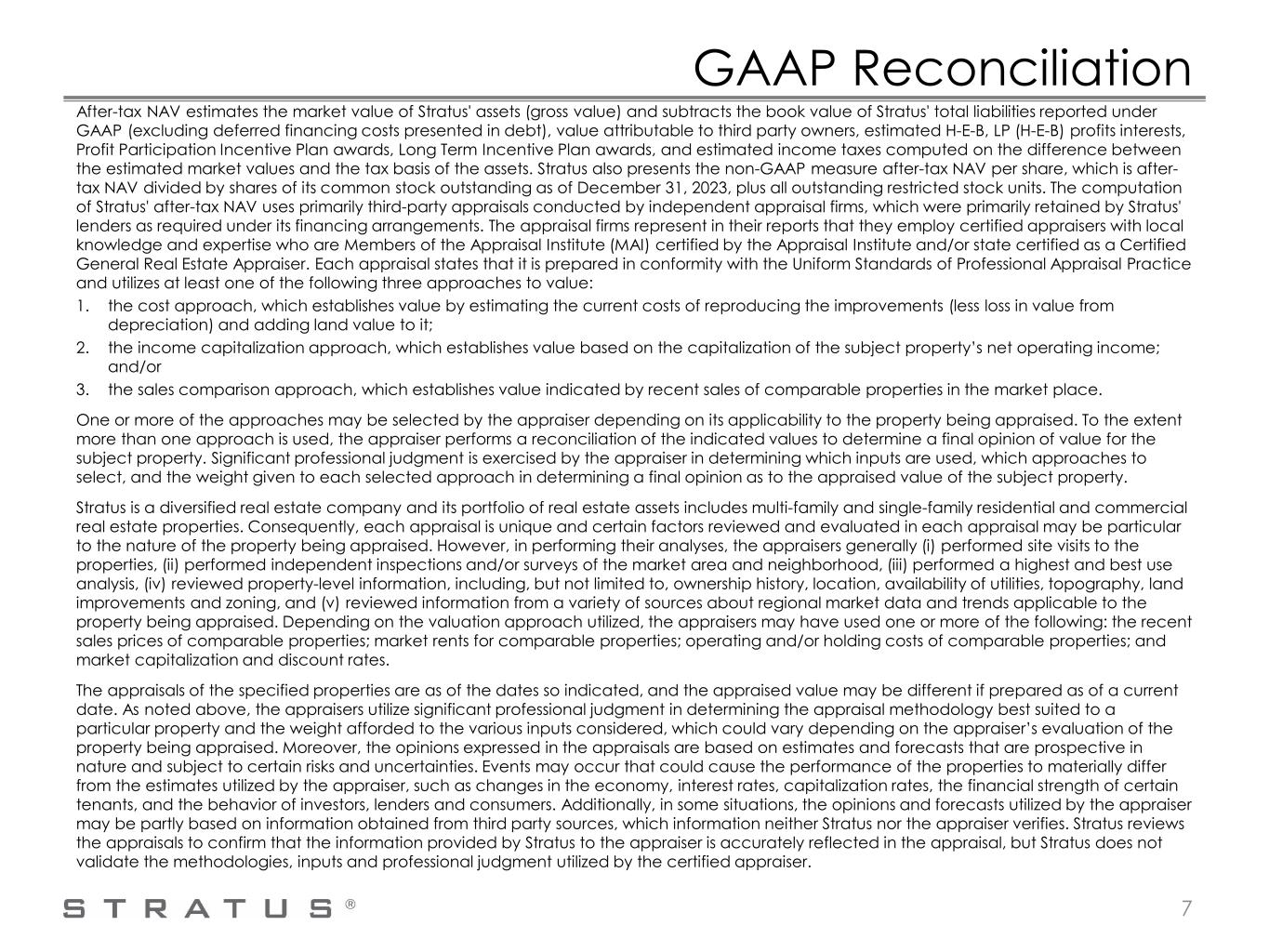 GAAP Reconciliation After-tax NAV estimates the market value of Stratus' assets (gross value) and subtracts the book value of Stratus' total liabilities reported under GAAP (excluding deferred financing costs presented in debt), value attributable to third party owners, estimated H-E-B, LP (H-E-B) profits interests, Profit Participation Incentive Plan awards, Long Term Incentive Plan awards, and estimated income taxes computed on the difference between the estimated market values and the tax basis of the assets. Stratus also presents the non-GAAP measure after-tax NAV per share, which is after- tax NAV divided by shares of its common stock outstanding as of December 31, 2023, plus all outstanding restricted stock units. The computation of Stratus' after-tax NAV uses primarily third-party appraisals conducted by independent appraisal firms, which were primarily retained by Stratus' lenders as required under its financing arrangements. The appraisal firms represent in their reports that they employ certified appraisers with local knowledge and expertise who are Members of the Appraisal Institute (MAI) certified by the Appraisal Institute and/or state certified as a Certified General Real Estate Appraiser. Each appraisal states that it is prepared in conformity with the Uniform Standards of Professional Appraisal Practice and utilizes at least one of the following three approaches to value: 1. the cost approach, which establishes value by estimating the current costs of reproducing the improvements (less loss in value from depreciation) and adding land value to it; 2. the income capitalization approach, which establishes value based on the capitalization of the subject property’s net operating income; and/or 3. the sales comparison approach, which establishes value indicated by recent sales of comparable properties in the market place. One or more of the approaches may be selected by the appraiser depending on its applicability to the property being appraised. To the extent more than one approach is used, the appraiser performs a reconciliation of the indicated values to determine a final opinion of value for the subject property. Significant professional judgment is exercised by the appraiser in determining which inputs are used, which approaches to select, and the weight given to each selected approach in determining a final opinion as to the appraised value of the subject property. Stratus is a diversified real estate company and its portfolio of real estate assets includes multi-family and single-family residential and commercial real estate properties. Consequently, each appraisal is unique and certain factors reviewed and evaluated in each appraisal may be particular to the nature of the property being appraised. However, in performing their analyses, the appraisers generally (i) performed site visits to the properties, (ii) performed independent inspections and/or surveys of the market area and neighborhood, (iii) performed a highest and best use analysis, (iv) reviewed property-level information, including, but not limited to, ownership history, location, availability of utilities, topography, land improvements and zoning, and (v) reviewed information from a variety of sources about regional market data and trends applicable to the property being appraised. Depending on the valuation approach utilized, the appraisers may have used one or more of the following: the recent sales prices of comparable properties; market rents for comparable properties; operating and/or holding costs of comparable properties; and market capitalization and discount rates. The appraisals of the specified properties are as of the dates so indicated, and the appraised value may be different if prepared as of a current date. As noted above, the appraisers utilize significant professional judgment in determining the appraisal methodology best suited to a particular property and the weight afforded to the various inputs considered, which could vary depending on the appraiser’s evaluation of the property being appraised. Moreover, the opinions expressed in the appraisals are based on estimates and forecasts that are prospective in nature and subject to certain risks and uncertainties. Events may occur that could cause the performance of the properties to materially differ from the estimates utilized by the appraiser, such as changes in the economy, interest rates, capitalization rates, the financial strength of certain tenants, and the behavior of investors, lenders and consumers. Additionally, in some situations, the opinions and forecasts utilized by the appraiser may be partly based on information obtained from third party sources, which information neither Stratus nor the appraiser verifies. Stratus reviews the appraisals to confirm that the information provided by Stratus to the appraiser is accurately reflected in the appraisal, but Stratus does not validate the methodologies, inputs and professional judgment utilized by the certified appraiser. 7