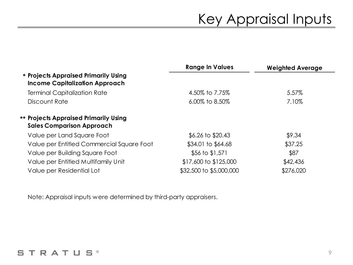 GAAP Reconciliation The appraised values may not represent fair value, as defined under GAAP. After-tax NAV and after-tax NAV per share may not be equivalent to the enterprise value of Stratus or an appropriate trading price for its common stock for many reasons, including but not limited to the following: (1) income taxes included may not reflect the actual tax amounts that will be due upon the ultimate disposition of the assets; (2) components were calculated as of the dates specified and calculations as of different dates are likely to produce different results; (3) opinions are likely to differ regarding appropriate capitalization rates; and (4) a buyer may pay more or less for Stratus or its real estate assets as a whole than for the sum of the components used to calculate after-tax NAV. Accordingly, after-tax NAV per share is not a representation or guarantee that Stratus' common stock will or should trade at this amount, that a stockholder would be able to realize this amount in selling Stratus' shares, that a third party would offer the after-tax NAV per share in an offer to purchase all or substantially all of Stratus' common stock, or that a stockholder would receive distributions per share equal to the after-tax NAV per share upon Stratus’ liquidation. Investors should not rely on the after-tax NAV per share as being an accurate measure of the current fair market value of Stratus' common stock. Management strongly encourages investors to review Stratus' consolidated financial statements and publicly filed reports in their entirety. Below is a reconciliation of Stratus’ total stockholder’s equity, the most comparable GAAP measure, to after-tax NAV. 8 Total stockholders’ equity 191.5$ Less: Total assets (517.8) Add: Noncontrolling interests in subsidiaries 103.1 Total liabilities (223.2) Add: Gross value of assets 694.4 Lease liabilities 15.9 Less: Deferred financing costs presented in liabilities (2.2) 21% corporate tax on built-in gain (27.4) Value attribuable to third party ownership (132.6) Estimated HEB profits interests, Profit Participation Incentive Plan Awards, and Long Term Incentive Plan Awards (3.1) Rounding (0.1) After-tax NAV 321.7$ Stratus Properties Inc. Reconciliation of Total Stockholders' Equity to Net Asset Value After Tax December 31, 2023 (In millions)