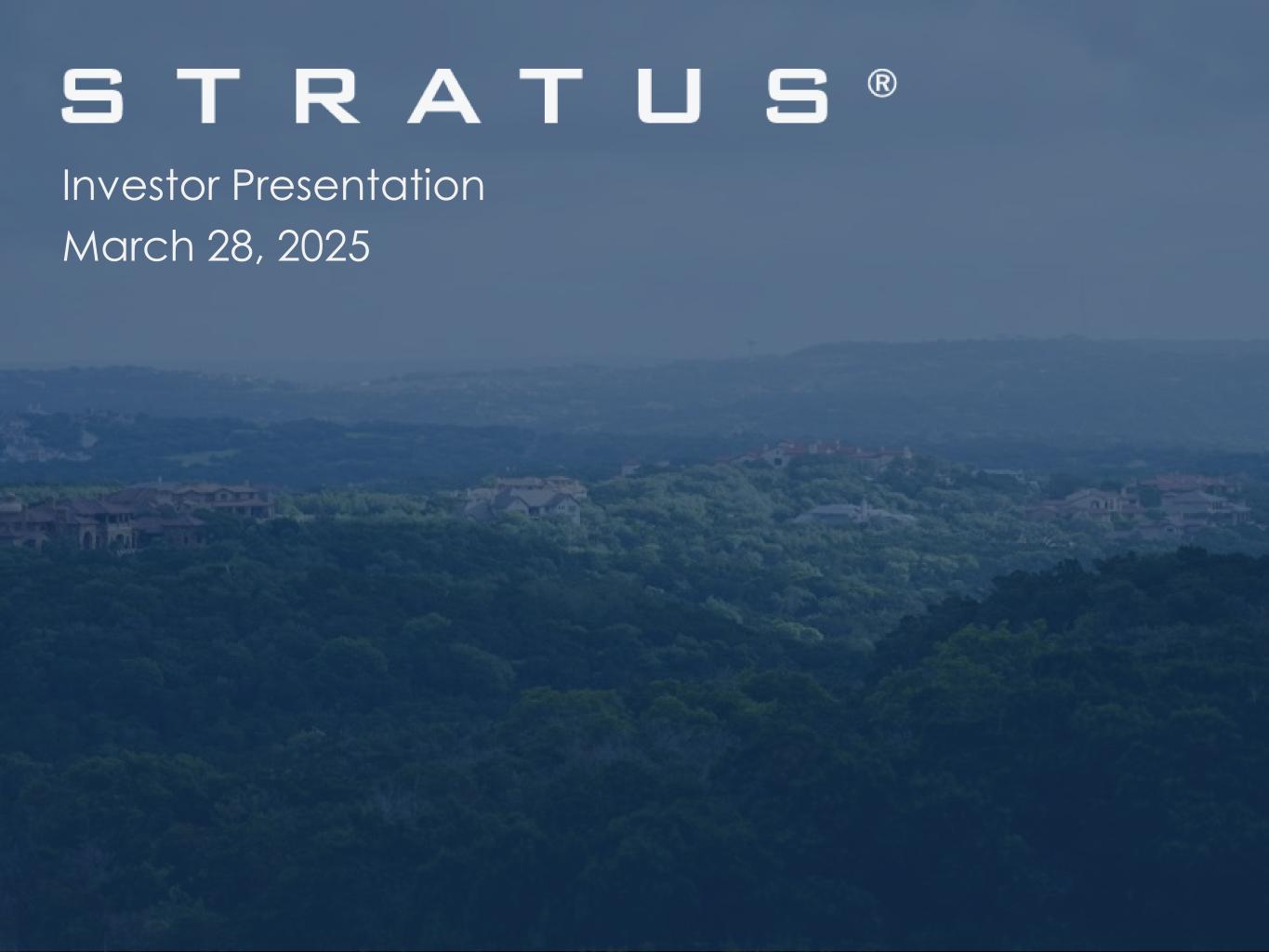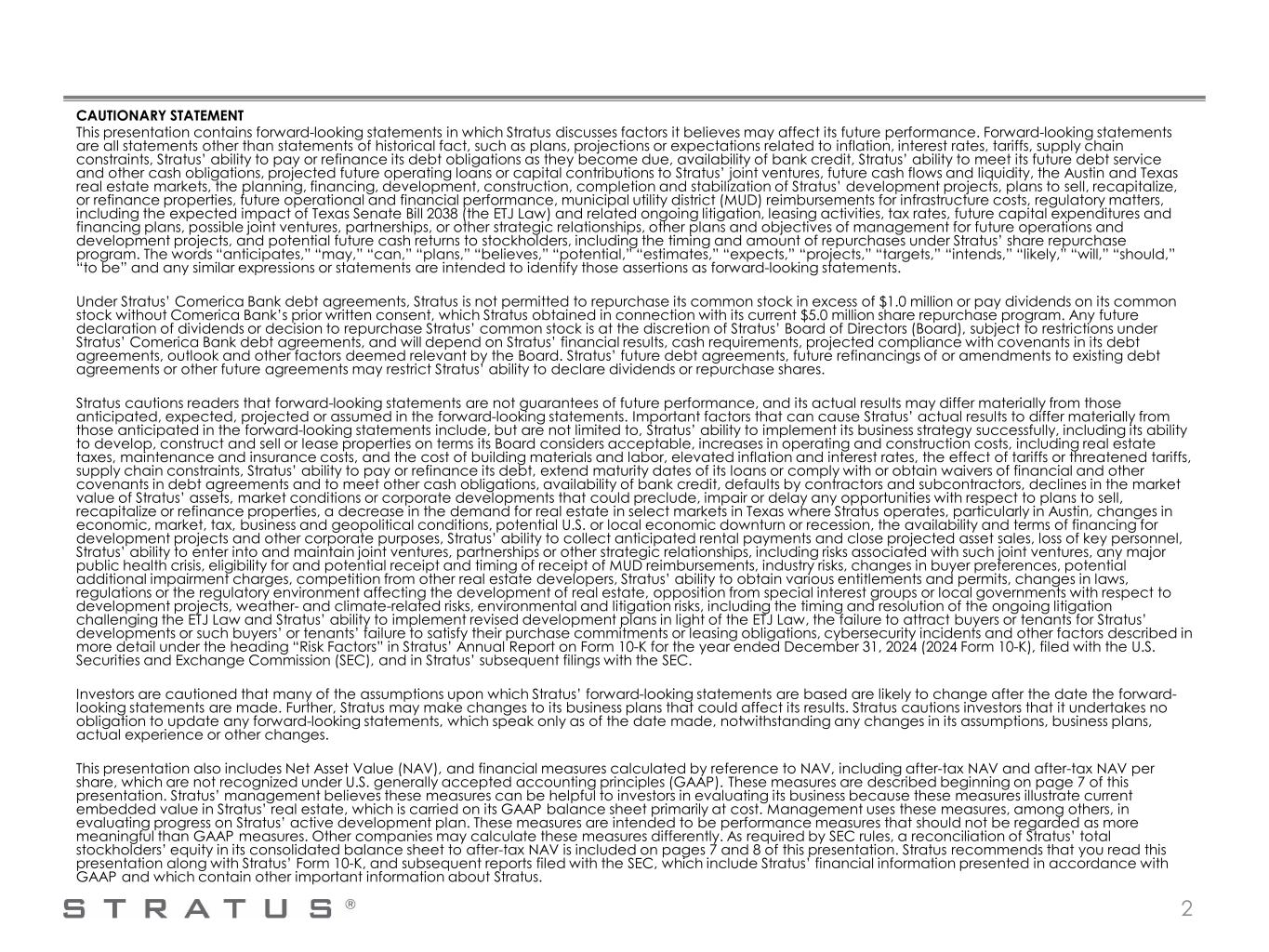 CAUTIONARY STATEMENT This presentation contains forward-looking statements in which Stratus discusses factors it believes may affect its future performance. Forward-looking statements are all statements other than statements of historical fact, such as plans, projections or expectations related to inflation, interest rates, tariffs, supply chain constraints, Stratus’ ability to pay or refinance its debt obligations as they become due, availability of bank credit, Stratus’ ability to meet its future debt service and other cash obligations, projected future operating loans or capital contributions to Stratus’ joint ventures, future cash flows and liquidity, the Austin and Texas real estate markets, the planning, financing, development, construction, completion and stabilization of Stratus’ development projects, plans to sell, recapitalize, or refinance properties, future operational and financial performance, municipal utility district (MUD) reimbursements for infrastructure costs, regulatory matters, including the expected impact of Texas Senate Bill 2038 (the ETJ Law) and related ongoing litigation, leasing activities, tax rates, future capital expenditures and financing plans, possible joint ventures, partnerships, or other strategic relationships, other plans and objectives of management for future operations and development projects, and potential future cash returns to stockholders, including the timing and amount of repurchases under Stratus’ share repurchase program. The words “anticipates,” “may,” “can,” “plans,” “believes,” “potential,” “estimates,” “expects,” “projects,” “targets,” “intends,” “likely,” “will,” “should,” “to be” and any similar expressions or statements are intended to identify those assertions as forward-looking statements. Under Stratus’ Comerica Bank debt agreements, Stratus is not permitted to repurchase its common stock in excess of $1.0 million or pay dividends on its common stock without Comerica Bank’s prior written consent, which Stratus obtained in connection with its current $5.0 million share repurchase program. Any future declaration of dividends or decision to repurchase Stratus’ common stock is at the discretion of Stratus’ Board of Directors (Board), subject to restrictions under Stratus’ Comerica Bank debt agreements, and will depend on Stratus’ financial results, cash requirements, projected compliance with covenants in its debt agreements, outlook and other factors deemed relevant by the Board. Stratus’ future debt agreements, future refinancings of or amendments to existing debt agreements or other future agreements may restrict Stratus’ ability to declare dividends or repurchase shares. Stratus cautions readers that forward-looking statements are not guarantees of future performance, and its actual results may differ materially from those anticipated, expected, projected or assumed in the forward-looking statements. Important factors that can cause Stratus’ actual results to differ materially from those anticipated in the forward-looking statements include, but are not limited to, Stratus’ ability to implement its business strategy successfully, including its ability to develop, construct and sell or lease properties on terms its Board considers acceptable, increases in operating and construction costs, including real estate taxes, maintenance and insurance costs, and the cost of building materials and labor, elevated inflation and interest rates, the effect of tariffs or threatened tariffs, supply chain constraints, Stratus’ ability to pay or refinance its debt, extend maturity dates of its loans or comply with or obtain waivers of financial and other covenants in debt agreements and to meet other cash obligations, availability of bank credit, defaults by contractors and subcontractors, declines in the market value of Stratus’ assets, market conditions or corporate developments that could preclude, impair or delay any opportunities with respect to plans to sell, recapitalize or refinance properties, a decrease in the demand for real estate in select markets in Texas where Stratus operates, particularly in Austin, changes in economic, market, tax, business and geopolitical conditions, potential U.S. or local economic downturn or recession, the availability and terms of financing for development projects and other corporate purposes, Stratus’ ability to collect anticipated rental payments and close projected asset sales, loss of key personnel, Stratus’ ability to enter into and maintain joint ventures, partnerships or other strategic relationships, including risks associated with such joint ventures, any major public health crisis, eligibility for and potential receipt and timing of receipt of MUD reimbursements, industry risks, changes in buyer preferences, potential additional impairment charges, competition from other real estate developers, Stratus’ ability to obtain various entitlements and permits, changes in laws, regulations or the regulatory environment affecting the development of real estate, opposition from special interest groups or local governments with respect to development projects, weather- and climate-related risks, environmental and litigation risks, including the timing and resolution of the ongoing litigation challenging the ETJ Law and Stratus’ ability to implement revised development plans in light of the ETJ Law, the failure to attract buyers or tenants for Stratus’ developments or such buyers’ or tenants’ failure to satisfy their purchase commitments or leasing obligations, cybersecurity incidents and other factors described in more detail under the heading “Risk Factors” in Stratus’ Annual Report on Form 10-K for the year ended December 31, 2024 (2024 Form 10-K), filed with the U.S. Securities and Exchange Commission (SEC), and in Stratus’ subsequent filings with the SEC. Investors are cautioned that m