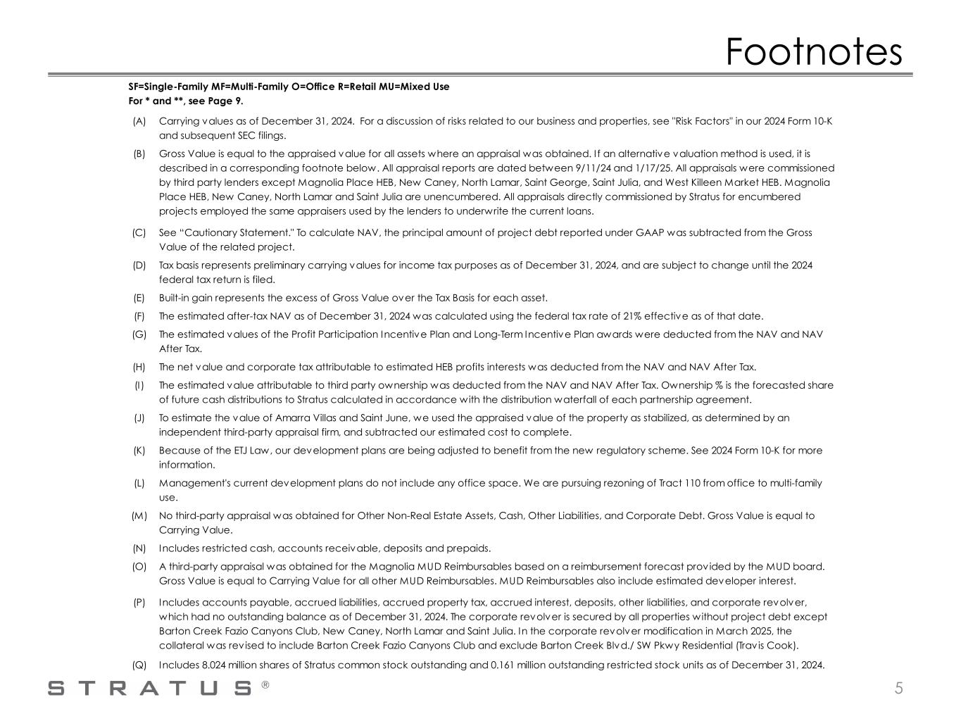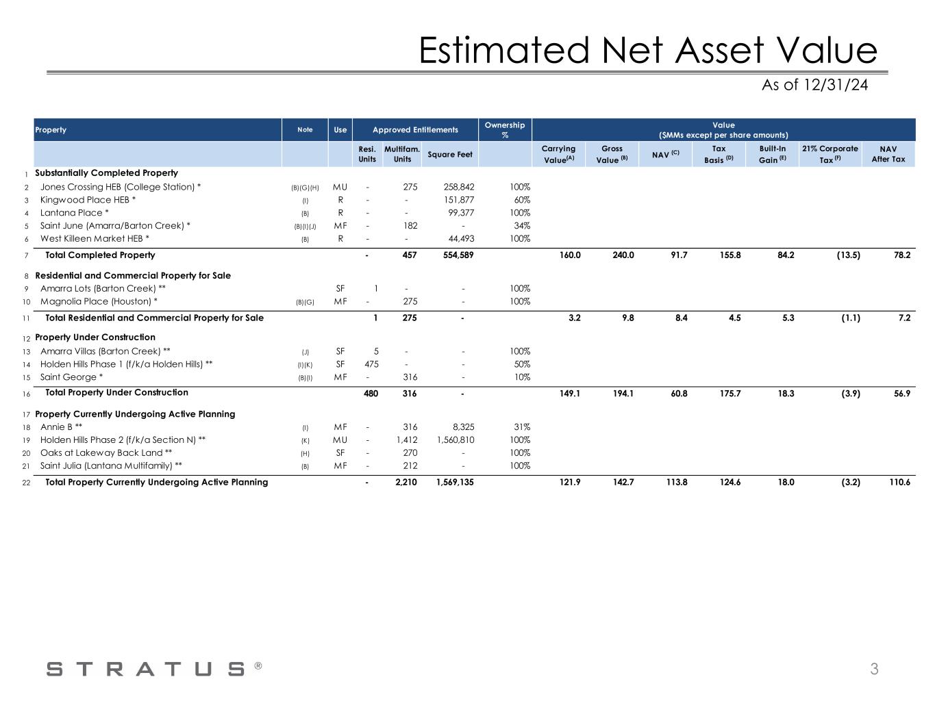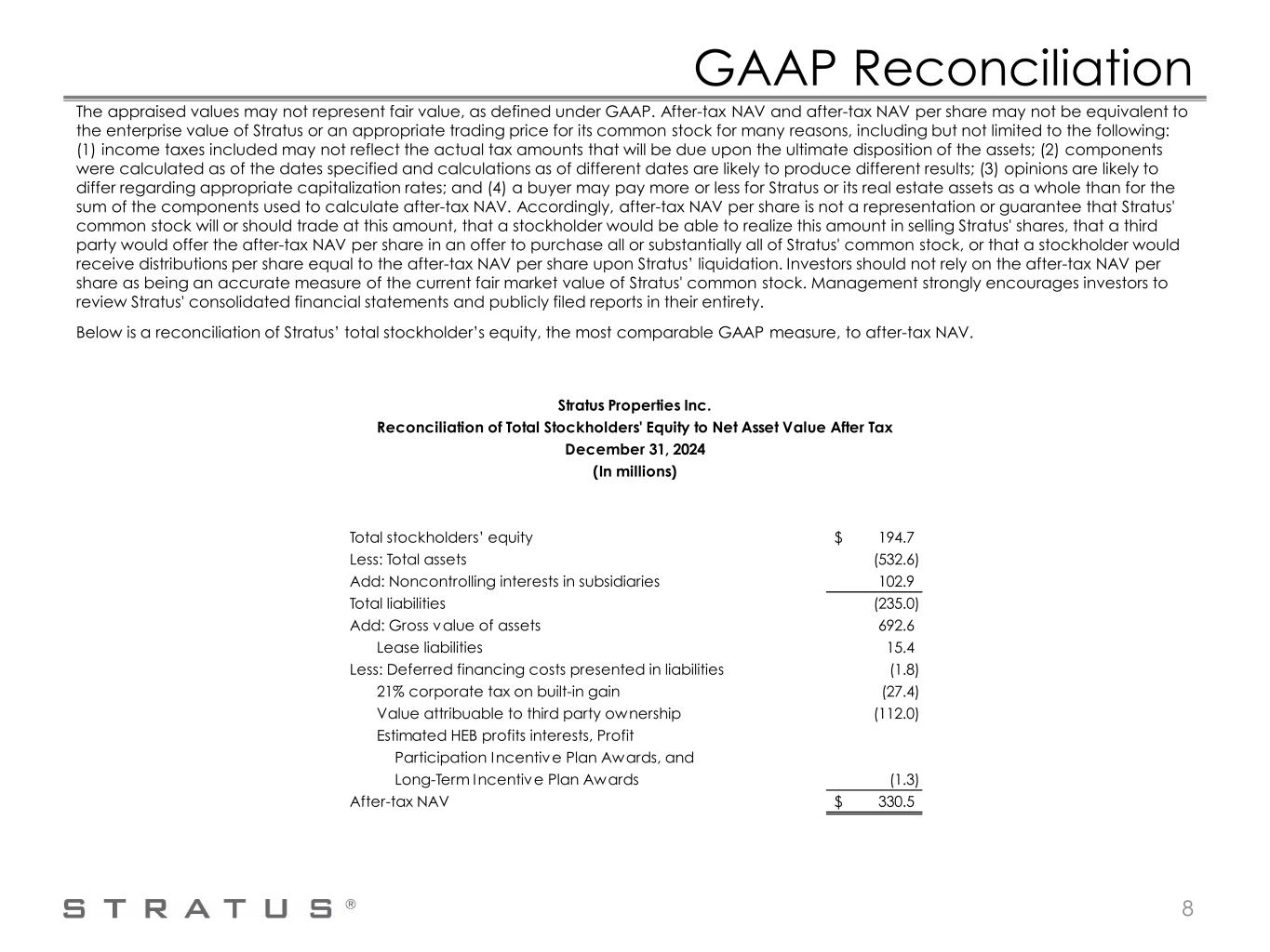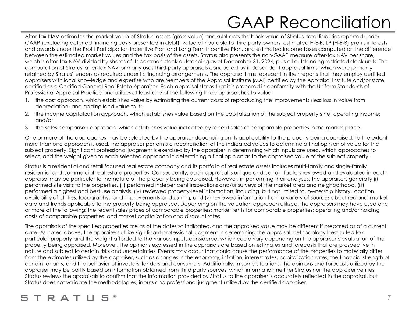 GAAP Reconciliation After-tax NAV estimates the market value of Stratus' assets (gross value) and subtracts the book value of Stratus' total liabilities reported under GAAP (excluding deferred financing costs presented in debt), value attributable to third party owners, estimated H-E-B, LP (H-E-B) profits interests and awards under the Profit Participation Incentive Plan and Long Term Incentive Plan, and estimated income taxes computed on the difference between the estimated market values and the tax basis of the assets. Stratus also presents the non-GAAP measure after-tax NAV per share, which is after-tax NAV divided by shares of its common stock outstanding as of December 31, 2024, plus all outstanding restricted stock units. The computation of Stratus' after-tax NAV primarily uses third-party appraisals conducted by independent appraisal firms, which were primarily retained by Stratus' lenders as required under its financing arrangements. The appraisal firms represent in their reports that they employ certified appraisers with local knowledge and expertise who are Members of the Appraisal Institute (MAI) certified by the Appraisal Institute and/or state certified as a Certified General Real Estate Appraiser. Each appraisal states that it is prepared in conformity with the Uniform Standards of Professional Appraisal Practice and utilizes at least one of the following three approaches to value: 1. the cost approach, which establishes value by estimating the current costs of reproducing the improvements (less loss in value from depreciation) and adding land value to it; 2. the income capitalization approach, which establishes value based on the capitalization of the subject property’s net operating income; and/or 3. the sales comparison approach, which establishes value indicated by recent sales of comparable properties in the market place. One or more of the approaches may be selected by the appraiser depending on its applicability to the property being appraised. To the extent more than one approach is used, the appraiser performs a reconciliation of the indicated values to determine a final opinion of value for the subject property. Significant professional judgment is exercised by the appraiser in determining which inputs are used, which approaches to select, and the weight given to each selected approach in determining a final opinion as to the appraised value of the subject property. Stratus is a residential and retail focused real estate company and its portfolio of real estate assets includes multi-family and single-family residential and commercial real estate properties. Consequently, each appraisal is unique and certain factors reviewed and evaluated in each appraisal may be particular to the nature of the property being appraised. However, in performing their analyses, the appraisers generally (i) performed site visits to the properties, (ii) performed independent inspections and/or surveys of the market area and neighborhood, (iii) performed a highest and best use analysis, (iv) reviewed property-level information, including, but not limited to, ownership history, location, availability of utilities, topography, land improvements and zoning, and (v) reviewed information from a variety of sources about regional market data and trends applicable to the property being appraised. Depending on the valuation approach utilized, the appraisers may have used one or more of the following: the recent sales prices of comparable properties; market rents for comparable properties; operating and/or holding costs of comparable properties; and market capitalization and discount rates. The appraisals of the specified properties are as of the dates so indicated, and the appraised value may be different if prepared as of a current date. As noted above, the appraisers utilize significant professional judgment in determining the appraisal methodology best suited to a particular property and the weight afforded to the various inputs considered, which could vary depending on the appraiser’s evaluation of the property being appraised. Moreover, the opinions expressed in the appraisals are based on estimates and forecasts that are prospective in nature and subject to certain risks and uncertainties. Events may occur that could cause the performance of the properties to materially differ from the estimates utilized by the appraiser, such as changes in the economy, inflation, interest rates, capitalization rates, the financial strength of certain tenants, and the behavior of investors, lenders and consumers. Additionally, in some situations, the opinions and forecasts utilized by the appraiser may be partly based on information obtained from third party sources, which information neither Stratus nor the appraiser verifies. Stratus reviews the appraisals to confirm that the information provided by Stratus to the appraiser is accurately reflected in the appraisal, but Stratus does not validate the methodologies, inputs and professional judgment utilized by the certified appraiser. 7