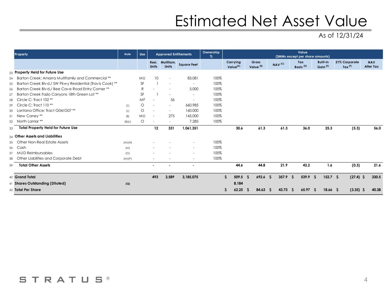 Estimated Net Asset Value 3 As of 12/31/24 Property Note Use Ownership % Value ($MMs except per share amounts) 1 Substantially Completed Property 2 Jones Crossing HEB (College Station) * (B)(G)(H) MU - 275 258,842 100% 3 Kingwood Place HEB * (I) R - - 151,877 60% 4 Lantana Place * (B) R - - 99,377 100% 5 Saint June (Amarra/Barton Creek) * (B)(I)(J) MF - 182 - 34% 6 West Killeen Market HEB * (B) R - - 44,493 100% 7 Total Completed Property - 457 554,589 160.0 240.0 91.7 155.8 84.2 (13.5) 78.2 8 Residential and Commercial Property for Sale 9 Amarra Lots (Barton Creek) ** SF 1 - - 100% 10 Magnolia Place (Houston) * (B)(G) MF - 275 - 100% 11 Total Residential and Commercial Property for Sale 1 275 - 3.2 9.8 8.4 4.5 5.3 (1.1) 7.2 12 Property Under Construction 13 Amarra Villas (Barton Creek) ** (J) SF 5 - - 100% 14 Holden Hills Phase 1 (f/k/a Holden Hills) ** (I)(K) SF 475 - - 50% 15 Saint George * (B)(I) MF - 316 - 10% 16 Total Property Under Construction 480 316 - 149.1 194.1 60.8 175.7 18.3 (3.9) 56.9 17 Property Currently Undergoing Active Planning 18 Annie B ** (I) MF - 316 8,325 31% 19 Holden Hills Phase 2 (f/k/a Section N) ** (K) MU - 1,412 1,560,810 100% 20 Oaks at Lakeway Back Land ** (H) SF - 270 - 100% 21 Saint Julia (Lantana Multifamily) ** (B) MF - 212 - 100% 22 Total Property Currently Undergoing Active Planning - 2,210 1,569,135 121.9 142.7 113.8 124.6 18.0 (3.2) 110.6 NAV (C) Tax Basis (D) Built-In Gain (E) 21% Corporate Tax (F) NAV After Tax Approved Entitlements Resi. Units Multifam. Units Square Feet Carrying Value(A) Gross Value (B)