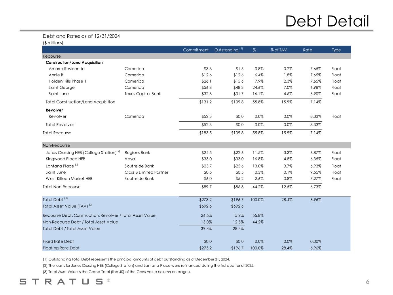 Footnotes 5 SF=Single-Family MF=Multi-Family O=Office R=Retail MU=Mixed Use For * and **, see Page 9. (A) Carrying values as of December 31, 2024. For a discussion of risks related to our business and properties, see "Risk Factors" in our 2024 Form 10-K and subsequent SEC filings. (B) Gross Value is equal to the appraised value for all assets where an appraisal was obtained. I f an alternative valuation method is used, it is described in a corresponding footnote below. All appraisal reports are dated between 9/11/24 and 1/17/25. All appraisals were commissioned by third party lenders except Magnolia Place HEB, New Caney, North Lamar, Saint George, Saint Julia, and West Killeen Market HEB. Magnolia Place HEB, New Caney, North Lamar and Saint Julia are unencumbered. All appraisals directly commissioned by Stratus for encumbered projects employed the same appraisers used by the lenders to underwrite the current loans. (C) See “Cautionary Statement." To calculate NAV, the principal amount of project debt reported under GAAP was subtracted from the Gross Value of the related project. (D) Tax basis represents preliminary carrying values for income tax purposes as of December 31, 2024, and are subject to change until the 2024 federal tax return is filed. (E) Built-in gain represents the excess of Gross Value over the Tax Basis for each asset. (F) The estimated after-tax NAV as of December 31, 2024 was calculated using the federal tax rate of 21% effective as of that date. (G) The estimated values of the Profit Participation Incentive Plan and Long-Term Incentive Plan awards were deducted from the NAV and NAV After Tax. (H) The net value and corporate tax attributable to estimated HEB profits interests was deducted from the NAV and NAV After Tax. (I ) The estimated value attributable to third party ownership was deducted from the NAV and NAV After Tax. Ownership % is the forecasted share of future cash distributions to Stratus calculated in accordance with the distribution waterfall of each partnership agreement. (J) To estimate the value of Amarra Villas and Saint June, we used the appraised value of the property as stabilized, as determined by an independent third-party appraisal firm, and subtracted our estimated cost to complete. (K) Because of the ETJ Law, our development plans are being adjusted to benefit from the new regulatory scheme. See 2024 Form 10-K for more information. (L) Management's current development plans do not include any office space. We are pursuing rezoning of Tract 110 from office to multi-family use. (M) No third-party appraisal was obtained for Other Non-Real Estate Assets, Cash, Other Liabilities, and Corporate Debt. Gross Value is equal to Carrying Value. (N) Includes restricted cash, accounts receivable, deposits and prepaids. (O) A third-party appraisal was obtained for the Magnolia MUD Reimbursables based on a reimbursement forecast prov ided by the MUD board. Gross Value is equal to Carrying Value for all other MUD Reimbursables. MUD Reimbursables also include estimated developer interest. (P) Includes accounts payable, accrued liabilities, accrued property tax, accrued interest, deposits, other liabilities, and corporate revolver, which had no outstanding balance as of December 31, 2024. The corporate revolver is secured by all properties without project debt except Barton Creek Fazio Canyons Club, New Caney, North Lamar and Saint Julia. In the corporate revolver modification in March 2025, the collateral was rev ised to include Barton Creek Fazio Canyons Club and exclude Barton Creek Blvd./ SW Pkwy Residential (Trav is Cook). (Q) Includes 8.024 million shares of Stratus common stock outstanding and 0.161 million outstanding restricted stock units as of December 31, 2024.