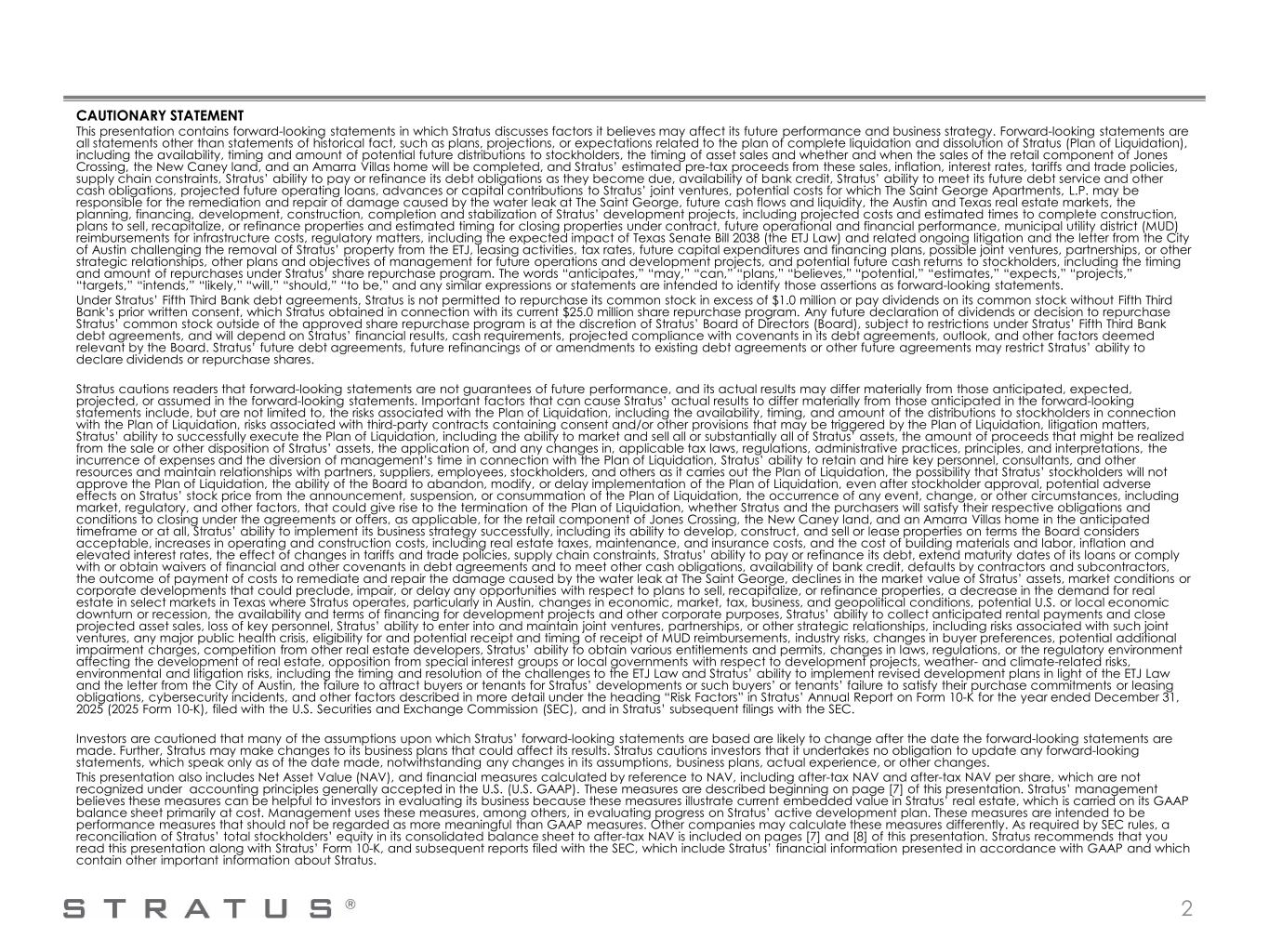 CAUTIONARY STATEMENT This presentation contains forward-looking statements in which Stratus discusses factors it believes may affect its future performance and business strategy. Forward-looking statements are all statements other than statements of historical fact, such as plans, projections, or expectations related to the plan of complete liquidation and dissolution of Stratus (Plan of Liquidation), including the availability, timing and amount of potential future distributions to stockholders, the timing of asset sales and whether and when the sales of the retail component of Jones Crossing, the New Caney land, and an Amarra Villas home will be completed, and Stratus’ estimated pre-tax proceeds from these sales, inflation, interest rates, tariffs and trade policies, supply chain constraints, Stratus’ ability to pay or refinance its debt obligations as they become due, availability of bank credit, Stratus’ ability to meet its future debt service and other cash obligations, projected future operating loans, advances or capital contributions to Stratus’ joint ventures, potential costs for which The Saint George Apartments, L.P. may be responsible for the remediation and repair of damage caused by the water leak at The Saint George, future cash flows and liquidity, the Austin and Texas real estate markets, the planning, financing, development, construction, completion and stabilization of Stratus’ development projects, including projected costs and estimated times to complete construction, plans to sell, recapitalize, or refinance properties and estimated timing for closing properties under contract, future operational and financial performance, municipal utility district (MUD) reimbursements for infrastructure costs, regulatory matters, including the expected impact of Texas Senate Bill 2038 (the ETJ Law) and related ongoing litigation and the letter from the City of Austin challenging the removal of Stratus’ property from the ETJ, leasing activities, tax rates, future capital expenditures and financing plans, possible joint ventures, partnerships, or other strategic relationships, other plans and objectives of management for future operations and development projects, and potential future cash returns to stockholders, including the timing and amount of repurchases under Stratus’ share repurchase program. The words “anticipates,” “may,” “can,” “plans,” “believes,” “potential,” “estimates,” “expects,” “projects,” “targets,” “intends,” “likely,” “will,” “should,” “to be,” and any similar expressions or statements are intended to identify those assertions as forward-looking statements. Under Stratus’ Fifth Third Bank debt agreements, Stratus is not permitted to repurchase its common stock in excess of $1.0 million or pay dividends on its common stock without Fifth Third Bank’s prior written consent, which Stratus obtained in connection with its current $25.0 million share repurchase program. Any future declaration of dividends or decision to repurchase Stratus’ common stock outside of the approved share repurchase program is at the discretion of Stratus’ Board of Directors (Board), subject to restrictions under Stratus’ Fifth Third Bank debt agreements, and will depend on Stratus’ financial results, cash requirements, projected compliance with covenants in its debt agreements, outlook, and other factors deemed relevant by the Board. Stratus’ future debt agreements, future refinancings of or amendments to existing debt agreements or other future agreements may restrict Stratus’ ability to declare dividends or repurchase shares. Stratus cautions readers that forward-looking statements are not guarantees of future performance, and its actual results may differ materially from those anticipated, expected, projected, or assumed in the forward-looking statements. Important factors that can cause Stratus’ actual results to differ materially from those anticipated in the forward-looking statements include, but are not limited to, the risks associated with the Plan of Liquidation, including the availability, timing, and amount of the distributions to stockholders in connection with the Plan of Liquidation, risks associated with third-party contracts containing consent and/or other provisions that may be triggered by the Plan of Liquidation, litigation matters, Stratus’ ability to successfully execute the Plan of Liquidation, including the ability to market and sell all or substantially all of Stratus’ assets, the amount of proceeds that might be realized from the sale or other disposition of Stratus’ assets, the application of, and any changes in, applicable tax laws, regulations, administrative practices, principles, and interpretations, the incurrence of expenses and the diversion of management’s time in connection with the Plan of Liquidation, Stratus’ ability to retain and hire key personnel, consultants, and other resources and maintain relationships with partners, suppliers, employees, stockholders, and others as it carries out the Plan of Liquidation, the possibility that Stratus’ stockholders will not approve the Plan of Liquidation, the ability of the Board to abandon, modify, or delay implementation of the Plan of Liquidation, even after stockholder approval, potential adverse effects on Stratus’ stock price from the announcement, suspension, or consummation of the Plan of Liquidation, the occurrence of any event, change, or other circumstances, including market, regulatory, and other factors, that could give rise to the termination of the Plan of Liquidation, whether Stratus and the purchasers will satisfy their respective obligations and conditions to closing under the agreements or offers, as applicable, for the retail component of Jones Crossing, the New Caney land, and an Amarra Villas home in the anticipated timeframe or at all, Stratus’ ability to implement its business strate