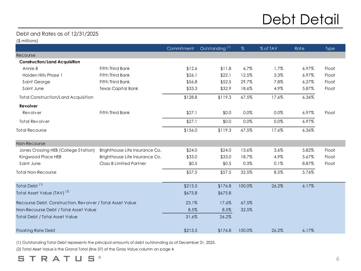 Debt Detail 6 Debt and Rates as of 12/31/2025 ($ millions) Commitment Outstanding (1) % % of TAV Rate Type Recourse Construction/Land Acquisition Annie B Fifth Third Bank $12.6 $11.8 6.7% 1.7% 6.97% Float Holden Hills Phase 1 Fifth Third Bank $26.1 $22.1 12.5% 3.3% 6.97% Float Saint George Fifth Third Bank $56.8 $52.5 29.7% 7.8% 6.27% Float Saint June Texas Capital Bank $33.3 $32.9 18.6% 4.9% 5.87% Float Total Construction/Land Acquisition $128.8 $119.3 67.5% 17.6% 6.36% Revolver Revolver Fifth Third Bank $27.1 $0.0 0.0% 0.0% 6.97% Float Total Revolver $27.1 $0.0 0.0% 0.0% 6.97% Total Recourse $156.0 $119.3 67.5% 17.6% 6.36% Non-Recourse Jones Crossing HEB (College Station) Brighthouse Life Insurance Co. $24.0 $24.0 13.6% 3.6% 5.82% Float Kingwood Place HEB Brighthouse Life Insurance Co. $33.0 $33.0 18.7% 4.9% 5.67% Float Saint June Class B Limited Partner $0.5 $0.5 0.3% 0.1% 8.87% Float Total Non-Recourse $57.5 $57.5 32.5% 8.5% 5.76% Total Debt (1) $213.5 $176.8 100.0% 26.2% 6.17% Total Asset Value (TAV) (2) $675.8 $675.8 Recourse Debt, Construction, Revolver / Total Asset Value 23.1% 17.6% 67.5% Non-Recourse Debt / Total Asset Value 8.5% 8.5% 32.5% Total Debt / Total Asset Value 31.6% 26.2% Floating Rate Debt $213.5 $176.8 100.0% 26.2% 6.17% (1) Outstanding Total Debt represents the principal amounts of debt outstanding as of December 31, 2025. (2) Total Asset Value is the Grand Total (line 37) of the Gross Value column on page 4.