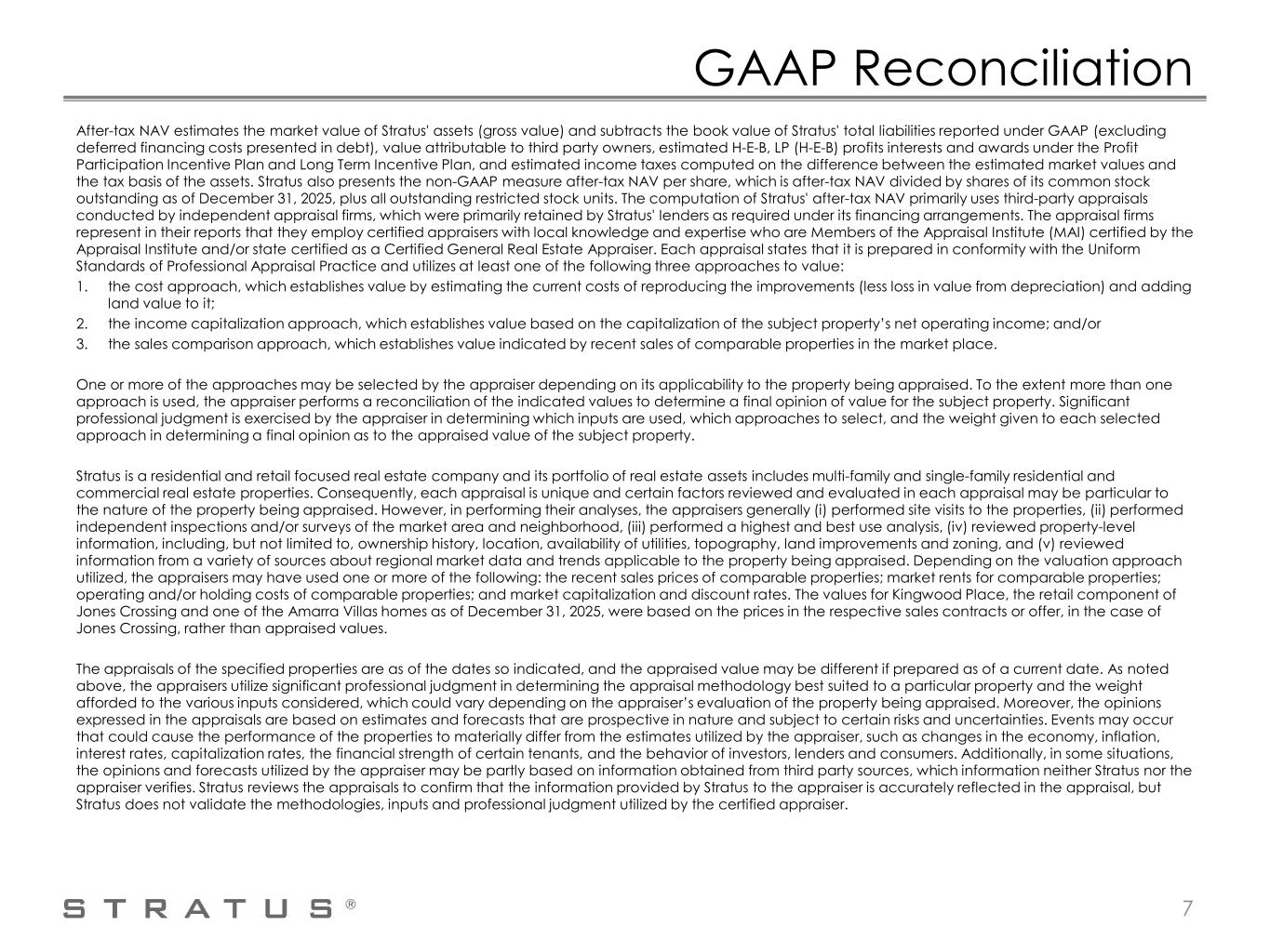 GAAP Reconciliation After-tax NAV estimates the market value of Stratus' assets (gross value) and subtracts the book value of Stratus' total liabilities reported under GAAP (excluding deferred financing costs presented in debt), value attributable to third party owners, estimated H-E-B, LP (H-E-B) profits interests and awards under the Profit Participation Incentive Plan and Long Term Incentive Plan, and estimated income taxes computed on the difference between the estimated market values and the tax basis of the assets. Stratus also presents the non-GAAP measure after-tax NAV per share, which is after-tax NAV divided by shares of its common stock outstanding as of December 31, 2025, plus all outstanding restricted stock units. The computation of Stratus' after-tax NAV primarily uses third-party appraisals conducted by independent appraisal firms, which were primarily retained by Stratus' lenders as required under its financing arrangements. The appraisal firms represent in their reports that they employ certified appraisers with local knowledge and expertise who are Members of the Appraisal Institute (MAI) certified by the Appraisal Institute and/or state certified as a Certified General Real Estate Appraiser. Each appraisal states that it is prepared in conformity with the Uniform Standards of Professional Appraisal Practice and utilizes at least one of the following three approaches to value: 1. the cost approach, which establishes value by estimating the current costs of reproducing the improvements (less loss in value from depreciation) and adding land value to it; 2. the income capitalization approach, which establishes value based on the capitalization of the subject property’s net operating income; and/or 3. the sales comparison approach, which establishes value indicated by recent sales of comparable properties in the market place. One or more of the approaches may be selected by the appraiser depending on its applicability to the property being appraised. To the extent more than one approach is used, the appraiser performs a reconciliation of the indicated values to determine a final opinion of value for the subject property. Significant professional judgment is exercised by the appraiser in determining which inputs are used, which approaches to select, and the weight given to each selected approach in determining a final opinion as to the appraised value of the subject property. Stratus is a residential and retail focused real estate company and its portfolio of real estate assets includes multi-family and single-family residential and commercial real estate properties. Consequently, each appraisal is unique and certain factors reviewed and evaluated in each appraisal may be particular to the nature of the property being appraised. However, in performing their analyses, the appraisers generally (i) performed site visits to the properties, (ii) performed independent inspections and/or surveys of the market area and neighborhood, (iii) performed a highest and best use analysis, (iv) reviewed property-level information, including, but not limited to, ownership history, location, availability of utilities, topography, land improvements and zoning, and (v) reviewed information from a variety of sources about regional market data and trends applicable to the property being appraised. Depending on the valuation approach utilized, the appraisers may have used one or more of the following: the recent sales prices of comparable properties; market rents for comparable properties; operating and/or holding costs of comparable properties; and market capitalization and discount rates. The values for Kingwood Place, the retail component of Jones Crossing and one of the Amarra Villas homes as of December 31, 2025, were based on the prices in the respective sales contracts or offer, in the case of Jones Crossing, rather than appraised values. The appraisals of the specified properties are as of the dates so indicated, and the appraised value may be different if prepared as of a current date. As noted above, the appraisers utilize significant professional judgment in determining the appraisal methodology best suited to a particular property and the weight afforded to the various inputs considered, which could vary depending on the appraiser’s evaluation of the property being appraised. Moreover, the opinions expressed in the appraisals are based on estimates and forecasts that are prospective in nature and subject to certain risks and uncertainties. Events may occur that could cause the performance of the properties to materially differ from the estimates utilized by the appraiser, such as changes in the economy, inflation, interest rates, capitalization rates, the financial strength of certain tenants, and the behavior of investors, lenders and consumers. Additionally, in some situations, the opinions and forecasts utilized by the appraiser may be partly based on information obtained from third party sources, which information neither Stratus nor the appraiser verifies. Stratus reviews the appraisals to confirm that the information provided by Stratus to the appraiser is accurately reflected in the appraisal, but Stratus does not validate the methodologies, inputs and professional judgment utilized by the certified appraiser. 7