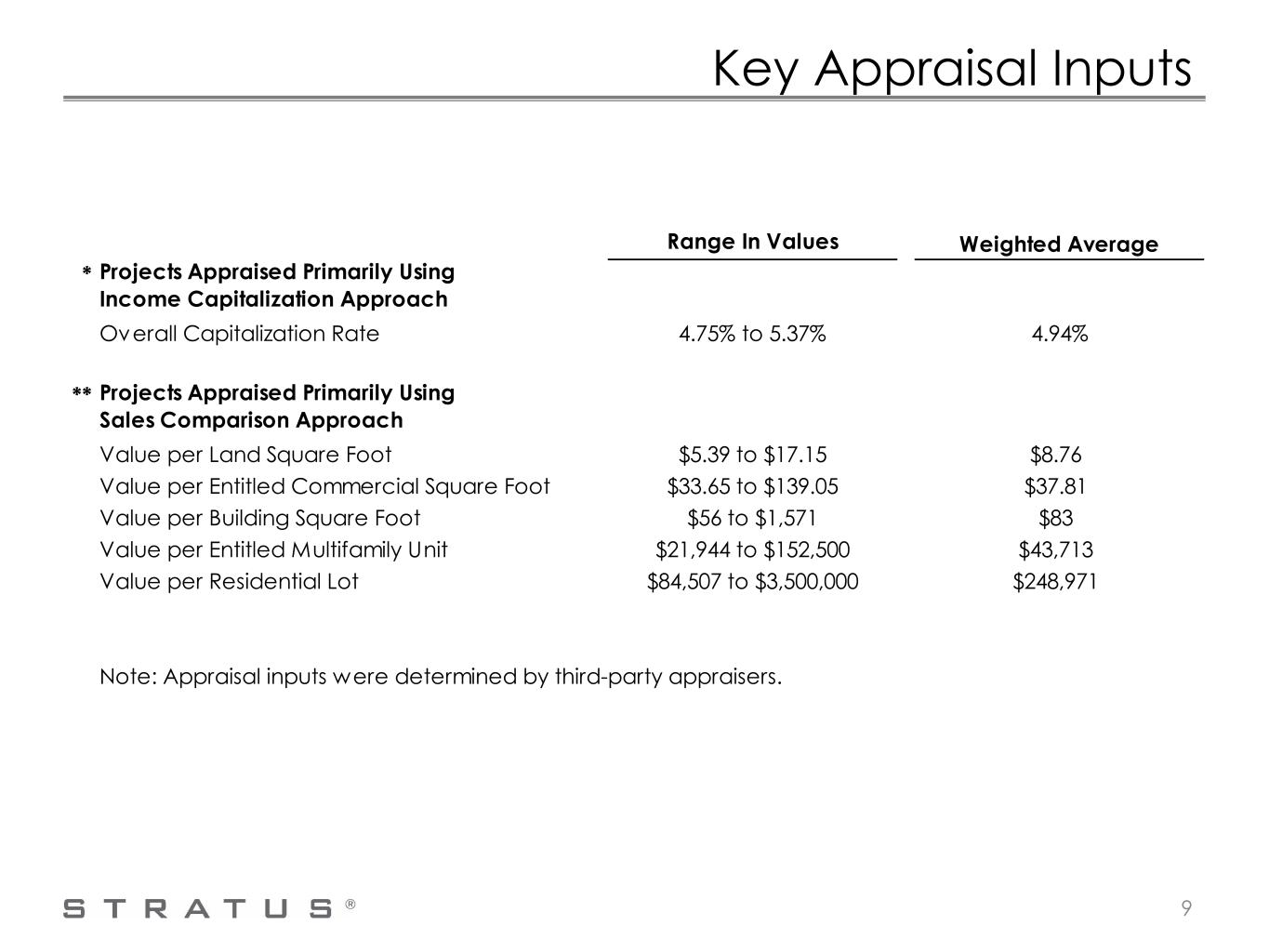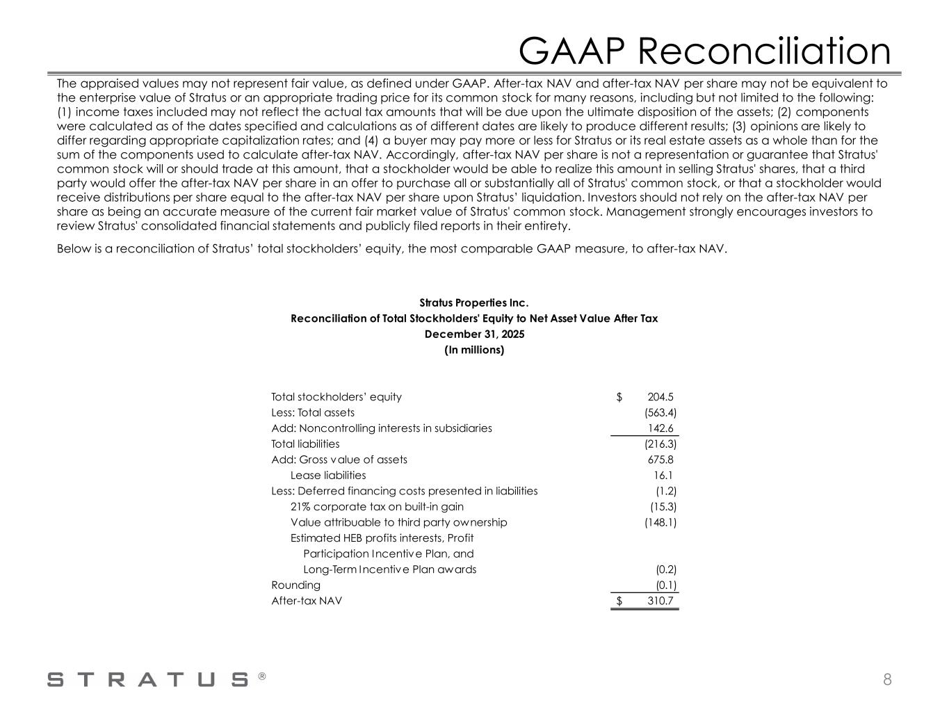 GAAP Reconciliation The appraised values may not represent fair value, as defined under GAAP. After-tax NAV and after-tax NAV per share may not be equivalent to the enterprise value of Stratus or an appropriate trading price for its common stock for many reasons, including but not limited to the following: (1) income taxes included may not reflect the actual tax amounts that will be due upon the ultimate disposition of the assets; (2) components were calculated as of the dates specified and calculations as of different dates are likely to produce different results; (3) opinions are likely to differ regarding appropriate capitalization rates; and (4) a buyer may pay more or less for Stratus or its real estate assets as a whole than for the sum of the components used to calculate after-tax NAV. Accordingly, after-tax NAV per share is not a representation or guarantee that Stratus' common stock will or should trade at this amount, that a stockholder would be able to realize this amount in selling Stratus' shares, that a third party would offer the after-tax NAV per share in an offer to purchase all or substantially all of Stratus' common stock, or that a stockholder would receive distributions per share equal to the after-tax NAV per share upon Stratus’ liquidation. Investors should not rely on the after-tax NAV per share as being an accurate measure of the current fair market value of Stratus' common stock. Management strongly encourages investors to review Stratus' consolidated financial statements and publicly filed reports in their entirety. Below is a reconciliation of Stratus’ total stockholders’ equity, the most comparable GAAP measure, to after-tax NAV. 8 Total stockholders’ equity 204.5$ Less: Total assets (563.4) Add: Noncontrolling interests in subsidiaries 142.6 Total liabilities (216.3) Add: Gross value of assets 675.8 Lease liabilities 16.1 Less: Deferred financing costs presented in liabilities (1.2) 21% corporate tax on built-in gain (15.3) Value attribuable to third party ownership (148.1) Estimated HEB profits interests, Profit Participation Incentive Plan, and Long-Term Incentive Plan awards (0.2) Rounding (0.1) After-tax NAV 310.7$ Stratus Properties Inc. Reconciliation of Total Stockholders' Equity to Net Asset Value After Tax December 31, 2025 (In millions)