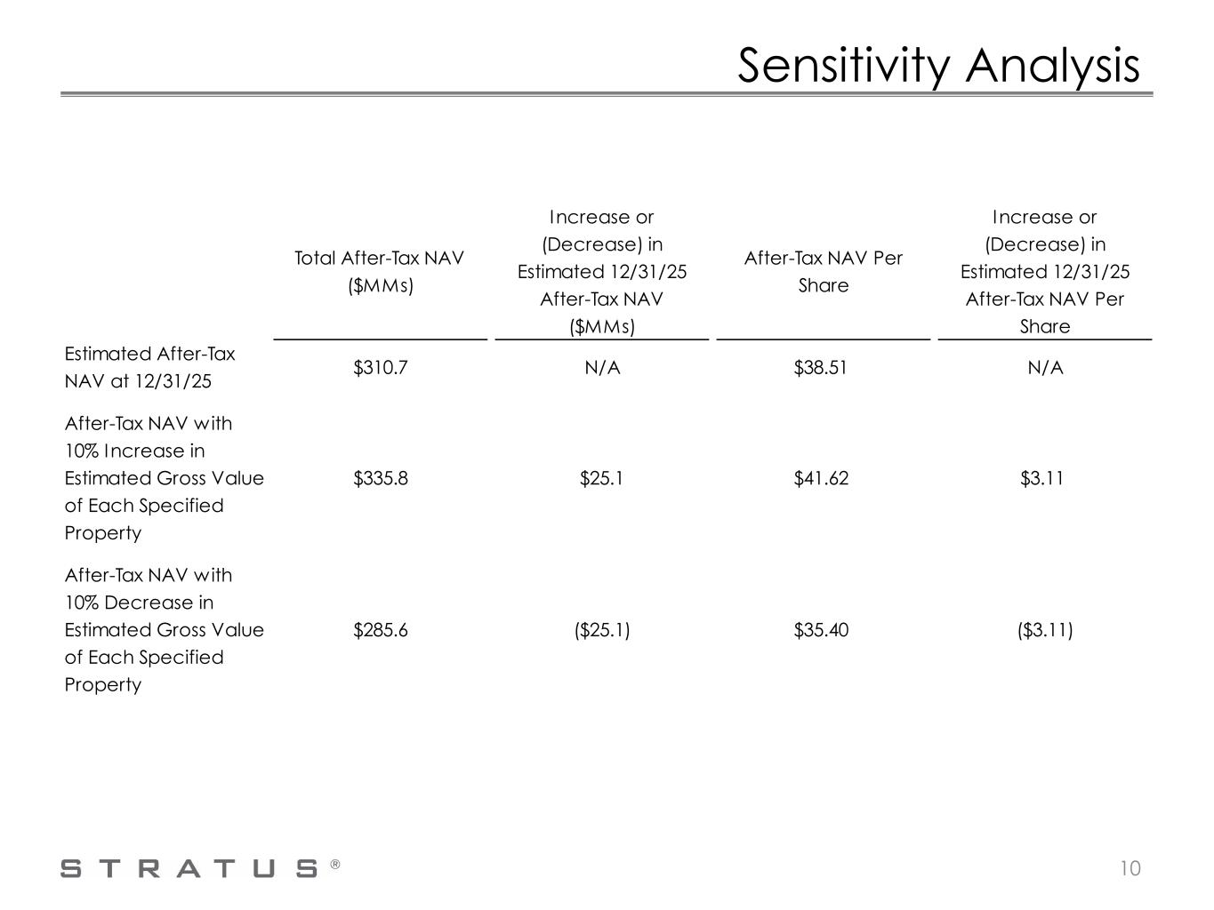 Sensitivity Analysis 10 Total After-Tax NAV ($MMs) Increase or (Decrease) in Estimated 12/31/25 After-Tax NAV ($MMs) After-Tax NAV Per Share Increase or (Decrease) in Estimated 12/31/25 After-Tax NAV Per Share Estimated After-Tax NAV at 12/31/25 $310.7 N/A $38.51 N/A After-Tax NAV with 10% Increase in Estimated Gross Value of Each Specified Property $335.8 $25.1 $41.62 $3.11 After-Tax NAV with 10% Decrease in Estimated Gross Value of Each Specified Property $285.6 ($25.1) $35.40 ($3.11)