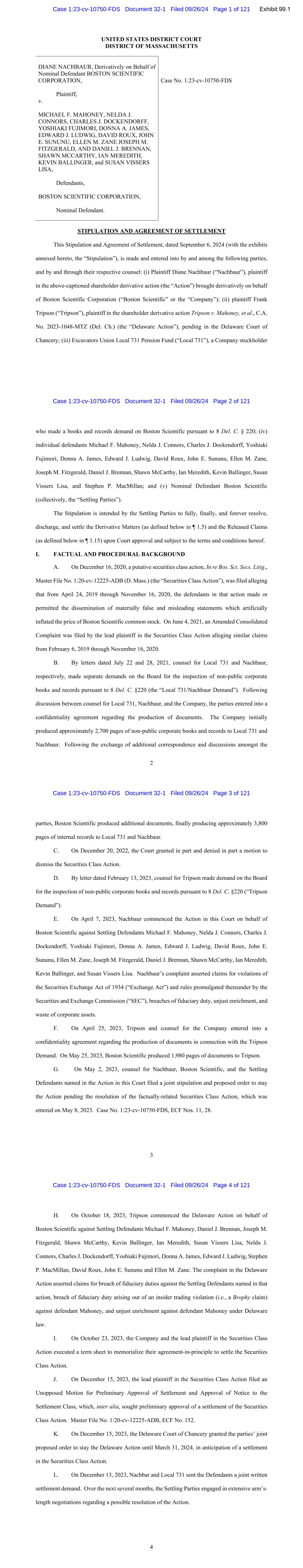 UNITED STATES DISTRICT COURT DISTRICT OF MASSACHUSETTS DIANE NACHBAUR, Derivatively on Behalf of Nominal Defendant BOSTON SCIENTIFIC CORPORATION, Plaintiff, v. MICHAEL F. MAHONEY, NELDA J. CONNORS, CHARLES J. DOCKENDORFF, YOSHIAKI FUJIMORI, DONNA A. JAMES, EDWARD J. LUDWIG, DAVID ROUX, JOHN E. SUNUNU, ELLEN M. ZANE JOSEPH M. FITZGERALD, AND DANIEL J. BRENNAN, SHAWN MCCARTHY, IAN MEREDITH, KEVIN BALLINGER, and SUSAN VISSERS LISA, Defendants, BOSTON SCIENTIFIC CORPORATION, Nominal Defendant. Case No. 1:23-cv-10750-FDS STIPULATION AND AGREEMENT OF SETTLEMENT This Stipulation and Agreement of Settlement, dated September 6, 2024 (with the exhibits annexed hereto, the “Stipulation”), is made and entered into by and among the following parties, and by and through their respective counsel: (i) Plaintiff Diane Nachbaur (“Nachbaur”), plaintiff in the above-captioned shareholder derivative action (the “Action”) brought derivatively on behalf of Boston Scientific Corporation (“Boston Scientific” or the “Company”); (ii) plaintiff Frank Tripson (“Tripson”), plaintiff in the shareholder derivative action Tripson v. Mahoney, et al., C.A. No. 2023-1048-MTZ (Del. Ch.) (the “Delaware Action”), pending in the Delaware Court of Chancery; (iii) Excavators Union Local 731 Pension Fund (“Local 731”), a Company stockholder Case 1:23-cv-10750-FDS Document 32-1 Filed 09/26/24 Page 1 of 121 Exhibit 99.1 2 who made a books and records demand on Boston Scientific pursuant to 8 Del. C. § 220; (iv) individual defendants Michael F. Mahoney, Nelda J. Connors, Charles J. Dockendorff, Yoshiaki Fujimori, Donna A. James, Edward J. Ludwig, David Roux, John E. Sununu, Ellen M. Zane, Joseph M. Fitzgerald, Daniel J. Brennan, Shawn McCarthy, Ian Meredith, Kevin Ballinger, Susan Vissers Lisa, and Stephen P. MacMillan; and (v) Nominal Defendant Boston Scientific (collectively, the “Settling Parties”). The Stipulation is intended by the Settling Parties to fully, finally, and forever resolve, discharge, and settle the Derivative Matters (as defined below in ¶ 1.5) and the Released Claims (as defined below in ¶ 1.15) upon Court approval and subject to the terms and conditions hereof. I. FACTUAL AND PROCEDURAL BACKGROUND A. On December 16, 2020, a putative securities class action, In re Bos. Sci. Secs. Litig., Master File No. 1:20-cv-12225-ADB (D. Mass.) (the “Securities Class Action”), was filed alleging that from April 24, 2019 through November 16, 2020, the defendants in that action made or permitted the dissemination of materially false and misleading statements which artificially inflated the price of Boston Scientific common stock. On June 4, 2021, an Amended Consolidated Complaint was filed by the lead plaintiff in the Securities Class Action alleging similar claims from February 6, 2019 through November 16, 2020. B. By letters dated July 22 and 28, 2021, counsel for Local 731 and Nachbaur, respectively, made separate demands on the Board for the inspection of non-public corporate books and records pursuant to 8 Del. C. §220 (the “Local 731/Nachbaur Demand”). Following discussion between counsel for Local 731, Nachbaur, and the Company, the parties entered into a confidentiality agreement regarding the production of documents. The Company initially produced approximately 2,700 pages of non-public corporate books and records to Local 731 and Nachbaur. Following the exchange of additional correspondence and discussions amongst the Case 1:23-cv-10750-FDS Document 32-1 Filed 09/26/24 Page 2 of 121 3 parties, Boston Scientific produced additional documents, finally producing approximately 3,800 pages of internal records to Local 731 and Nachbaur. C. On December 20, 2022, the Court granted in part and denied in part a motion to dismiss the Securities Class Action. D. By letter dated February 13, 2023, counsel for Tripson made demand on the Board for the inspection of non-public corporate books and records pursuant to 8 Del. C. §220 (“Tripson Demand”). E. On April 7, 2023, Nachbaur commenced the Action in this Court on behalf of Boston Scientific against Settling Defendants Michael F. Mahoney, Nelda J. Connors, Charles J. Dockendorff, Yoshiaki Fujimori, Donna A. James, Edward J. Ludwig, David Roux, John E. Sununu, Ellen M. Zane, Joseph M. Fitzgerald, Daniel J. Brennan, Shawn McCarthy, Ian Meredith, Kevin Ballinger, and Susan Vissers Lisa. Nachbaur’s complaint asserted claims for violations of the Securities Exchange Act of 1934 (“Exchange Act”) and rules promulgated thereunder by the Securities and Exchange Commission (“SEC”), breaches of fiduciary duty, unjust enrichment, and waste of corporate assets. F. On April 25, 2023, Tripson and counsel for the Company entered into a confidentiality agreement regarding the production of documents in connection with the Tripson Demand. On May 25, 2023, Boston Scientific produced 1,980 pages of documents to Tripson. G. On May 2, 2023, counsel for Nachbaur, Boston Scientific, and the Settling Defendants named in the Action in this Court filed a joint stipulation and proposed order to stay the Action pending the resolution of the factually-related Securities Class Action, which was entered on May 8, 2023. Case No. 1:23-cv-10750-FDS, ECF Nos. 11, 28. Case 1:23-cv-10750-FDS Document 32-1 Filed 09/26/24 Page 3 of 121 4 H. On October 18, 2023, Tripson commenced the Delaware Action on behalf of Boston Scientific against Settling Defendants Michael F. Mahoney, Daniel J. Brennan, Joseph M. Fitzgerald, Shawn McCarthy, Kevin Ballinger, Ian Meredith, Susan Vissers Lisa, Nelda J. Connors, Charles J. Dockendorff, Yoshiaki Fujimori, Donna A. James, Edward J. Ludwig, Stephen P. MacMillan, David Roux, John E. Sununu and Ellen M. Zane. The complaint in the Delaware Action asserted claims for breach of fiduciary duties against the Settling Defendants named in that action, breach of fiduciary duty arising out of an insider trading violation (i.e., a Bro