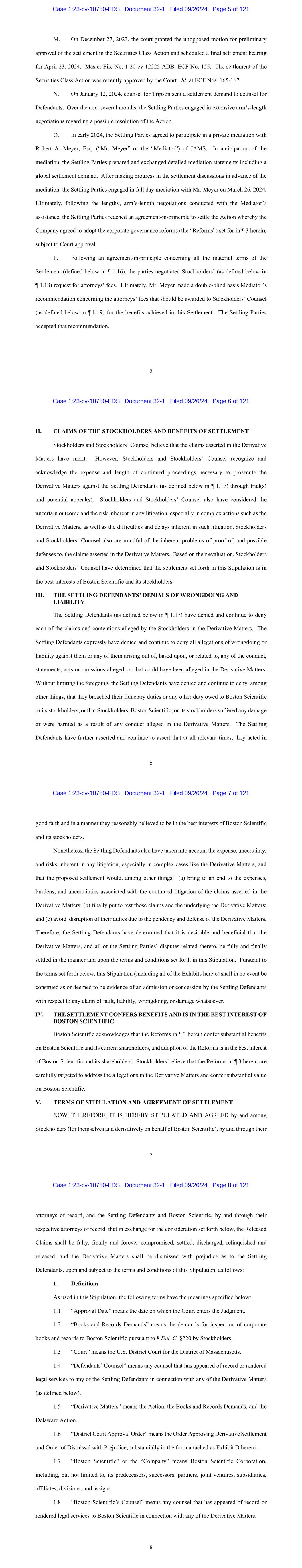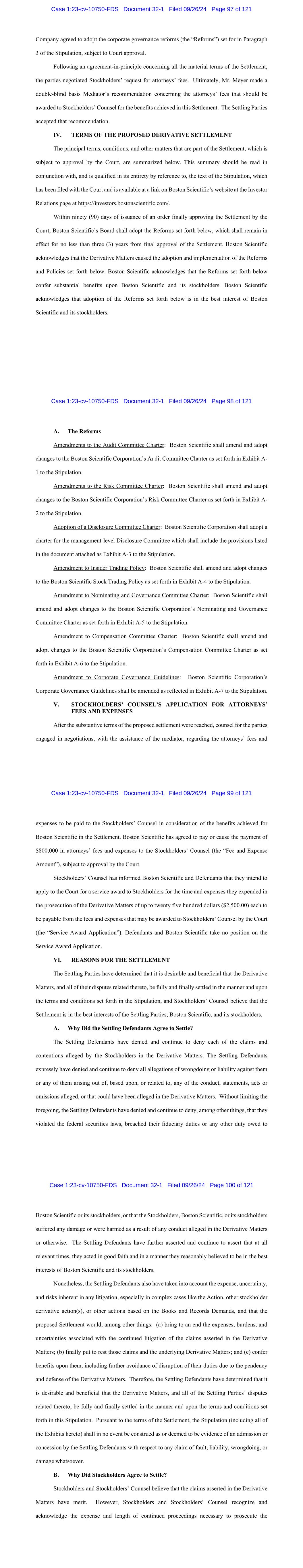 Company agreed to adopt the corporate governance reforms (the “Reforms”) set for in Paragraph 3 of the Stipulation, subject to Court approval. Following an agreement-in-principle concerning all the material terms of the Settlement, the parties negotiated Stockholders’ request for attorneys’ fees. Ultimately, Mr. Meyer made a double-blind basis Mediator’s recommendation concerning the attorneys’ fees that should be awarded to Stockholders’ Counsel for the benefits achieved in this Settlement. The Settling Parties accepted that recommendation. IV. TERMS OF THE PROPOSED DERIVATIVE SETTLEMENT The principal terms, conditions, and other matters that are part of the Settlement, which is subject to approval by the Court, are summarized below. This summary should be read in conjunction with, and is qualified in its entirety by reference to, the text of the Stipulation, which has been filed with the Court and is available at a link on Boston Scientific’s website at the Investor Relations page at https://investors.bostonscientific.com/. Within ninety (90) days of issuance of an order finally approving the Settlement by the Court, Boston Scientific’s Board shall adopt the Reforms set forth below, which shall remain in effect for no less than three (3) years from final approval of the Settlement. Boston Scientific acknowledges that the Derivative Matters caused the adoption and implementation of the Reforms and Policies set forth below. Boston Scientific acknowledges that the Reforms set forth below confer substantial benefits upon Boston Scientific and its stockholders. Boston Scientific acknowledges that adoption of the Reforms set forth below is in the best interest of Boston Scientific and its stockholders. Case 1:23-cv-10750-FDS Document 32-1 Filed 09/26/24 Page 97 of 121 A. The Reforms Amendments to the Audit Committee Charter: Boston Scientific shall amend and adopt changes to the Boston Scientific Corporation’s Audit Committee Charter as set forth in Exhibit A- 1 to the Stipulation. Amendments to the Risk Committee Charter: Boston Scientific shall amend and adopt changes to the Boston Scientific Corporation’s Risk Committee Charter as set forth in Exhibit A- 2 to the Stipulation. Adoption of a Disclosure Committee Charter: Boston Scientific Corporation shall adopt a charter for the management-level Disclosure Committee which shall include the provisions listed in the document attached as Exhibit A-3 to the Stipulation. Amendment to Insider Trading Policy: Boston Scientific shall amend and adopt changes to the Boston Scientific Stock Trading Policy as set forth in Exhibit A-4 to the Stipulation. Amendment to Nominating and Governance Committee Charter: Boston Scientific shall amend and adopt changes to the Boston Scientific Corporation’s Nominating and Governance Committee Charter as set forth in Exhibit A-5 to the Stipulation. Amendment to Compensation Committee Charter: Boston Scientific shall amend and adopt changes to the Boston Scientific Corporation’s Compensation Committee Charter as set forth in Exhibit A-6 to the Stipulation. Amendment to Corporate Governance Guidelines: Boston Scientific Corporation’s Corporate Governance Guidelines shall be amended as reflected in Exhibit A-7 to the Stipulation. V. STOCKHOLDERS’ COUNSEL’S APPLICATION FOR ATTORNEYS’ FEES AND EXPENSES After the substantive terms of the proposed settlement were reached, counsel for the parties engaged in negotiations, with the assistance of the mediator, regarding the attorneys’ fees and Case 1:23-cv-10750-FDS Document 32-1 Filed 09/26/24 Page 98 of 121 expenses to be paid to the Stockholders’ Counsel in consideration of the benefits achieved for Boston Scientific in the Settlement. Boston Scientific has agreed to pay or cause the payment of $800,000 in attorneys’ fees and expenses to the Stockholders’ Counsel (the “Fee and Expense Amount”), subject to approval by the Court. Stockholders’ Counsel has informed Boston Scientific and Defendants that they intend to apply to the Court for a service award to Stockholders for the time and expenses they expended in the prosecution of the Derivative Matters of up to twenty five hundred dollars ($2,500.00) each to be payable from the fees and expenses that may be awarded to Stockholders’ Counsel by the Court (the “Service Award Application”). Defendants and Boston Scientific take no position on the Service Award Application. VI. REASONS FOR THE SETTLEMENT The Settling Parties have determined that it is desirable and beneficial that the Derivative Matters, and all of their disputes related thereto, be fully and finally settled in the manner and upon the terms and conditions set forth in the Stipulation, and Stockholders’ Counsel believe that the Settlement is in the best interests of the Settling Parties, Boston Scientific, and its stockholders. A. Why Did the Settling Defendants Agree to Settle? The Settling Defendants have denied and continue to deny each of the claims and contentions alleged by the Stockholders in the Derivative Matters. The Settling Defendants expressly have denied and continue to deny all allegations of wrongdoing or liability against them or any of them arising out of, based upon, or related to, any of the conduct, statements, acts or omissions alleged, or that could have been alleged in the Derivative Matters. Without limiting the foregoing, the Settling Defendants have denied and continue to deny, among other things, that they violated the federal securities laws, breached their fiduciary duties or any other duty owed to Case 1:23-cv-10750-FDS Document 32-1 Filed 09/26/24 Page 99 of 121 Boston Scientific or its stockholders, or that the Stockholders, Boston Scientific, or its stockholders suffered any damage or were harmed as a result of any conduct alleged in the Derivative Matters or otherwise. The Settling Defendants have further asserted and continue to assert that at all relevant times, they act