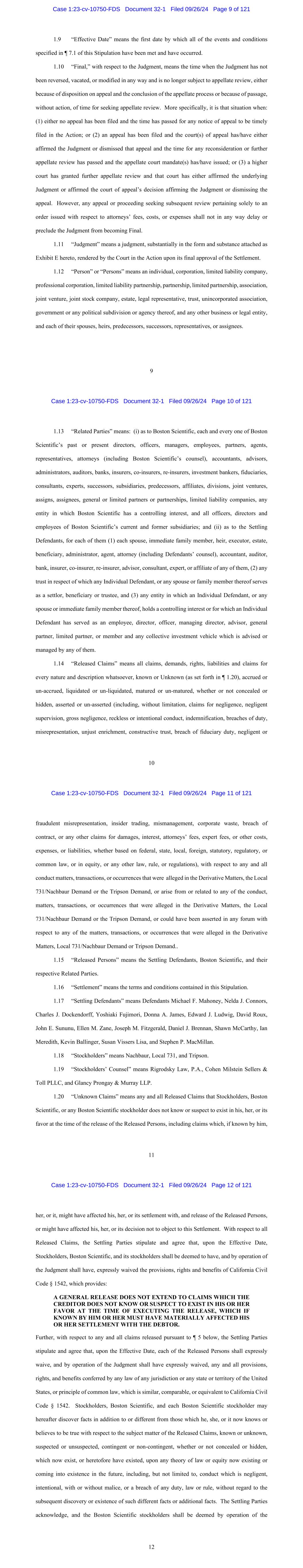 9 1.9 “Effective Date” means the first date by which all of the events and conditions specified in ¶ 7.1 of this Stipulation have been met and have occurred. 1.10 “Final,” with respect to the Judgment, means the time when the Judgment has not been reversed, vacated, or modified in any way and is no longer subject to appellate review, either because of disposition on appeal and the conclusion of the appellate process or because of passage, without action, of time for seeking appellate review. More specifically, it is that situation when: (1) either no appeal has been filed and the time has passed for any notice of appeal to be timely filed in the Action; or (2) an appeal has been filed and the court(s) of appeal has/have either affirmed the Judgment or dismissed that appeal and the time for any reconsideration or further appellate review has passed and the appellate court mandate(s) has/have issued; or (3) a higher court has granted further appellate review and that court has either affirmed the underlying Judgment or affirmed the court of appeal’s decision affirming the Judgment or dismissing the appeal. However, any appeal or proceeding seeking subsequent review pertaining solely to an order issued with respect to attorneys’ fees, costs, or expenses shall not in any way delay or preclude the Judgment from becoming Final. 1.11 “Judgment” means a judgment, substantially in the form and substance attached as Exhibit E hereto, rendered by the Court in the Action upon its final approval of the Settlement. 1.12 “Person” or “Persons” means an individual, corporation, limited liability company, professional corporation, limited liability partnership, partnership, limited partnership, association, joint venture, joint stock company, estate, legal representative, trust, unincorporated association, government or any political subdivision or agency thereof, and any other business or legal entity, and each of their spouses, heirs, predecessors, successors, representatives, or assignees. Case 1:23-cv-10750-FDS Document 32-1 Filed 09/26/24 Page 9 of 121 10 1.13 “Related Parties” means: (i) as to Boston Scientific, each and every one of Boston Scientific’s past or present directors, officers, managers, employees, partners, agents, representatives, attorneys (including Boston Scientific’s counsel), accountants, advisors, administrators, auditors, banks, insurers, co-insurers, re-insurers, investment bankers, fiduciaries, consultants, experts, successors, subsidiaries, predecessors, affiliates, divisions, joint ventures, assigns, assignees, general or limited partners or partnerships, limited liability companies, any entity in which Boston Scientific has a controlling interest, and all officers, directors and employees of Boston Scientific’s current and former subsidiaries; and (ii) as to the Settling Defendants, for each of them (1) each spouse, immediate family member, heir, executor, estate, beneficiary, administrator, agent, attorney (including Defendants’ counsel), accountant, auditor, bank, insurer, co-insurer, re-insurer, advisor, consultant, expert, or affiliate of any of them, (2) any trust in respect of which any Individual Defendant, or any spouse or family member thereof serves as a settlor, beneficiary or trustee, and (3) any entity in which an Individual Defendant, or any spouse or immediate family member thereof, holds a controlling interest or for which an Individual Defendant has served as an employee, director, officer, managing director, advisor, general partner, limited partner, or member and any collective investment vehicle which is advised or managed by any of them. 1.14 “Released Claims” means all claims, demands, rights, liabilities and claims for every nature and description whatsoever, known or Unknown (as set forth in ¶ 1.20), accrued or un-accrued, liquidated or un-liquidated, matured or un-matured, whether or not concealed or hidden, asserted or un-asserted (including, without limitation, claims for negligence, negligent supervision, gross negligence, reckless or intentional conduct, indemnification, breaches of duty, misrepresentation, unjust enrichment, constructive trust, breach of fiduciary duty, negligent or Case 1:23-cv-10750-FDS Document 32-1 Filed 09/26/24 Page 10 of 121 11 fraudulent misrepresentation, insider trading, mismanagement, corporate waste, breach of contract, or any other claims for damages, interest, attorneys’ fees, expert fees, or other costs, expenses, or liabilities, whether based on federal, state, local, foreign, statutory, regulatory, or common law, or in equity, or any other law, rule, or regulations), with respect to any and all conduct matters, transactions, or occurrences that were alleged in the Derivative Matters, the Local 731/Nachbaur Demand or the Tripson Demand, or arise from or related to any of the conduct, matters, transactions, or occurrences that were alleged in the Derivative Matters, the Local 731/Nachbaur Demand or the Tripson Demand, or could have been asserted in any forum with respect to any of the matters, transactions, or occurrences that were alleged in the Derivative Matters, Local 731/Nachbaur Demand or Tripson Demand.. 1.15 “Released Persons” means the Settling Defendants, Boston Scientific, and their respective Related Parties. 1.16 “Settlement” means the terms and conditions contained in this Stipulation. 1.17 “Settling Defendants” means Defendants Michael F. Mahoney, Nelda J. Connors, Charles J. Dockendorff, Yoshiaki Fujimori, Donna A. James, Edward J. Ludwig, David Roux, John E. Sununu, Ellen M. Zane, Joseph M. Fitzgerald, Daniel J. Brennan, Shawn McCarthy, Ian Meredith, Kevin Ballinger, Susan Vissers Lisa, and Stephen P. MacMillan. 1.18 “Stockholders” means Nachbaur, Local 731, and Tripson. 1.19 “Stockholders’ Counsel” means Rigrodsky Law, P.A., Cohen Milstein Sellers & Toll PLLC, and Glancy Prongay & Murray LLP. 1.20 “Unknown Claims” means any an