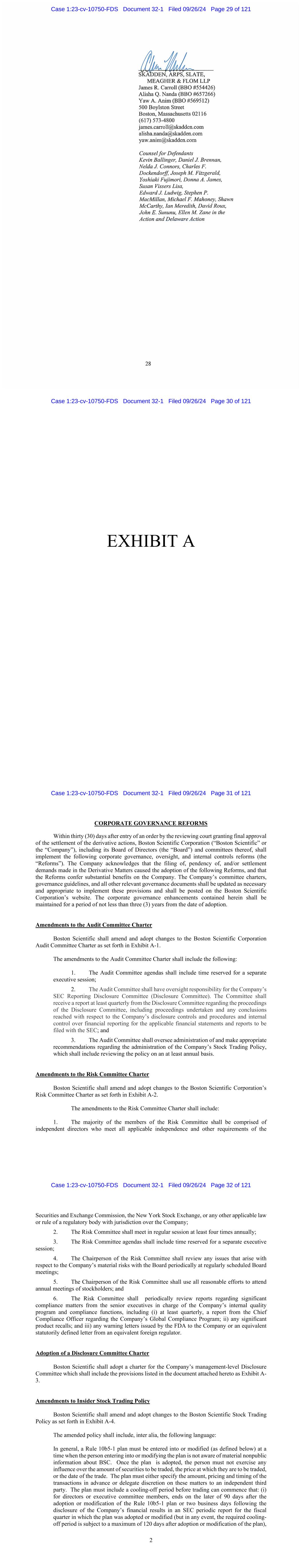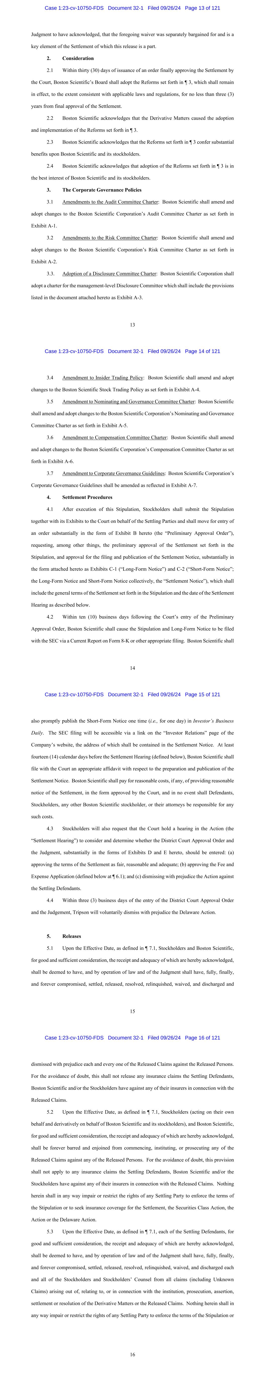 13 Judgment to have acknowledged, that the foregoing waiver was separately bargained for and is a key element of the Settlement of which this release is a part. 2. Consideration 2.1 Within thirty (30) days of issuance of an order finally approving the Settlement by the Court, Boston Scientific’s Board shall adopt the Reforms set forth in ¶ 3, which shall remain in effect, to the extent consistent with applicable laws and regulations, for no less than three (3) years from final approval of the Settlement. 2.2 Boston Scientific acknowledges that the Derivative Matters caused the adoption and implementation of the Reforms set forth in ¶ 3. 2.3 Boston Scientific acknowledges that the Reforms set forth in ¶ 3 confer substantial benefits upon Boston Scientific and its stockholders. 2.4 Boston Scientific acknowledges that adoption of the Reforms set forth in ¶ 3 is in the best interest of Boston Scientific and its stockholders. 3. The Corporate Governance Policies 3.1 Amendments to the Audit Committee Charter: Boston Scientific shall amend and adopt changes to the Boston Scientific Corporation’s Audit Committee Charter as set forth in Exhibit A-1. 3.2 Amendments to the Risk Committee Charter: Boston Scientific shall amend and adopt changes to the Boston Scientific Corporation’s Risk Committee Charter as set forth in Exhibit A-2. 3.3. Adoption of a Disclosure Committee Charter: Boston Scientific Corporation shall adopt a charter for the management-level Disclosure Committee which shall include the provisions listed in the document attached hereto as Exhibit A-3. Case 1:23-cv-10750-FDS Document 32-1 Filed 09/26/24 Page 13 of 121 14 3.4 Amendment to Insider Trading Policy: Boston Scientific shall amend and adopt changes to the Boston Scientific Stock Trading Policy as set forth in Exhibit A-4. 3.5 Amendment to Nominating and Governance Committee Charter: Boston Scientific shall amend and adopt changes to the Boston Scientific Corporation’s Nominating and Governance Committee Charter as set forth in Exhibit A-5. 3.6 Amendment to Compensation Committee Charter: Boston Scientific shall amend and adopt changes to the Boston Scientific Corporation’s Compensation Committee Charter as set forth in Exhibit A-6. 3.7 Amendment to Corporate Governance Guidelines: Boston Scientific Corporation’s Corporate Governance Guidelines shall be amended as reflected in Exhibit A-7. 4. Settlement Procedures 4.1 After execution of this Stipulation, Stockholders shall submit the Stipulation together with its Exhibits to the Court on behalf of the Settling Parties and shall move for entry of an order substantially in the form of Exhibit B hereto (the “Preliminary Approval Order”), requesting, among other things, the preliminary approval of the Settlement set forth in the Stipulation, and approval for the filing and publication of the Settlement Notice, substantially in the form attached hereto as Exhibits C-1 (“Long-Form Notice”) and C-2 (“Short-Form Notice”; the Long-Form Notice and Short-Form Notice collectively, the “Settlement Notice”), which shall include the general terms of the Settlement set forth in the Stipulation and the date of the Settlement Hearing as described below. 4.2 Within ten (10) business days following the Court’s entry of the Preliminary Approval Order, Boston Scientific shall cause the Stipulation and Long-Form Notice to be filed with the SEC via a Current Report on Form 8-K or other appropriate filing. Boston Scientific shall Case 1:23-cv-10750-FDS Document 32-1 Filed 09/26/24 Page 14 of 121 15 also promptly publish the Short-Form Notice one time (i.e., for one day) in Investor’s Business Daily. The SEC filing will be accessible via a link on the “Investor Relations” page of the Company’s website, the address of which shall be contained in the Settlement Notice. At least fourteen (14) calendar days before the Settlement Hearing (defined below), Boston Scientific shall file with the Court an appropriate affidavit with respect to the preparation and publication of the Settlement Notice. Boston Scientific shall pay for reasonable costs, if any, of providing reasonable notice of the Settlement, in the form approved by the Court, and in no event shall Defendants, Stockholders, any other Boston Scientific stockholder, or their attorneys be responsible for any such costs. 4.3 Stockholders will also request that the Court hold a hearing in the Action (the “Settlement Hearing”) to consider and determine whether the District Court Approval Order and the Judgment, substantially in the forms of Exhibits D and E hereto, should be entered: (a) approving the terms of the Settlement as fair, reasonable and adequate; (b) approving the Fee and Expense Application (defined below at ¶ 6.1); and (c) dismissing with prejudice the Action against the Settling Defendants. 4.4 Within three (3) business days of the entry of the District Court Approval Order and the Judgement, Tripson will voluntarily dismiss with prejudice the Delaware Action. 5. Releases 5.1 Upon the Effective Date, as defined in ¶ 7.1, Stockholders and Boston Scientific, for good and sufficient consideration, the receipt and adequacy of which are hereby acknowledged, shall be deemed to have, and by operation of law and of the Judgment shall have, fully, finally, and forever compromised, settled, released, resolved, relinquished, waived, and discharged and Case 1:23-cv-10750-FDS Document 32-1 Filed 09/26/24 Page 15 of 121 16 dismissed with prejudice each and every one of the Released Claims against the Released Persons. For the avoidance of doubt, this shall not release any insurance claims the Settling Defendants, Boston Scientific and/or the Stockholders have against any of their insurers in connection with the Released Claims. 5.2 Upon the Effective Date, as defined in ¶ 7.1, Stockholders (acting on their own behalf and derivatively on behalf of Boston Scientific and its stockholders), and Boston Scientif