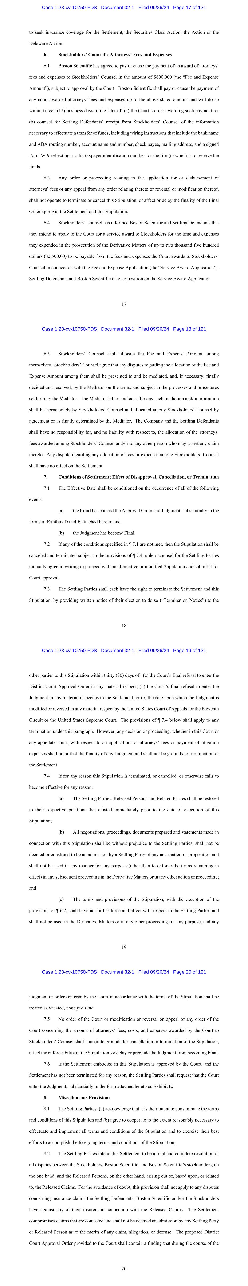 17 to seek insurance coverage for the Settlement, the Securities Class Action, the Action or the Delaware Action. 6. Stockholders’ Counsel’s Attorneys’ Fees and Expenses 6.1 Boston Scientific has agreed to pay or cause the payment of an award of attorneys’ fees and expenses to Stockholders’ Counsel in the amount of $800,000 (the “Fee and Expense Amount”), subject to approval by the Court. Boston Scientific shall pay or cause the payment of any court-awarded attorneys’ fees and expenses up to the above-stated amount and will do so within fifteen (15) business days of the later of: (a) the Court’s order awarding such payment; or (b) counsel for Settling Defendants’ receipt from Stockholders’ Counsel of the information necessary to effectuate a transfer of funds, including wiring instructions that include the bank name and ABA routing number, account name and number, check payee, mailing address, and a signed Form W-9 reflecting a valid taxpayer identification number for the firm(s) which is to receive the funds. 6.3 Any order or proceeding relating to the application for or disbursement of attorneys’ fees or any appeal from any order relating thereto or reversal or modification thereof, shall not operate to terminate or cancel this Stipulation, or affect or delay the finality of the Final Order approval the Settlement and this Stipulation. 6.4 Stockholders’ Counsel has informed Boston Scientific and Settling Defendants that they intend to apply to the Court for a service award to Stockholders for the time and expenses they expended in the prosecution of the Derivative Matters of up to two thousand five hundred dollars ($2,500.00) to be payable from the fees and expenses the Court awards to Stockholders’ Counsel in connection with the Fee and Expense Application (the “Service Award Application”). Settling Defendants and Boston Scientific take no position on the Service Award Application. Case 1:23-cv-10750-FDS Document 32-1 Filed 09/26/24 Page 17 of 121 18 6.5 Stockholders’ Counsel shall allocate the Fee and Expense Amount among themselves. Stockholders’ Counsel agree that any disputes regarding the allocation of the Fee and Expense Amount among them shall be presented to and be mediated, and, if necessary, finally decided and resolved, by the Mediator on the terms and subject to the processes and procedures set forth by the Mediator. The Mediator’s fees and costs for any such mediation and/or arbitration shall be borne solely by Stockholders’ Counsel and allocated among Stockholders’ Counsel by agreement or as finally determined by the Mediator. The Company and the Settling Defendants shall have no responsibility for, and no liability with respect to, the allocation of the attorneys’ fees awarded among Stockholders’ Counsel and/or to any other person who may assert any claim thereto. Any dispute regarding any allocation of fees or expenses among Stockholders’ Counsel shall have no effect on the Settlement. 7. Conditions of Settlement; Effect of Disapproval, Cancellation, or Termination 7.1 The Effective Date shall be conditioned on the occurrence of all of the following events: (a) the Court has entered the Approval Order and Judgment, substantially in the forms of Exhibits D and E attached hereto; and (b) the Judgment has become Final. 7.2 If any of the conditions specified in ¶ 7.1 are not met, then the Stipulation shall be canceled and terminated subject to the provisions of ¶ 7.4, unless counsel for the Settling Parties mutually agree in writing to proceed with an alternative or modified Stipulation and submit it for Court approval. 7.3 The Settling Parties shall each have the right to terminate the Settlement and this Stipulation, by providing written notice of their election to do so (“Termination Notice”) to the Case 1:23-cv-10750-FDS Document 32-1 Filed 09/26/24 Page 18 of 121 19 other parties to this Stipulation within thirty (30) days of: (a) the Court’s final refusal to enter the District Court Approval Order in any material respect; (b) the Court’s final refusal to enter the Judgment in any material respect as to the Settlement; or (c) the date upon which the Judgment is modified or reversed in any material respect by the United States Court of Appeals for the Eleventh Circuit or the United States Supreme Court. The provisions of ¶ 7.4 below shall apply to any termination under this paragraph. However, any decision or proceeding, whether in this Court or any appellate court, with respect to an application for attorneys’ fees or payment of litigation expenses shall not affect the finality of any Judgment and shall not be grounds for termination of the Settlement. 7.4 If for any reason this Stipulation is terminated, or cancelled, or otherwise fails to become effective for any reason: (a) The Settling Parties, Released Persons and Related Parties shall be restored to their respective positions that existed immediately prior to the date of execution of this Stipulation; (b) All negotiations, proceedings, documents prepared and statements made in connection with this Stipulation shall be without prejudice to the Settling Parties, shall not be deemed or construed to be an admission by a Settling Party of any act, matter, or proposition and shall not be used in any manner for any purpose (other than to enforce the terms remaining in effect) in any subsequent proceeding in the Derivative Matters or in any other action or proceeding; and (c) The terms and provisions of the Stipulation, with the exception of the provisions of ¶ 6.2, shall have no further force and effect with respect to the Settling Parties and shall not be used in the Derivative Matters or in any other proceeding for any purpose, and any Case 1:23-cv-10750-FDS Document 32-1 Filed 09/26/24 Page 19 of 121 20 judgment or orders entered by the Court in accordance with the terms of the Stipulation shall be treated as vacated, nunc pro tunc. 7.5 No order of the Co