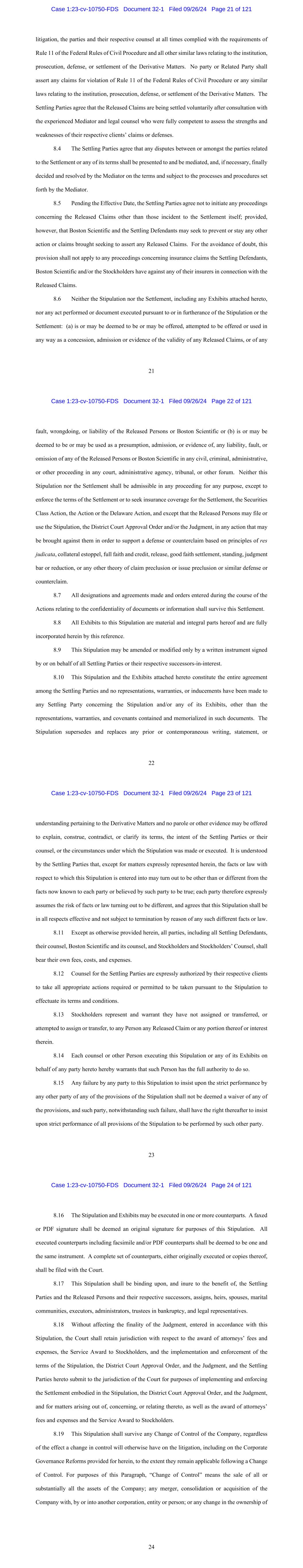21 litigation, the parties and their respective counsel at all times complied with the requirements of Rule 11 of the Federal Rules of Civil Procedure and all other similar laws relating to the institution, prosecution, defense, or settlement of the Derivative Matters. No party or Related Party shall assert any claims for violation of Rule 11 of the Federal Rules of Civil Procedure or any similar laws relating to the institution, prosecution, defense, or settlement of the Derivative Matters. The Settling Parties agree that the Released Claims are being settled voluntarily after consultation with the experienced Mediator and legal counsel who were fully competent to assess the strengths and weaknesses of their respective clients’ claims or defenses. 8.4 The Settling Parties agree that any disputes between or amongst the parties related to the Settlement or any of its terms shall be presented to and be mediated, and, if necessary, finally decided and resolved by the Mediator on the terms and subject to the processes and procedures set forth by the Mediator. 8.5 Pending the Effective Date, the Settling Parties agree not to initiate any proceedings concerning the Released Claims other than those incident to the Settlement itself; provided, however, that Boston Scientific and the Settling Defendants may seek to prevent or stay any other action or claims brought seeking to assert any Released Claims. For the avoidance of doubt, this provision shall not apply to any proceedings concerning insurance claims the Settling Defendants, Boston Scientific and/or the Stockholders have against any of their insurers in connection with the Released Claims. 8.6 Neither the Stipulation nor the Settlement, including any Exhibits attached hereto, nor any act performed or document executed pursuant to or in furtherance of the Stipulation or the Settlement: (a) is or may be deemed to be or may be offered, attempted to be offered or used in any way as a concession, admission or evidence of the validity of any Released Claims, or of any Case 1:23-cv-10750-FDS Document 32-1 Filed 09/26/24 Page 21 of 121 22 fault, wrongdoing, or liability of the Released Persons or Boston Scientific or (b) is or may be deemed to be or may be used as a presumption, admission, or evidence of, any liability, fault, or omission of any of the Released Persons or Boston Scientific in any civil, criminal, administrative, or other proceeding in any court, administrative agency, tribunal, or other forum. Neither this Stipulation nor the Settlement shall be admissible in any proceeding for any purpose, except to enforce the terms of the Settlement or to seek insurance coverage for the Settlement, the Securities Class Action, the Action or the Delaware Action, and except that the Released Persons may file or use the Stipulation, the District Court Approval Order and/or the Judgment, in any action that may be brought against them in order to support a defense or counterclaim based on principles of res judicata, collateral estoppel, full faith and credit, release, good faith settlement, standing, judgment bar or reduction, or any other theory of claim preclusion or issue preclusion or similar defense or counterclaim. 8.7 All designations and agreements made and orders entered during the course of the Actions relating to the confidentiality of documents or information shall survive this Settlement. 8.8 All Exhibits to this Stipulation are material and integral parts hereof and are fully incorporated herein by this reference. 8.9 This Stipulation may be amended or modified only by a written instrument signed by or on behalf of all Settling Parties or their respective successors-in-interest. 8.10 This Stipulation and the Exhibits attached hereto constitute the entire agreement among the Settling Parties and no representations, warranties, or inducements have been made to any Settling Party concerning the Stipulation and/or any of its Exhibits, other than the representations, warranties, and covenants contained and memorialized in such documents. The Stipulation supersedes and replaces any prior or contemporaneous writing, statement, or Case 1:23-cv-10750-FDS Document 32-1 Filed 09/26/24 Page 22 of 121 23 understanding pertaining to the Derivative Matters and no parole or other evidence may be offered to explain, construe, contradict, or clarify its terms, the intent of the Settling Parties or their counsel, or the circumstances under which the Stipulation was made or executed. It is understood by the Settling Parties that, except for matters expressly represented herein, the facts or law with respect to which this Stipulation is entered into may turn out to be other than or different from the facts now known to each party or believed by such party to be true; each party therefore expressly assumes the risk of facts or law turning out to be different, and agrees that this Stipulation shall be in all respects effective and not subject to termination by reason of any such different facts or law. 8.11 Except as otherwise provided herein, all parties, including all Settling Defendants, their counsel, Boston Scientific and its counsel, and Stockholders and Stockholders’ Counsel, shall bear their own fees, costs, and expenses. 8.12 Counsel for the Settling Parties are expressly authorized by their respective clients to take all appropriate actions required or permitted to be taken pursuant to the Stipulation to effectuate its terms and conditions. 8.13 Stockholders represent and warrant they have not assigned or transferred, or attempted to assign or transfer, to any Person any Released Claim or any portion thereof or interest therein. 8.14 Each counsel or other Person executing this Stipulation or any of its Exhibits on behalf of any party hereto hereby warrants that such Person has the full authority to do so. 8.15 Any failure by any party to this Stipulation to insist upon the strict performance by any other party of any of the provisions of the St