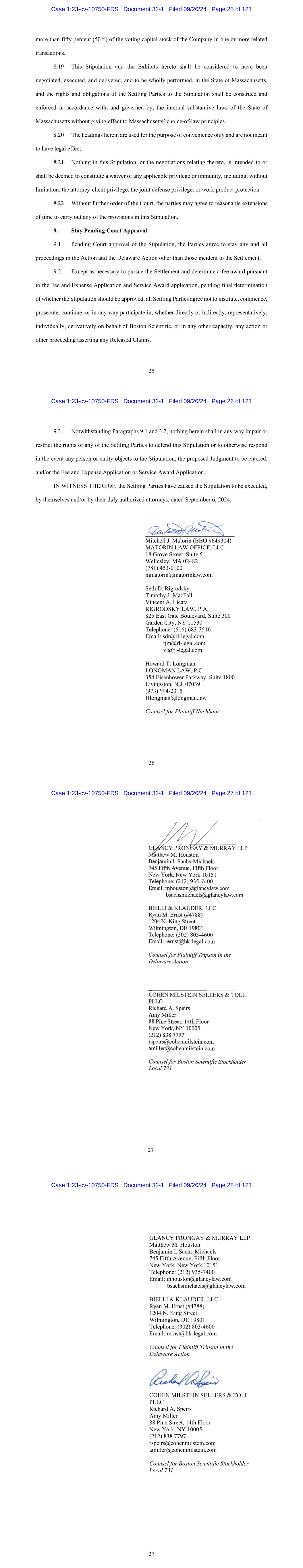 25 more than fifty percent (50%) of the voting capital stock of the Company in one or more related transactions. 8.19 This Stipulation and the Exhibits hereto shall be considered to have been negotiated, executed, and delivered, and to be wholly performed, in the State of Massachusetts, and the rights and obligations of the Settling Parties to the Stipulation shall be construed and enforced in accordance with, and governed by, the internal substantive laws of the State of Massachusetts without giving effect to Massachusetts’ choice-of-law principles. 8.20 The headings herein are used for the purpose of convenience only and are not meant to have legal effect. 8.21 Nothing in this Stipulation, or the negotiations relating thereto, is intended to or shall be deemed to constitute a waiver of any applicable privilege or immunity, including, without limitation, the attorney-client privilege, the joint defense privilege, or work product protection. 8.22 Without further order of the Court, the parties may agree to reasonable extensions of time to carry out any of the provisions in this Stipulation. 9. Stay Pending Court Approval 9.1 Pending Court approval of the Stipulation, the Parties agree to stay any and all proceedings in the Action and the Delaware Action other than those incident to the Settlement. 9.2. Except as necessary to pursue the Settlement and determine a fee award pursuant to the Fee and Expense Application and Service Award application, pending final determination of whether the Stipulation should be approved, all Settling Parties agree not to institute, commence, prosecute, continue, or in any way participate in, whether directly or indirectly, representatively, individually, derivatively on behalf of Boston Scientific, or in any other capacity, any action or other proceeding asserting any Released Claims. Case 1:23-cv-10750-FDS Document 32-1 Filed 09/26/24 Page 25 of 121 26 9.3. Notwithstanding Paragraphs 9.1 and 3.2, nothing herein shall in any way impair or restrict the rights of any of the Settling Parties to defend this Stipulation or to otherwise respond in the event any person or entity objects to the Stipulation, the proposed Judgment to be entered, and/or the Fee and Expense Application or Service Award Application. IN WITNESS THEREOF, the Settling Parties have caused the Stipulation to be executed, by themselves and/or by their duly authorized attorneys, dated September 6, 2024. Mitchell J. Matorin (BBO #649304) MATORIN LAW OFFICE, LLC 18 Grove Street, Suite 5 Wellesley, MA 02482 (781) 453-0100 mmatorin@matorinlaw.com Seth D. Rigrodsky Timothy J. MacFall Vincent A. Licata RIGRODSKY LAW, P.A. 825 East Gate Boulevard, Suite 300 Garden City, NY 11530 Telephone: (516) 683-3516 Email: sdr@rl-legal.com tjm@rl-legal.com vl@rl-legal.com Howard T. Longman LONGMAN LAW, P.C. 354 Eisenhower Parkway, Suite 1800 Livingston, N.J. 07039 (973) 994-2315 Hlongman@longman.law Counsel for Plaintiff Nachbaur Case 1:23-cv-10750-FDS Document 32-1 Filed 09/26/24 Page 26 of 121 /; ee GLANCY PRON@AY & MURRAY LLP atthew M. Houston Benjamin I. Sachs-Michaels 745 Fifth Avenue, Fifth Floor New York, New York 10151 Telephone: (212) 935-7400 Email: mhouston@glancylaw.com bsachsmichaels@glancylaw.com BIELLI & KLAUDER, LLC Ryan M. Ernst (#4788) 1204 N. King Street Wilmington, DE 19801 Telephone: (302) 803-4600 Email: rernst@bk-legal.com Counsel for Plaintiff Tripson in the Delaware Action COHEN MILSTEIN SELLERS & TOLL PLLC Richard A. Speirs Amy Miller 88 Pine Street, 14th Floor New York, NY 10005 (212) 838 7797 rspeirs@cohenmilstein.com amiller@cohenmilstein.com Counsel for Boston Scientific Stockholder Local 731 27 Case 1:23-cv-10750-FDS Document 32-1 Filed 09/26/24 Page 27 of 121 GLANCY PRONGAY & MURRAY LLP Matthew M. Houston Benjamin I. Sachs-Michaels 745 Fifth Avenue, Fifth Floor New York, New York 10151 Telephone: (212) 935-7400 Email: mhouston@glancylaw.com bsachsmichaels@glancylaw.com BIELLI & KLAUDER, LLC Ryan M. Ernst (#4788) 1204 N. King Street Wilmington, DE 19801 Telephone: (302) 803-4600 Email: rernst@bk-legal.com Counsel for Plaintiff Tripson in the Delaware Action COHEN MILSTEIN SELLERS & TOLL PLLC Richard A. Speirs Amy Miller 88 Pine Street, 14th Floor New York, NY 10005 (212) 838 7797 rspeirs@cohenmilstein.com amiller@cohenmilstein.com Counsel for Boston Scientific Stockholder Local 731 27 Case 1:23-cv-10750-FDS Document 32-1 Filed 09/26/24 Page 28 of 121