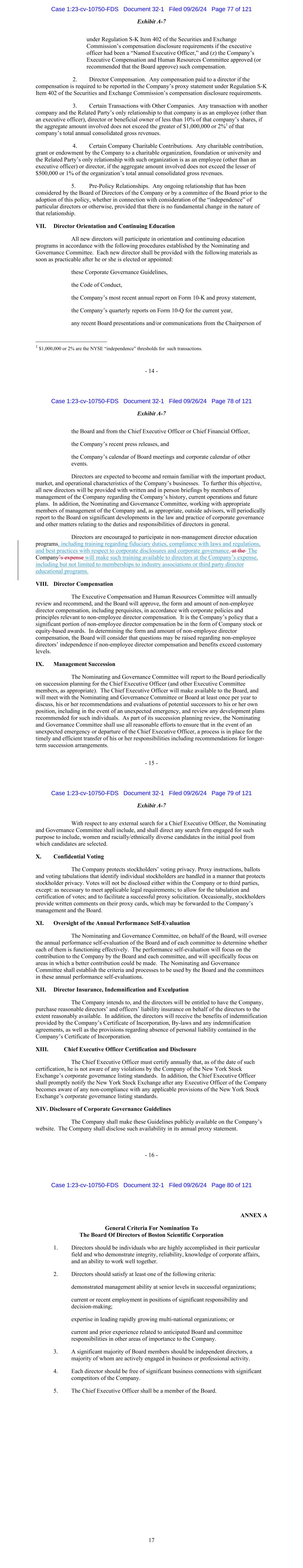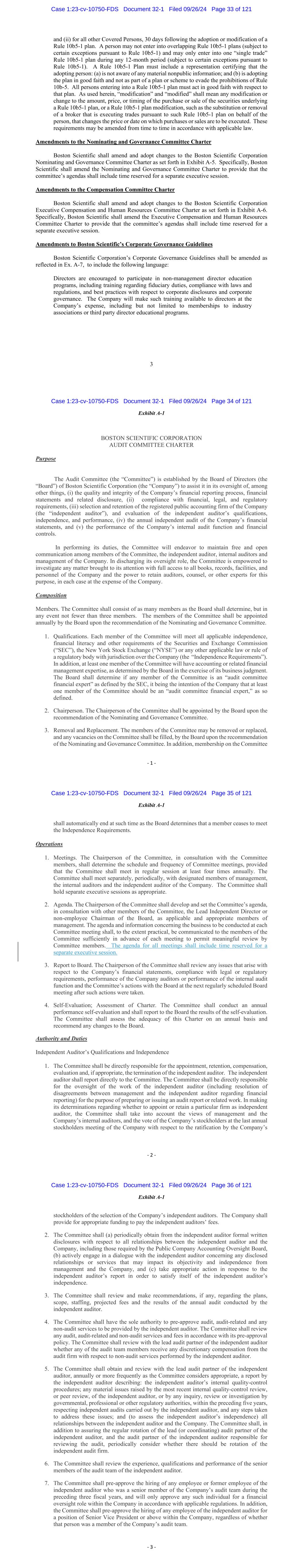 3 and (ii) for all other Covered Persons, 30 days following the adoption or modification of a Rule 10b5-1 plan. A person may not enter into overlapping Rule 10b5-1 plans (subject to certain exceptions pursuant to Rule 10b5-1) and may only enter into one “single trade” Rule 10b5-1 plan during any 12-month period (subject to certain exceptions pursuant to Rule 10b5-1). A Rule 10b5-1 Plan must include a representation certifying that the adopting person: (a) is not aware of any material nonpublic information; and (b) is adopting the plan in good faith and not as part of a plan or scheme to evade the prohibitions of Rule 10b-5. All persons entering into a Rule 10b5-1 plan must act in good faith with respect to that plan. As used herein, “modification” and “modified” shall mean any modification or change to the amount, price, or timing of the purchase or sale of the securities underlying a Rule 10b5-1 plan, or a Rule 10b5-1 plan modification, such as the substitution or removal of a broker that is executing trades pursuant to such Rule 10b5-1 plan on behalf of the person, that changes the price or date on which purchases or sales are to be executed. These requirements may be amended from time to time in accordance with applicable law. Amendments to the Nominating and Governance Committee Charter Boston Scientific shall amend and adopt changes to the Boston Scientific Corporation Nominating and Governance Committee Charter as set forth in Exhibit A-5. Specifically, Boston Scientific shall amend the Nominating and Governance Committee Charter to provide that the committee’s agendas shall include time reserved for a separate executive session. Amendments to the Compensation Committee Charter Boston Scientific shall amend and adopt changes to the Boston Scientific Corporation Executive Compensation and Human Resources Committee Charter as set forth in Exhibit A-6. Specifically, Boston Scientific shall amend the Executive Compensation and Human Resources Committee Charter to provide that the committee’s agendas shall include time reserved for a separate executive session. Amendments to Boston Scientific’s Corporate Governance Guidelines Boston Scientific Corporation’s Corporate Governance Guidelines shall be amended as reflected in Ex. A-7, to include the following language: Directors are encouraged to participate in non-management director education programs, including training regarding fiduciary duties, compliance with laws and regulations, and best practices with respect to corporate disclosures and corporate governance. The Company will make such training available to directors at the Company’s expense, including but not limited to memberships to industry associations or third party director educational programs. Case 1:23-cv-10750-FDS Document 32-1 Filed 09/26/24 Page 33 of 121 Exhibit A-1 - 1 - BOSTON SCIENTIFIC CORPORATION AUDIT COMMITTEE CHARTER Purpose The Audit Committee (the “Committee”) is established by the Board of Directors (the “Board”) of Boston Scientific Corporation (the “Company”) to assist it in its oversight of, among other things, (i) the quality and integrity of the Company’s financial reporting process, financial statements and related disclosure, (ii) compliance with financial, legal, and regulatory requirements, (iii) selection and retention of the registered public accounting firm of the Company (the “independent auditor”), and evaluation of the independent auditor’s qualifications, independence, and performance, (iv) the annual independent audit of the Company’s financial statements, and (v) the performance of the Company’s internal audit function and financial controls. In performing its duties, the Committee will endeavor to maintain free and open communication among members of the Committee, the independent auditor, internal auditors and management of the Company. In discharging its oversight role, the Committee is empowered to investigate any matter brought to its attention with full access to all books, records, facilities, and personnel of the Company and the power to retain auditors, counsel, or other experts for this purpose, in each case at the expense of the Company. Composition Members. The Committee shall consist of as many members as the Board shall determine, but in any event not fewer than three members. The members of the Committee shall be appointed annually by the Board upon the recommendation of the Nominating and Governance Committee. 1. Qualifications. Each member of the Committee will meet all applicable independence, financial literacy and other requirements of the Securities and Exchange Commission (“SEC”), the New York Stock Exchange (“NYSE”) or any other applicable law or rule of a regulatory body with jurisdiction over the Company (the “Independence Requirements”). In addition, at least one member of the Committee will have accounting or related financial management expertise, as determined by the Board in the exercise of its business judgment. The Board shall determine if any member of the Committee is an “audit committee financial expert” as defined by the SEC, it being the intention of the Company that at least one member of the Committee should be an “audit committee financial expert,” as so defined. 2. Chairperson. The Chairperson of the Committee shall be appointed by the Board upon the recommendation of the Nominating and Governance Committee. 3. Removal and Replacement. The members of the Committee may be removed or replaced, and any vacancies on the Committee shall be filled, by the Board upon the recommendation of the Nominating and Governance Committee. In addition, membership on the Committee Case 1:23-cv-10750-FDS Document 32-1 Filed 09/26/24 Page 34 of 121 Exhibit A-1 - 2 - shall automatically end at such time as the Board determines that a member ceases to meet the Independence Requirements. Operations 1. Meetings. The Chairperson of the Committee, in consultati