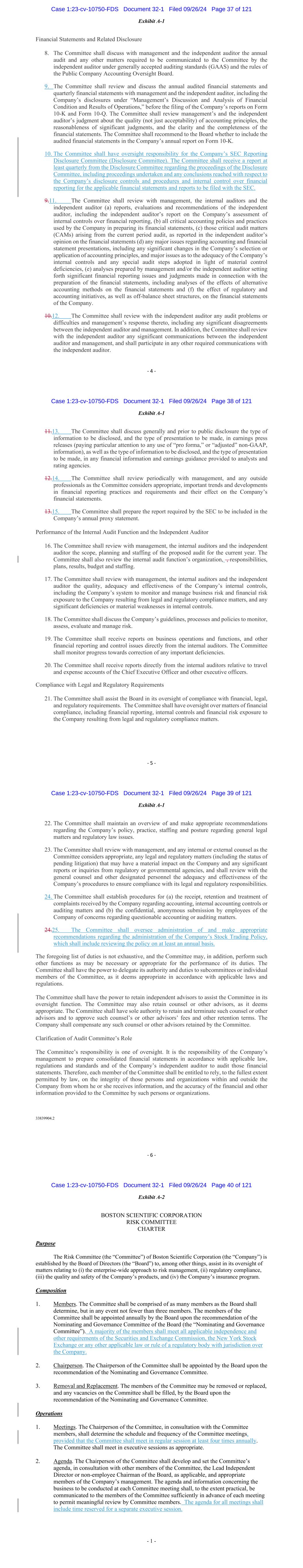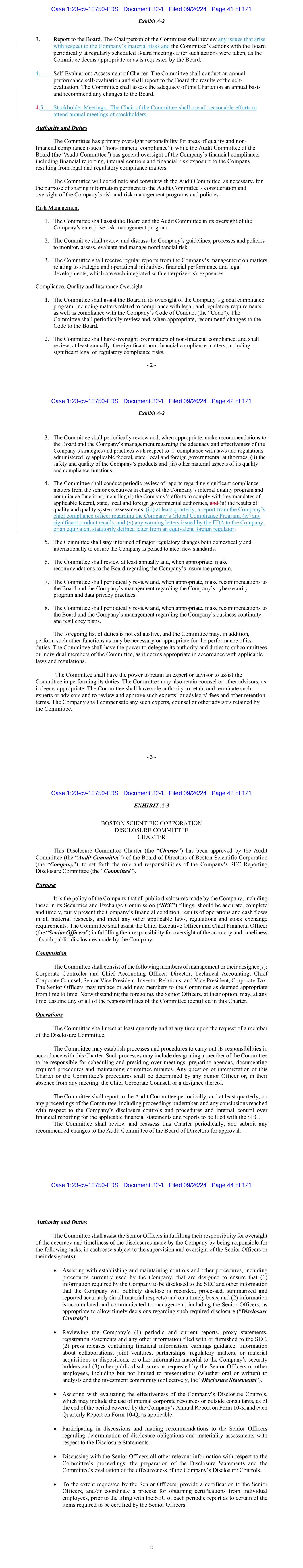 Exhibit A-2 - 2 - 3. Report to the Board. The Chairperson of the Committee shall review any issues that arise with respect to the Company’s material risks and the Committee’s actions with the Board periodically at regularly scheduled Board meetings after such actions were taken, as the Committee deems appropriate or as is requested by the Board. 4. Self-Evaluation; Assessment of Charter. The Committee shall conduct an annual performance self-evaluation and shall report to the Board the results of the self- evaluation. The Committee shall assess the adequacy of this Charter on an annual basis and recommend any changes to the Board. 4.5. Stockholder Meetings. The Chair of the Committee shall use all reasonable efforts to attend annual meetings of stockholders. Authority and Duties The Committee has primary oversight responsibility for areas of quality and non- financial compliance issues (“non-financial compliance”), while the Audit Committee of the Board (the “Audit Committee”) has general oversight of the Company’s financial compliance, including financial reporting, internal controls and financial risk exposure to the Company resulting from legal and regulatory compliance matters. The Committee will coordinate and consult with the Audit Committee, as necessary, for the purpose of sharing information pertinent to the Audit Committee’s consideration and oversight of the Company’s risk and risk management programs and policies. Risk Management 1. The Committee shall assist the Board and the Audit Committee in its oversight of the Company’s enterprise risk management program. 2. The Committee shall review and discuss the Company’s guidelines, processes and policies to monitor, assess, evaluate and manage nonfinancial risk. 3. The Committee shall receive regular reports from the Company’s management on matters relating to strategic and operational initiatives, financial performance and legal developments, which are each integrated with enterprise-risk exposures. Compliance, Quality and Insurance Oversight 1. The Committee shall assist the Board in its oversight of the Company’s global compliance program, including matters related to compliance with legal, and regulatory requirements as well as compliance with the Company’s Code of Conduct (the “Code”). The Committee shall periodically review and, when appropriate, recommend changes to the Code to the Board. 2. The Committee shall have oversight over matters of non-financial compliance, and shall review, at least annually, the significant non-financial compliance matters, including significant legal or regulatory compliance risks. Case 1:23-cv-10750-FDS Document 32-1 Filed 09/26/24 Page 41 of 121 Exhibit A-2 - 3 - 3. The Committee shall periodically review and, when appropriate, make recommendations to the Board and the Company’s management regarding the adequacy and effectiveness of the Company’s strategies and practices with respect to (i) compliance with laws and regulations administered by applicable federal, state, local and foreign governmental authorities, (ii) the safety and quality of the Company’s products and (iii) other material aspects of its quality and compliance functions. 4. The Committee shall conduct periodic review of reports regarding significant compliance matters from the senior executives in charge of the Company’s internal quality program and compliance functions, including (i) the Company’s efforts to comply with key mandates of applicable federal, state, local and foreign governmental authorities, and (ii) the results of quality and quality system assessments, (iii) at least quarterly, a report from the Company’s chief compliance officer regarding the Company’s Global Compliance Program, (iv) any significant product recalls, and (v) any warning letters issued by the FDA to the Company, or an equivalent statutorily defined letter from an equivalent foreign regulator. 5. The Committee shall stay informed of major regulatory changes both domestically and internationally to ensure the Company is poised to meet new standards. 6. The Committee shall review at least annually and, when appropriate, make recommendations to the Board regarding the Company’s insurance program. 7. The Committee shall periodically review and, when appropriate, make recommendations to the Board and the Company’s management regarding the Company’s cybersecurity program and data privacy practices. 8. The Committee shall periodically review and, when appropriate, make recommendations to the Board and the Company’s management regarding the Company’s business continuity and resiliency plans. The foregoing list of duties is not exhaustive, and the Committee may, in addition, perform such other functions as may be necessary or appropriate for the performance of its duties. The Committee shall have the power to delegate its authority and duties to subcommittees or individual members of the Committee, as it deems appropriate in accordance with applicable laws and regulations. The Committee shall have the power to retain an expert or advisor to assist the Committee in performing its duties. The Committee may also retain counsel or other advisors, as it deems appropriate. The Committee shall have sole authority to retain and terminate such experts or advisors and to review and approve such experts’ or advisors’ fees and other retention terms. The Company shall compensate any such experts, counsel or other advisors retained by the Committee. Case 1:23-cv-10750-FDS Document 32-1 Filed 09/26/24 Page 42 of 121 EXHIBIT A-3 BOSTON SCIENTIFIC CORPORATION DISCLOSURE COMMITTEE CHARTER This Disclosure Committee Charter (the “Charter”) has been approved by the Audit Committee (the “Audit Committee”) of the Board of Directors of Boston Scientific Corporation (the “Company”), to set forth the role and responsibilities of the Company’s SEC Reporting Disclosure Committee (the “Committee”). Purpo