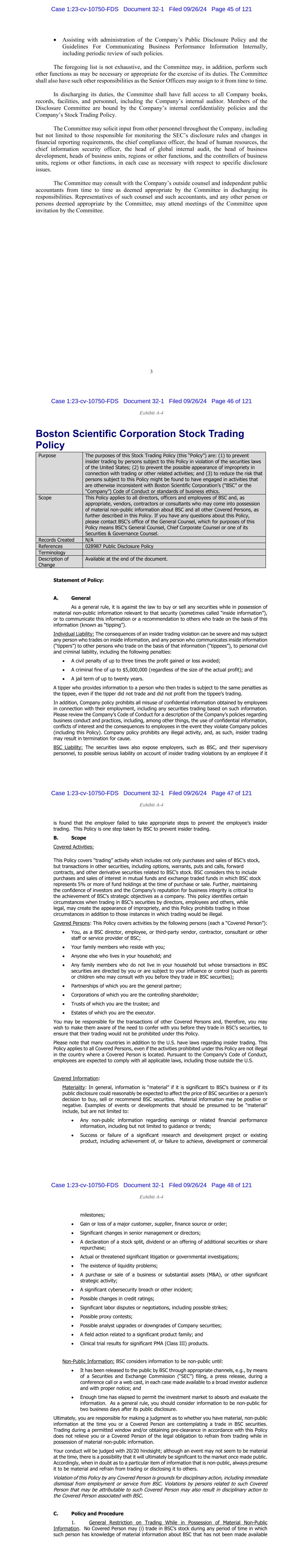 3  Assisting with administration of the Company’s Public Disclosure Policy and the Guidelines For Communicating Business Performance Information Internally, including periodic review of such policies. The foregoing list is not exhaustive, and the Committee may, in addition, perform such other functions as may be necessary or appropriate for the exercise of its duties. The Committee shall also have such other responsibilities as the Senior Officers may assign to it from time to time. In discharging its duties, the Committee shall have full access to all Company books, records, facilities, and personnel, including the Company’s internal auditor. Members of the Disclosure Committee are bound by the Company’s internal confidentiality policies and the Company’s Stock Trading Policy. The Committee may solicit input from other personnel throughout the Company, including but not limited to those responsible for monitoring the SEC’s disclosure rules and changes in financial reporting requirements, the chief compliance officer, the head of human resources, the chief information security officer, the head of global internal audit, the head of business development, heads of business units, regions or other functions, and the controllers of business units, regions or other functions, in each case as necessary with respect to specific disclosure issues. The Committee may consult with the Company’s outside counsel and independent public accountants from time to time as deemed appropriate by the Committee in discharging its responsibilities. Representatives of such counsel and such accountants, and any other person or persons deemed appropriate by the Committee, may attend meetings of the Committee upon invitation by the Committee. Case 1:23-cv-10750-FDS Document 32-1 Filed 09/26/24 Page 45 of 121 Exhibit A-4 Boston Scientific Corporation Stock Trading Policy Purpose The purposes of this Stock Trading Policy (this “Policy”) are: (1) to prevent insider trading by persons subject to this Policy in violation of the securities laws of the United States; (2) to prevent the possible appearance of impropriety in connection with trading or other related activities; and (3) to reduce the risk that persons subject to this Policy might be found to have engaged in activities that are otherwise inconsistent with Boston Scientific Corporation’s (“BSC” or the “Company”) Code of Conduct or standards of business ethics. Scope This Policy applies to all directors, officers and employees of BSC and, as appropriate, vendors, contractors or consultants who may come into possession of material non-public information about BSC and all other Covered Persons, as further described in this Policy. If you have any questions about this Policy, please contact BSC’s office of the General Counsel, which for purposes of this Policy means BSC’s General Counsel, Chief Corporate Counsel or one of its Securities & Governance Counsel. Records Created N/A References 028987 Public Disclosure Policy Terminology Description of Change Available at the end of the document. Statement of Policy: A. General As a general rule, it is against the law to buy or sell any securities while in possession of material non-public information relevant to that security (sometimes called “inside information”), or to communicate this information or a recommendation to others who trade on the basis of this information (known as “tipping”). Individual Liability: The consequences of an insider trading violation can be severe and may subject any person who trades on inside information, and any person who communicates inside information (“tippers”) to other persons who trade on the basis of that information (“tippees”), to personal civil and criminal liability, including the following penalties:  A civil penalty of up to three times the profit gained or loss avoided;  A criminal fine of up to $5,000,000 (regardless of the size of the actual profit); and  A jail term of up to twenty years. A tipper who provides information to a person who then trades is subject to the same penalties as the tippee, even if the tipper did not trade and did not profit from the tippee’s trading. In addition, Company policy prohibits all misuse of confidential information obtained by employees in connection with their employment, including any securities trading based on such information. Please review the Company’s Code of Conduct for a description of the Company’s policies regarding business conduct and practices, including, among other things, the use of confidential information, conflicts of interest and the consequences to employees in the event they violate Company policies (including this Policy). Company policy prohibits any illegal activity, and, as such, insider trading may result in termination for cause. BSC Liability: The securities laws also expose employers, such as BSC, and their supervisory personnel, to possible serious liability on account of insider trading violations by an employee if it Case 1:23-cv-10750-FDS Document 32-1 Filed 09/26/24 Page 46 of 121 Exhibit A-4 is found that the employer failed to take appropriate steps to prevent the employee’s insider trading. This Policy is one step taken by BSC to prevent insider trading. B. Scope Covered Activities: This Policy covers “trading” activity which includes not only purchases and sales of BSC’s stock, but transactions in other securities, including options, warrants, puts and calls, forward contracts, and other derivative securities related to BSC’s stock. BSC considers this to include purchases and sales of interest in mutual funds and exchange traded funds in which BSC stock represents 5% or more of fund holdings at the time of purchase or sale. Further, maintaining the confidence of investors and the Company’s reputation for business integrity is critical to the achievement of BSC’s strategic objectives as a company. This policy identifie