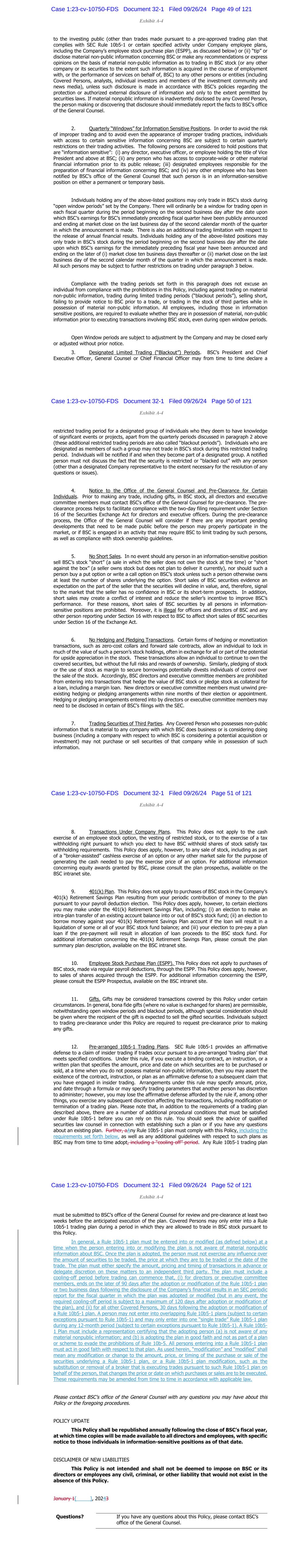 Exhibit A-4 to the investing public (other than trades made pursuant to a pre-approved trading plan that complies with SEC Rule 10b5-1 or certain specified activity under Company employee plans, including the Company’s employee stock purchase plan (ESPP), as discussed below) or (ii) “tip” or disclose material non-public information concerning BSC or make any recommendations or express opinions on the basis of material non-public information as to trading in BSC stock (or any other company or its securities to the extent such information is acquired in the course of employment with, or the performance of services on behalf of, BSC) to any other persons or entities (including Covered Persons, analysts, individual investors and members of the investment community and news media), unless such disclosure is made in accordance with BSC’s policies regarding the protection or authorized external disclosure of information and only to the extent permitted by securities laws. If material nonpublic information is inadvertently disclosed by any Covered Person, the person making or discovering that disclosure should immediately report the facts to BSC’s office of the General Counsel. 2. Quarterly “Windows” for Information Sensitive Positions. In order to avoid the risk of improper trading and to avoid even the appearance of improper trading practices, individuals with access to certain sensitive information concerning BSC are subject to certain quarterly restrictions on their trading activities. The following persons are considered to hold positions that are “information sensitive”: (i) any director, executive officer, or employee holding the title of Vice President and above at BSC; (ii) any person who has access to corporate-wide or other material financial information prior to its public release; (iii) designated employees responsible for the preparation of financial information concerning BSC; and (iv) any other employee who has been notified by BSC’s office of the General Counsel that such person is in an information-sensitive position on either a permanent or temporary basis. Individuals holding any of the above-listed positions may only trade in BSC’s stock during “open window periods” set by the Company. There will ordinarily be a window for trading open in each fiscal quarter during the period beginning on the second business day after the date upon which BSC’s earnings for BSC’s immediately preceding fiscal quarter have been publicly announced and ending at market close on the last business day of the second calendar month of the quarter in which the announcement is made. There is also an additional trading limitation with respect to the release of annual financial results. Individuals holding any of the above-listed positions may only trade in BSC’s stock during the period beginning on the second business day after the date upon which BSC’s earnings for the immediately preceding fiscal year have been announced and ending on the later of (i) market close ten business days thereafter or (ii) market close on the last business day of the second calendar month of the quarter in which the announcement is made. All such persons may be subject to further restrictions on trading under paragraph 3 below. Compliance with the trading periods set forth in this paragraph does not excuse an individual from compliance with the prohibitions in this Policy, including against trading on material non-public information, trading during limited trading periods (“blackout periods”), selling short, failing to provide notice to BSC prior to a trade, or trading in the stock of third parties while in possession of material non-public information. All employees, including those in information sensitive positions, are required to evaluate whether they are in possession of material, non-public information prior to executing transactions involving BSC stock, even during open window periods. Open Window periods are subject to adjustment by the Company and may be closed early or adjusted without prior notice. 3. Designated Limited Trading (“Blackout”) Periods. BSC’s President and Chief Executive Officer, General Counsel or Chief Financial Officer may from time to time declare a Case 1:23-cv-10750-FDS Document 32-1 Filed 09/26/24 Page 49 of 121 Exhibit A-4 restricted trading period for a designated group of individuals who they deem to have knowledge of significant events or projects, apart from the quarterly periods discussed in paragraph 2 above (these additional restricted trading periods are also called “blackout periods”). Individuals who are designated as members of such a group may not trade in BSC’s stock during this restricted trading period. Individuals will be notified if and when they become part of a designated group. A notified person must not discuss the fact that the security is restricted or “blacked out” with any person (other than a designated Company representative to the extent necessary for the resolution of any questions or issues). 4. Notice to the Office of the General Counsel and Pre-Clearance for Certain Individuals. Prior to making any trade, including gifts, in BSC stock, all directors and executive committee members must contact BSC's office of the General Counsel for pre-clearance. The pre- clearance process helps to facilitate compliance with the two-day filing requirement under Section 16 of the Securities Exchange Act for directors and executive officers. During the pre-clearance process, the Office of the General Counsel will consider if there are any important pending developments that need to be made public before the person may properly participate in the market, or if BSC is engaged in an activity that may require BSC to limit trading by such persons, as well as compliance with stock ownership guidelines. 5. No Short Sales. In no event should any person in an information-sensitive position sell BSC’s stock “short” (a sale in w